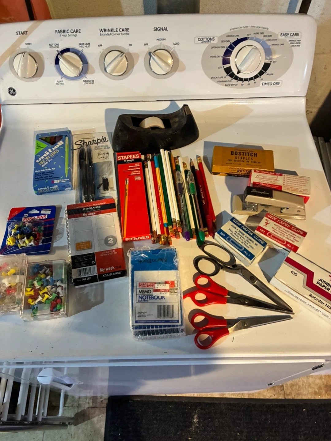 60Clearing out some office supplies! This bundle includes: - Uni-ball Neon Lites - Sharpie Liquid Pencil - Staples pencils - Bostitch staples - Gem paper clips - Push pins - At-A-Glance "My Week" notebook - Scissors Perfect for stocking up your home office or classroom!