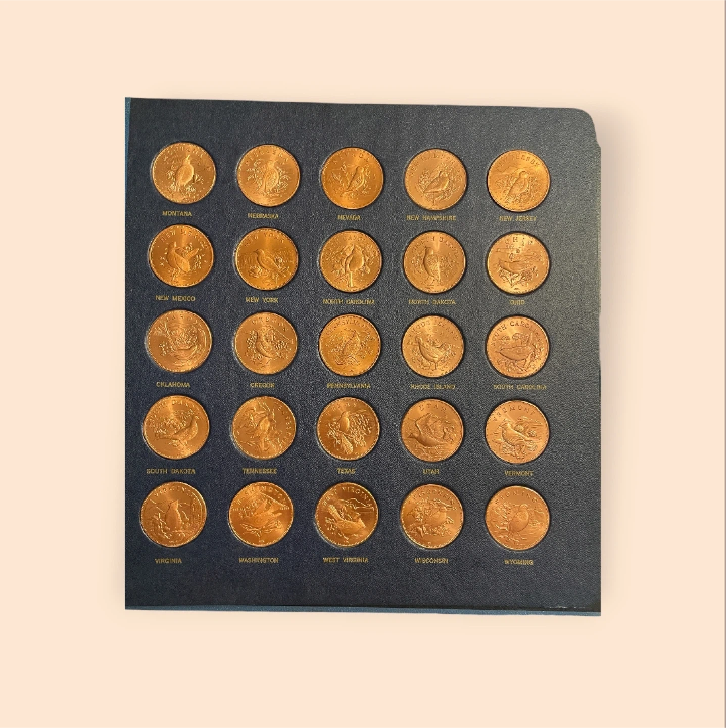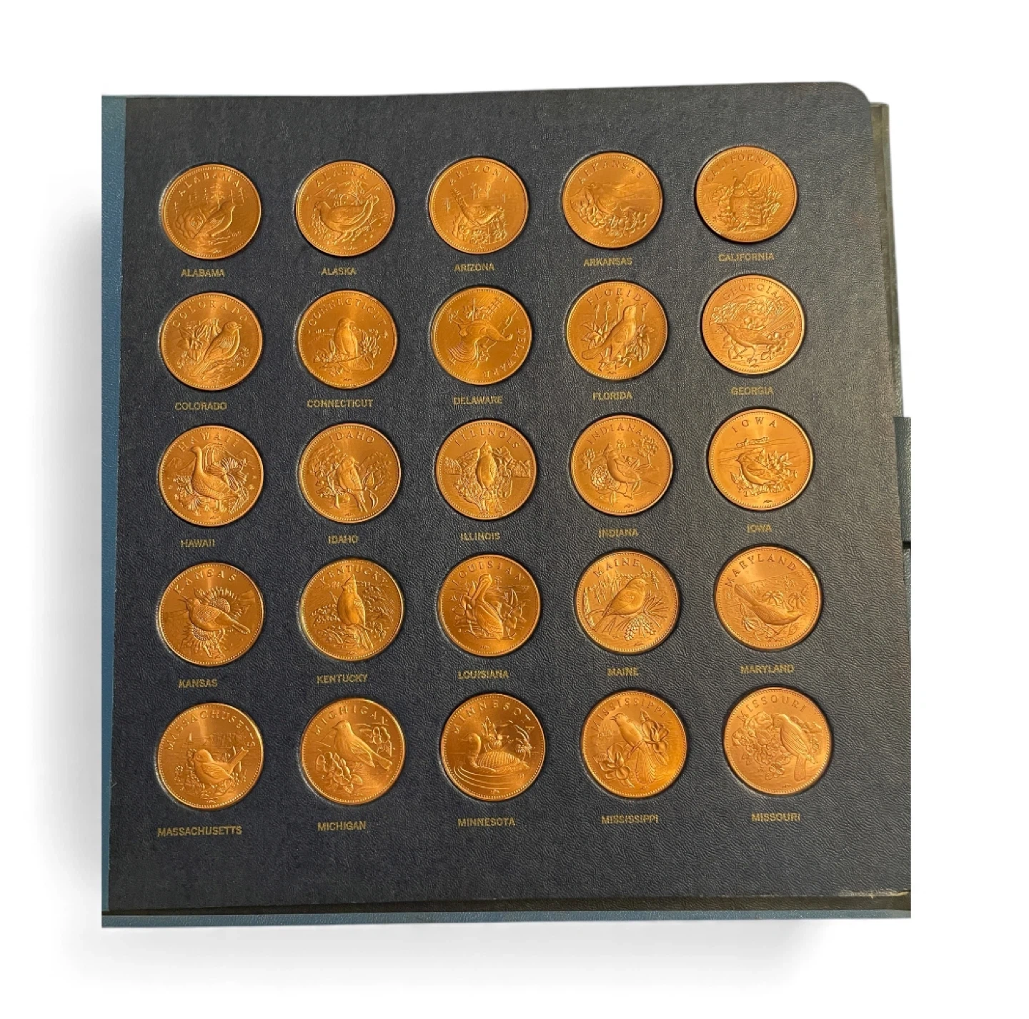 23This is a "First Edition Official Wildlife of the United States" copper mint set from 1974, produced by the Mount Everest Mint. It is a commemorative coin set featuring various wildlife from the 50 states. The set contains copper coins or medals. The coins feature various birds representing the 50 states. The set is often found for sale on auction sites like eBay. Similar sets have been sold at auction between $299.00/ $699.00 Will meet at the Police Dept. in Addison. Cash only.