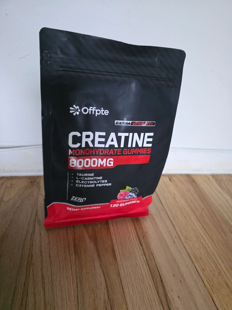 Selling a bag of Offpte Creatine Monohydrate Gummies with extra strength! Each gummy contains 8000MG of creatine, plus taurine, l-carnitine, electrolytes, and cayenne pepper. It's a zero-sugar dietary supplement with 120 gummies in a mixed-berry flavor