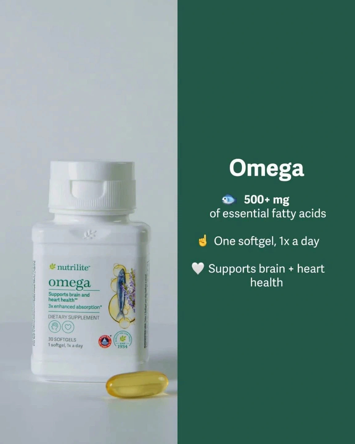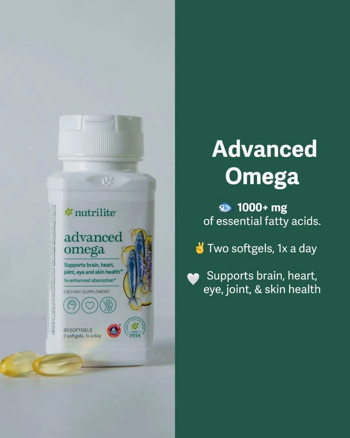 Advanced Omega softgels provide 1000+ mg of essential fatty acids. Supports brain, heart, eye, joint, and skin health. Two softgels taken once daily.