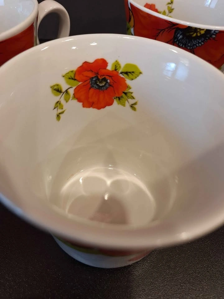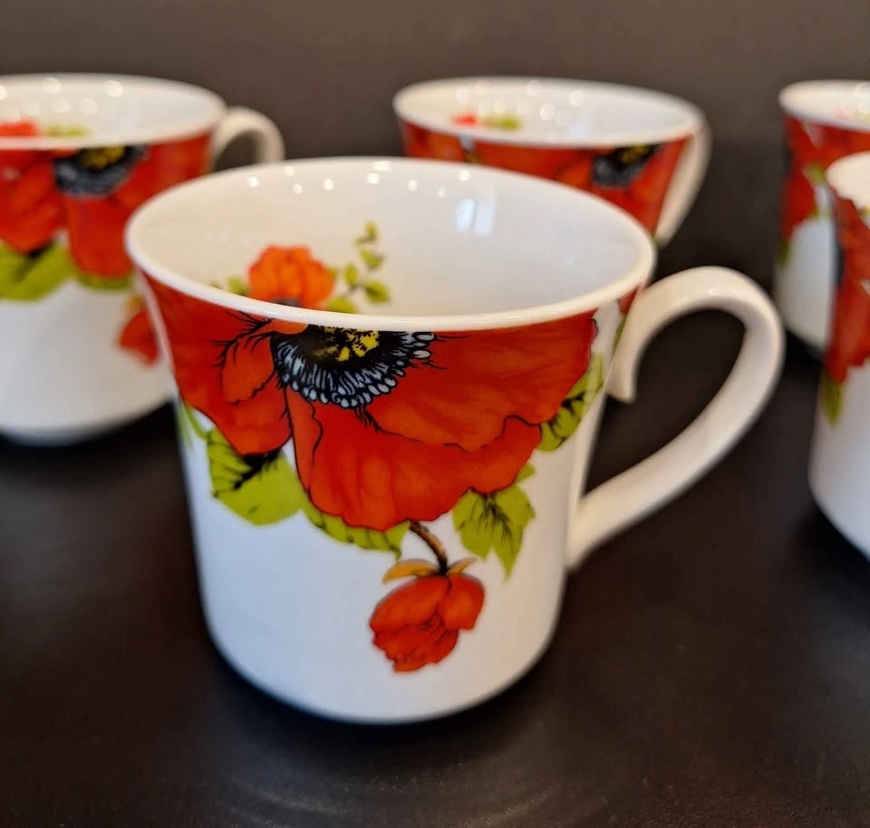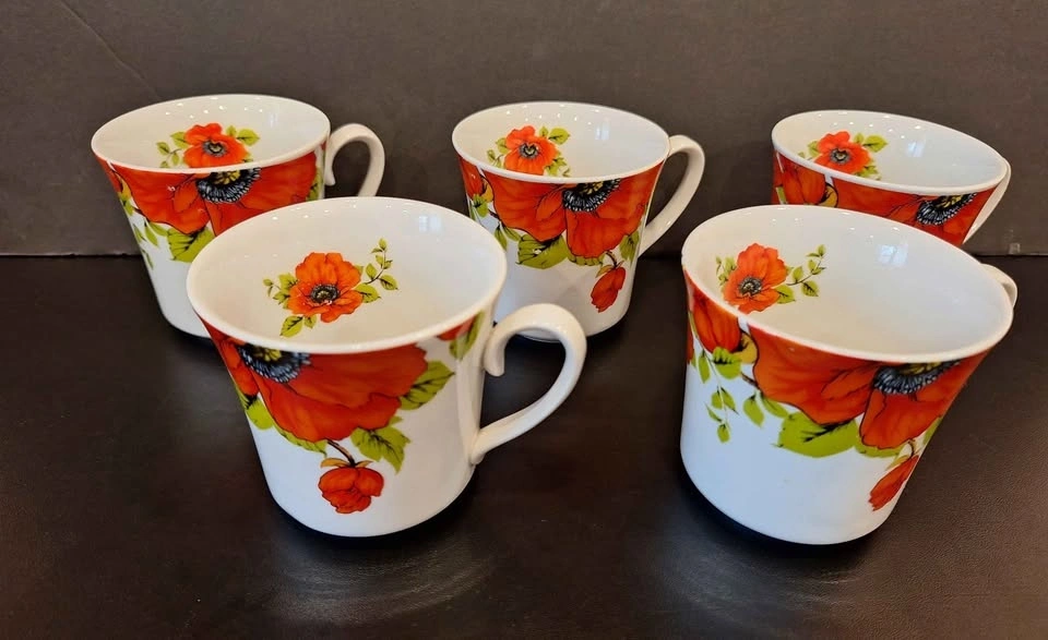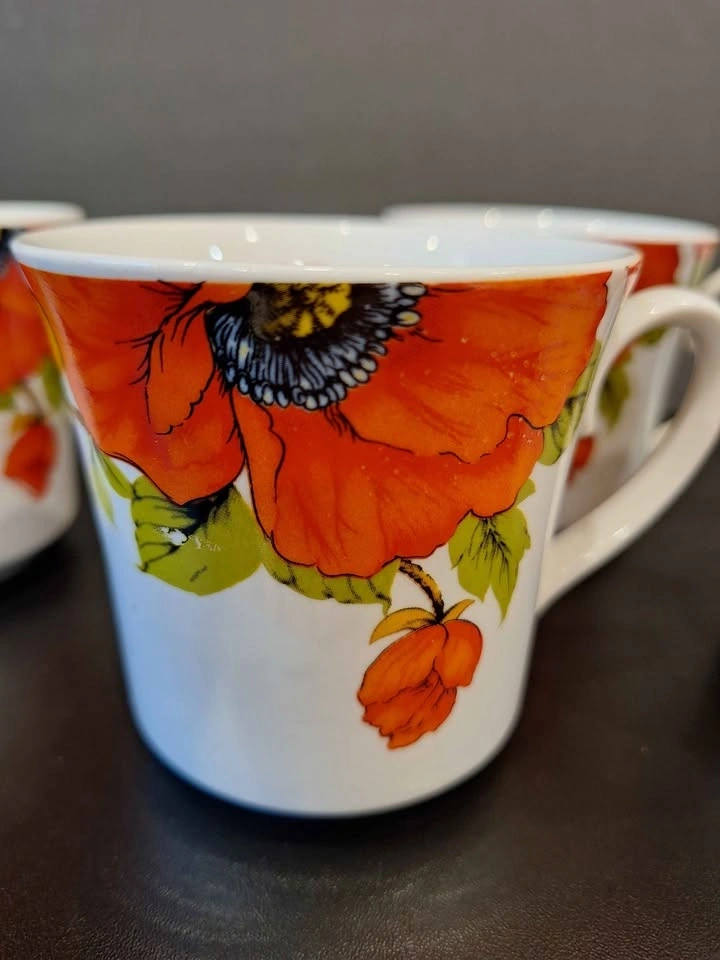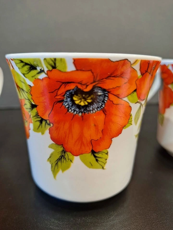 In very good condition, 5 mugs with a poppy flower design. The poppy flower is also visible inside the cup. Each cup holds 200 ml.