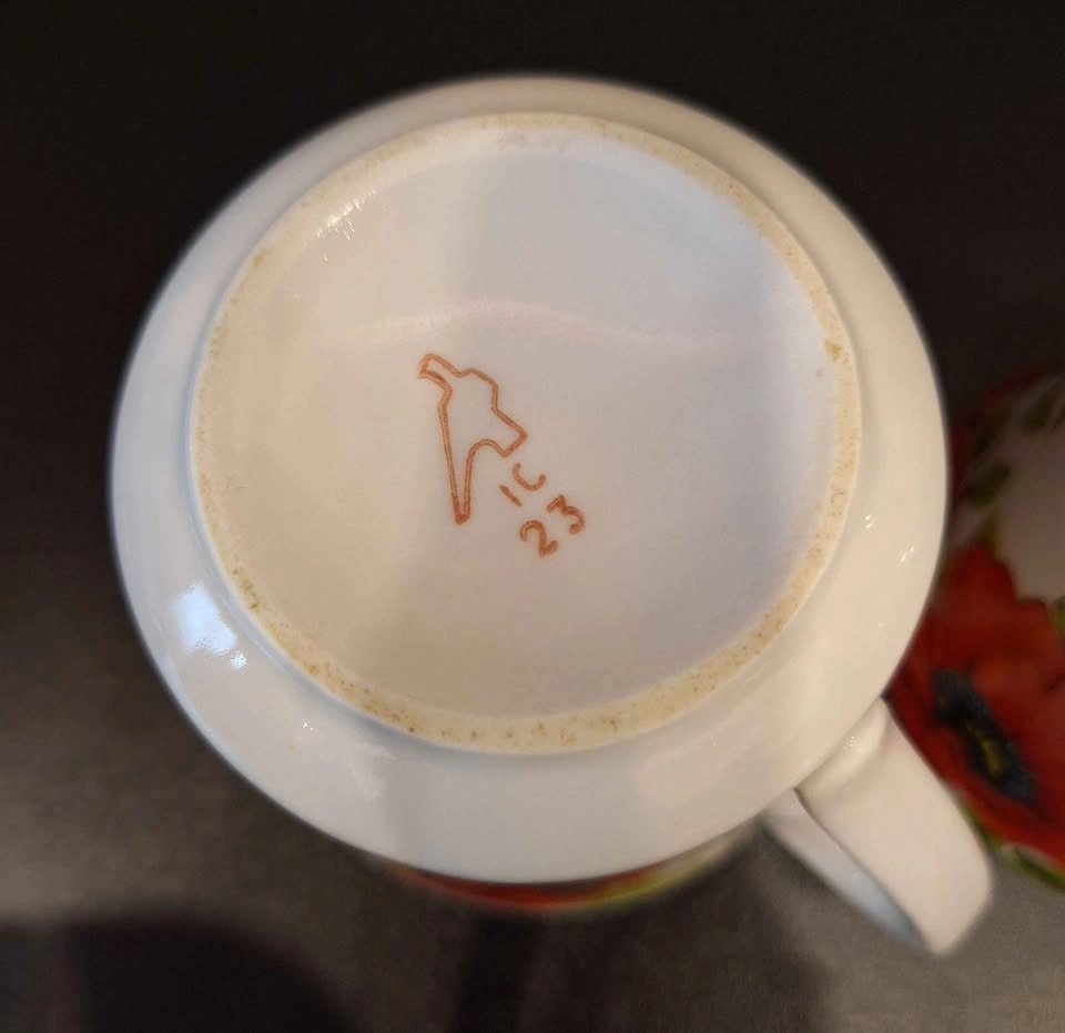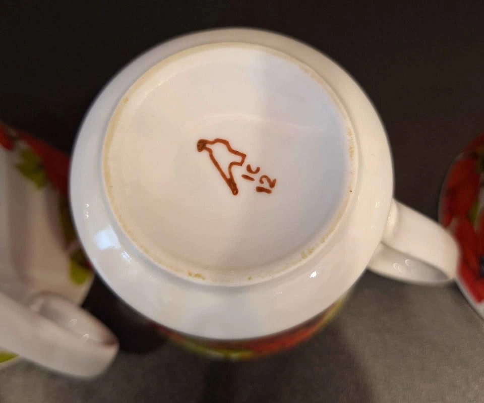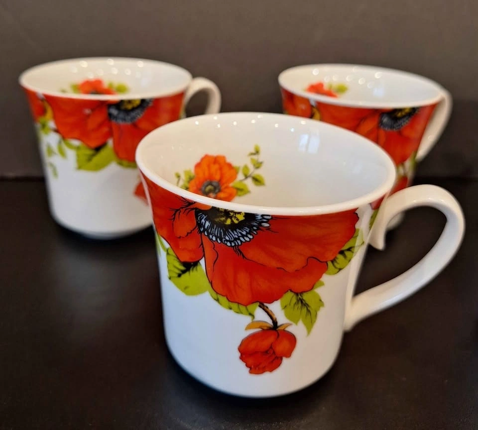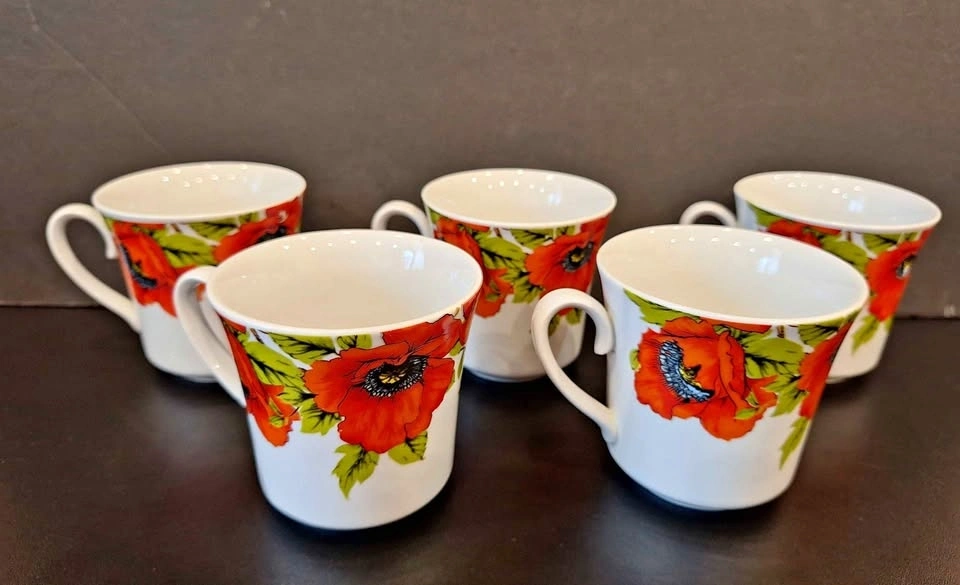 In very good condition, 5 mugs with a poppy flower design. The poppy flower is also visible inside the cup. Each cup holds 200 ml.