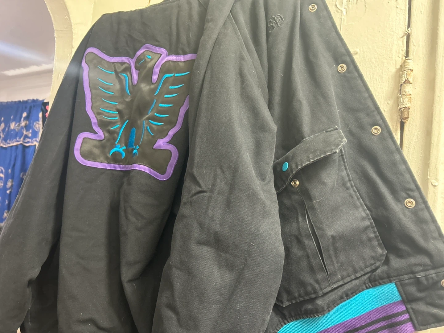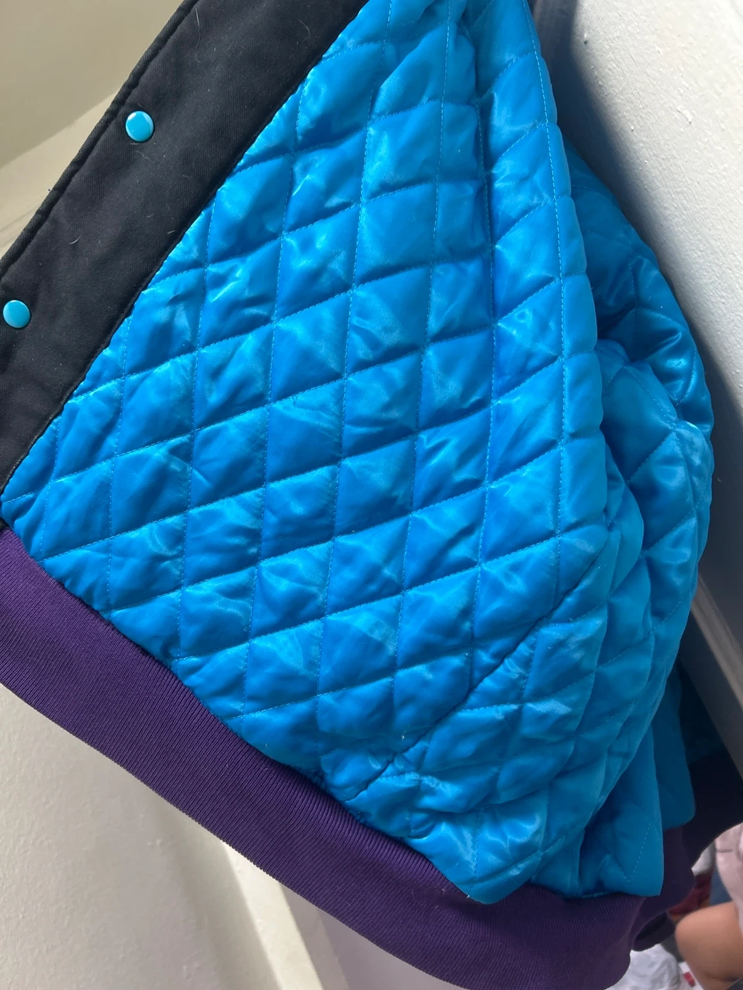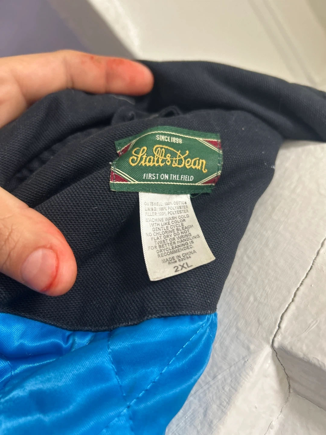 Selling a stylish L.L. Bean jacket in size 2XL! It's black with a vibrant blue quilted lining and a cool purple and blue eagle design on the back. A unique and eye-catching piece!