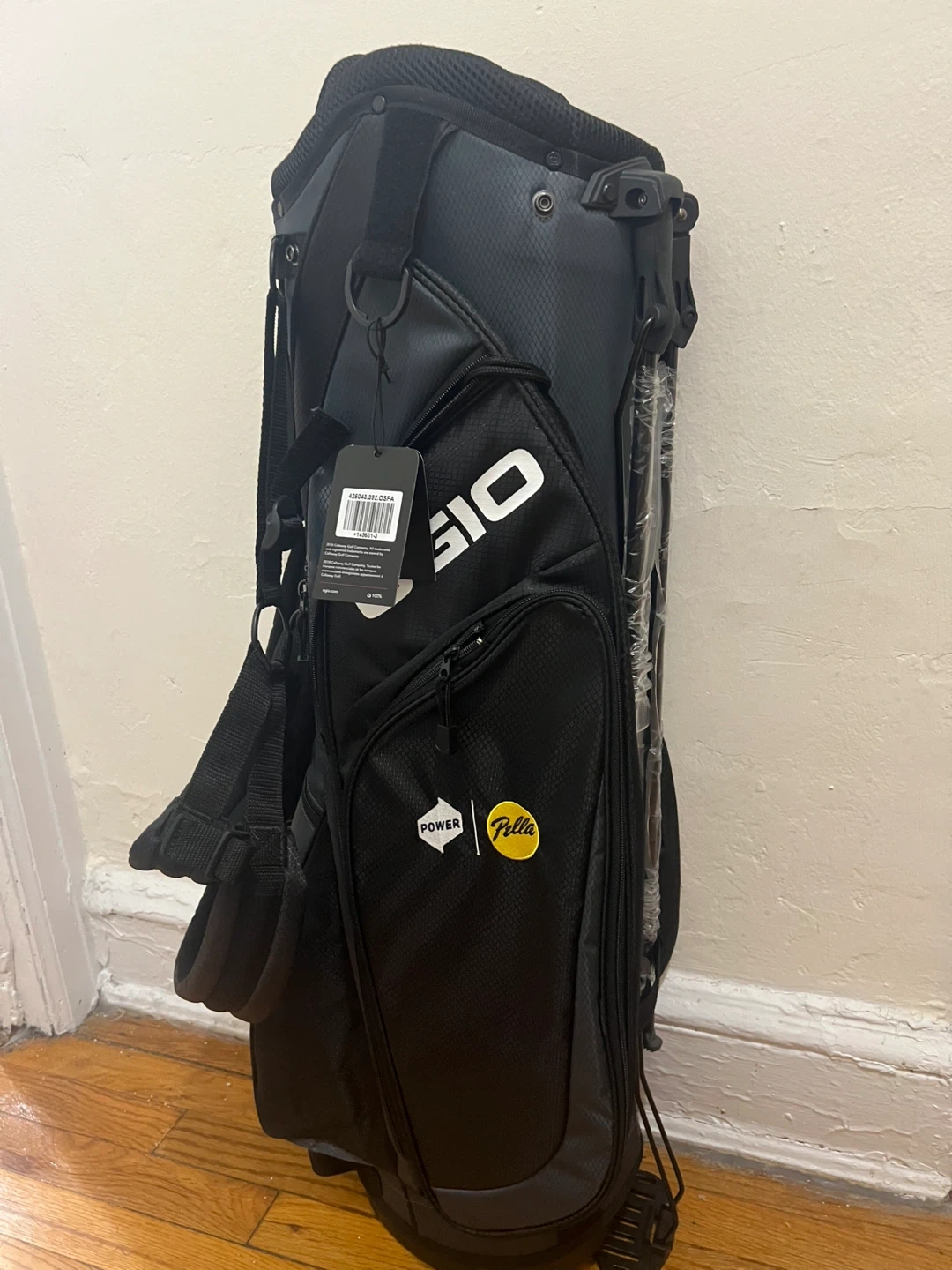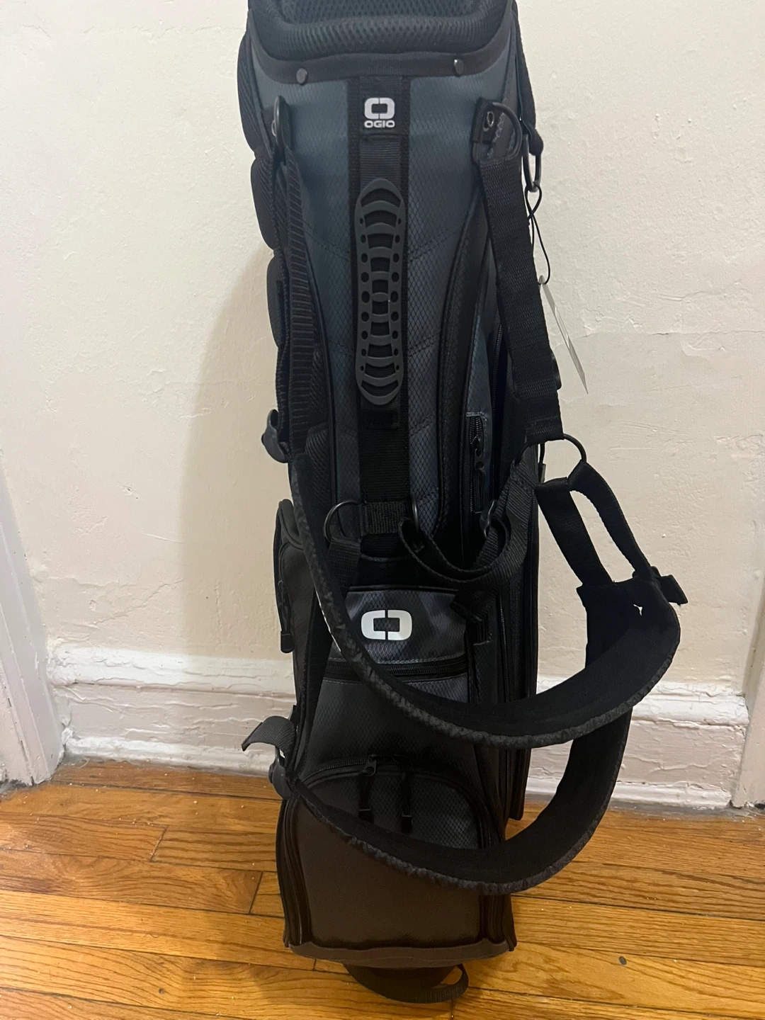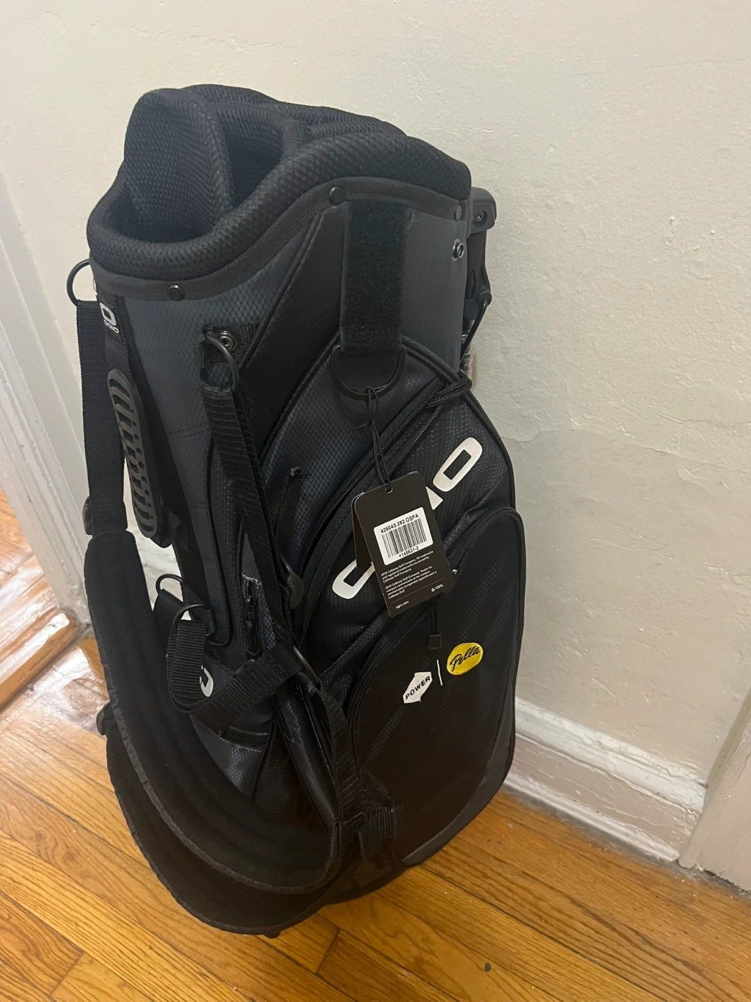 I'm selling an OGIO Power Fella golf bag in black and gray. It's in great condition brand new never used and ready for the course! It features the OGIO logo prominently and also has a Power Fella logo. Perfect for carrying your clubs and gear comfortably