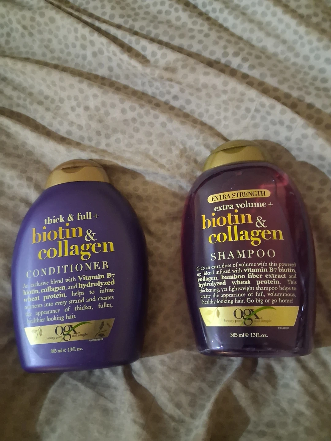70I'm selling a set of OGX shampoo and conditioner. Both are the Biotin & Collagen type, designed to give your hair extra volume and thickness. Each bottle contains 385 ml (13 fl oz) of product. Perfect for achieving fuller, healthier-looking hair!