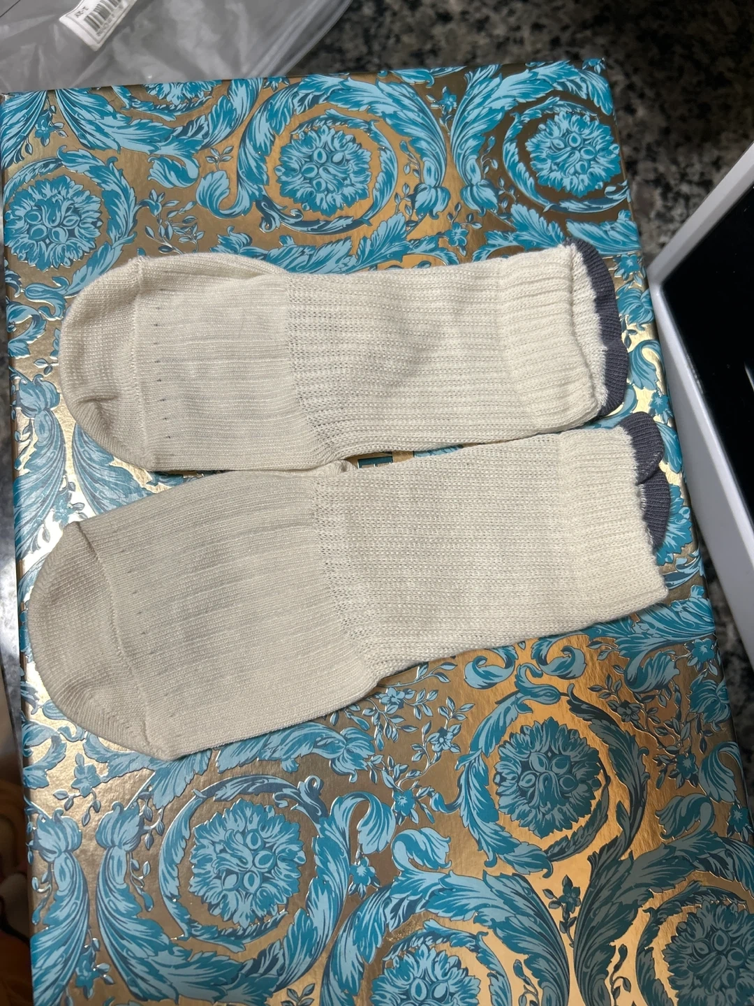 47Here are some cute baby socks! They are white with gray accents and have anti-slip grips on the bottom to help your little one stay safe while they explore. The grips are patterned with the words 'oh baby' surrounded by triangles and circles. π₯π₯π₯ π₯