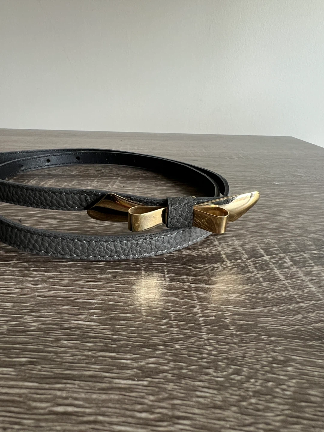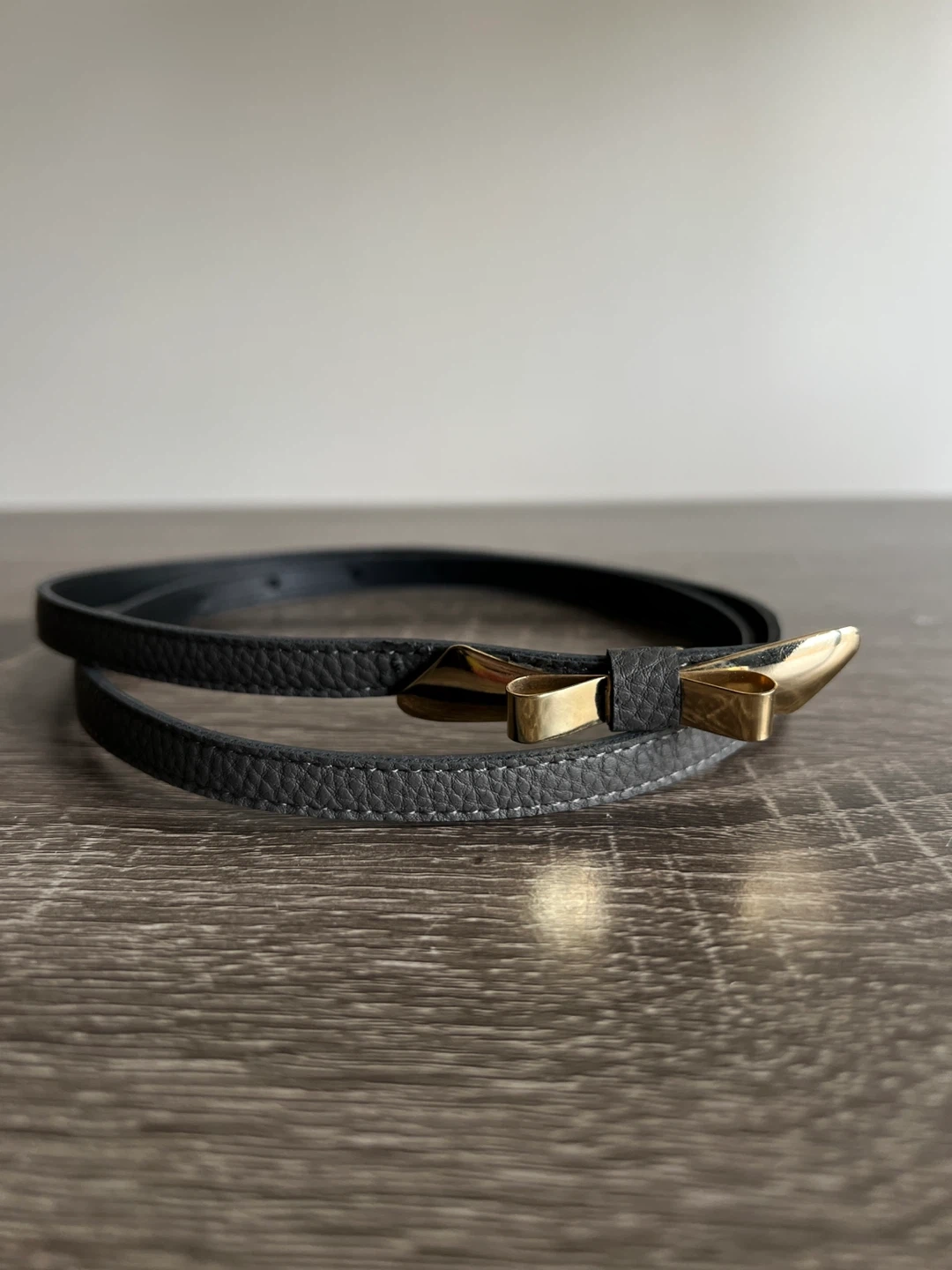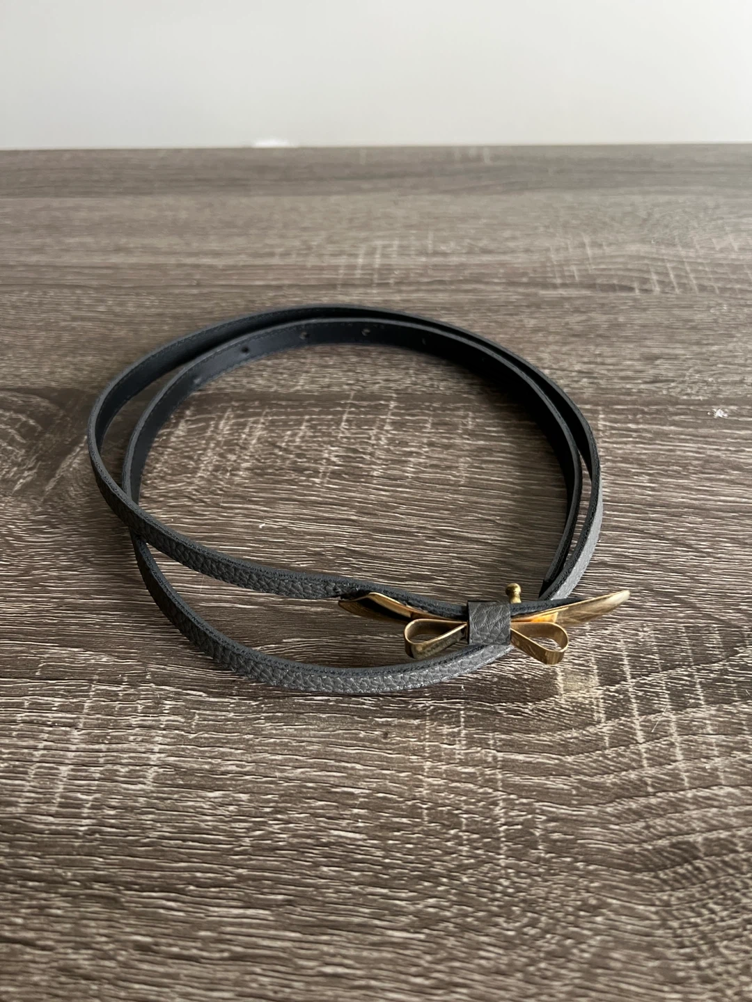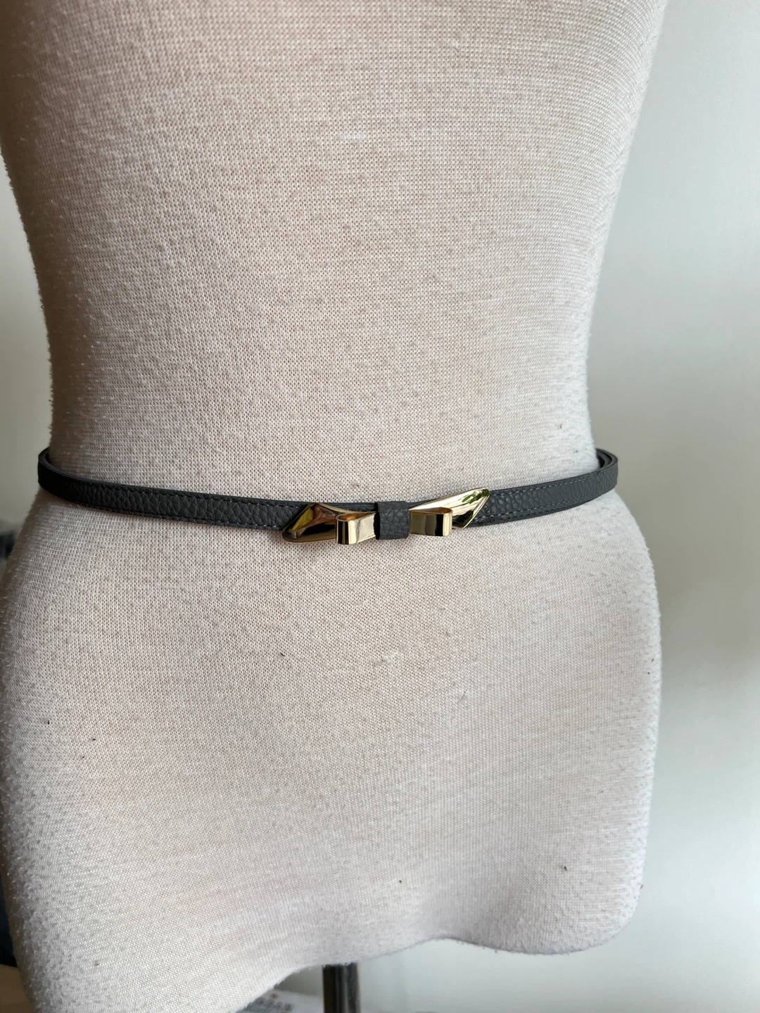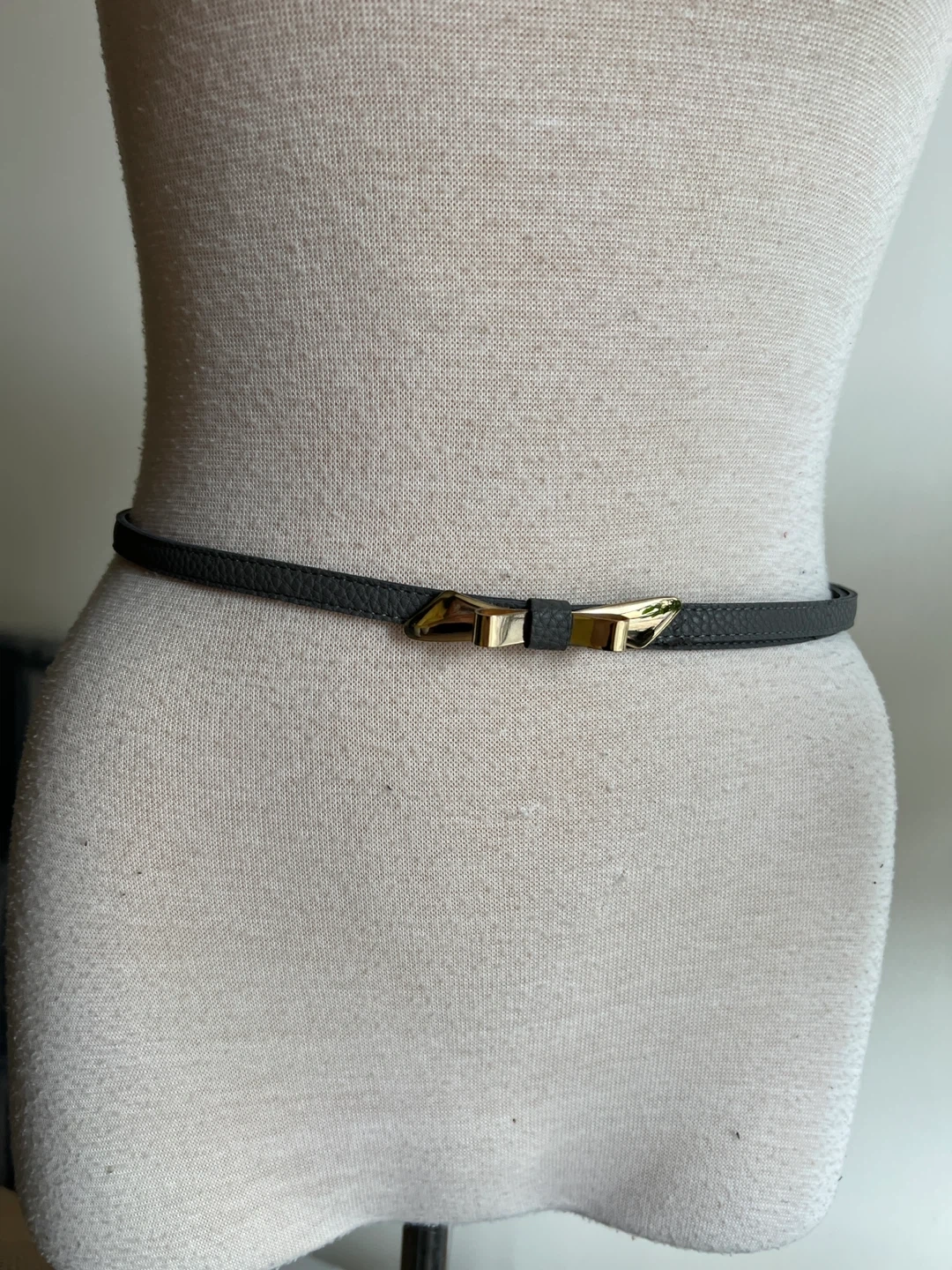 This thin belt is made of grey faux leather and features a gold-toned bow-shaped buckle. It's a stylish accessory to cinch dresses or blouses. Size small.