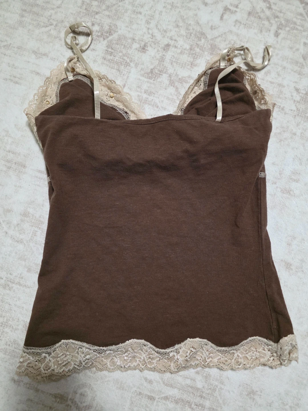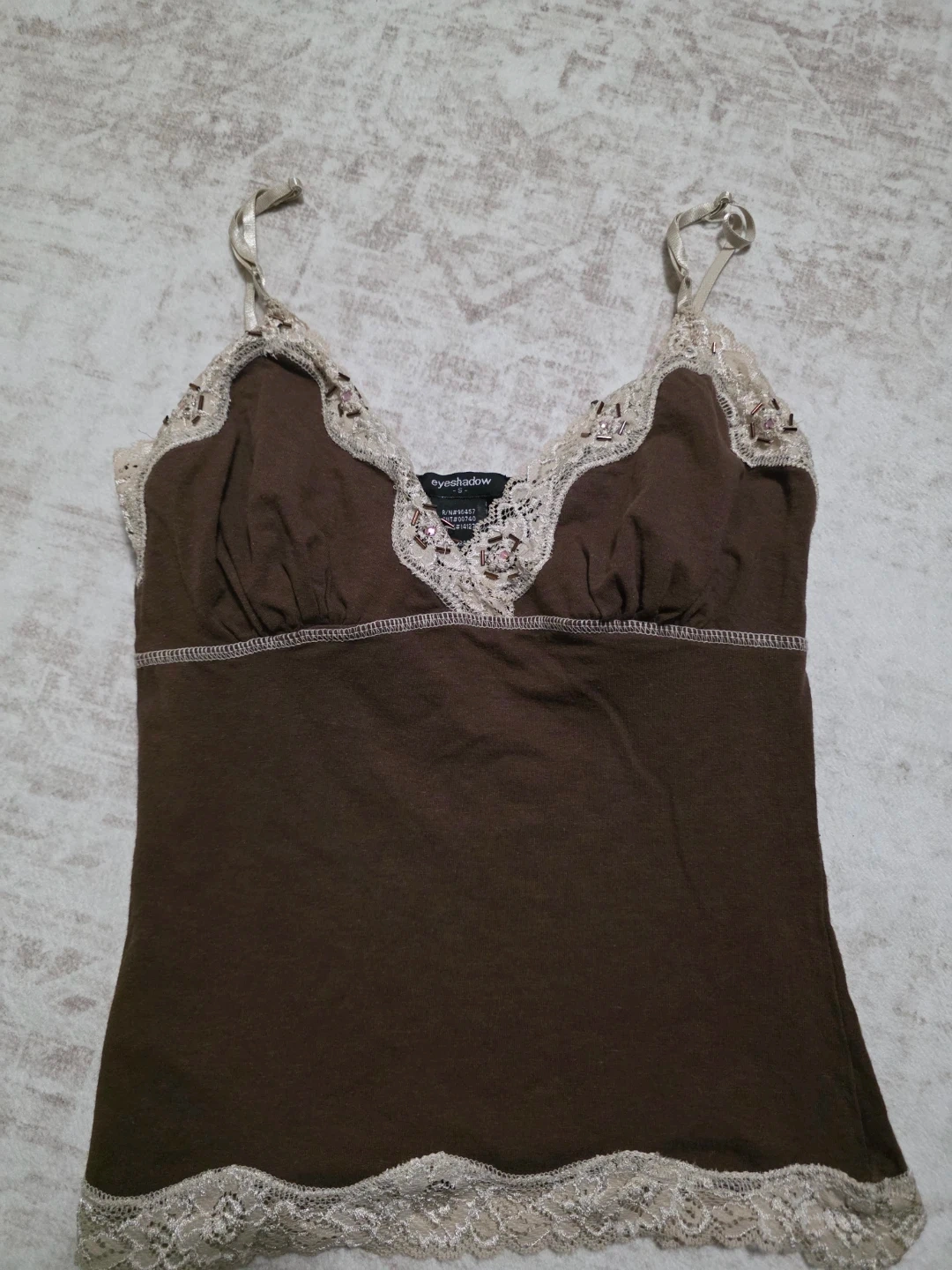 This brown camisole features delicate lace trim along the neckline and hem. It has adjustable spaghetti straps and a comfortable fit. Made from soft fabric.
