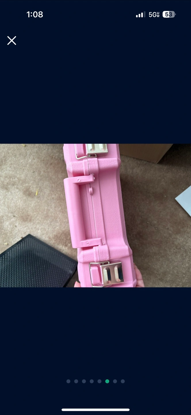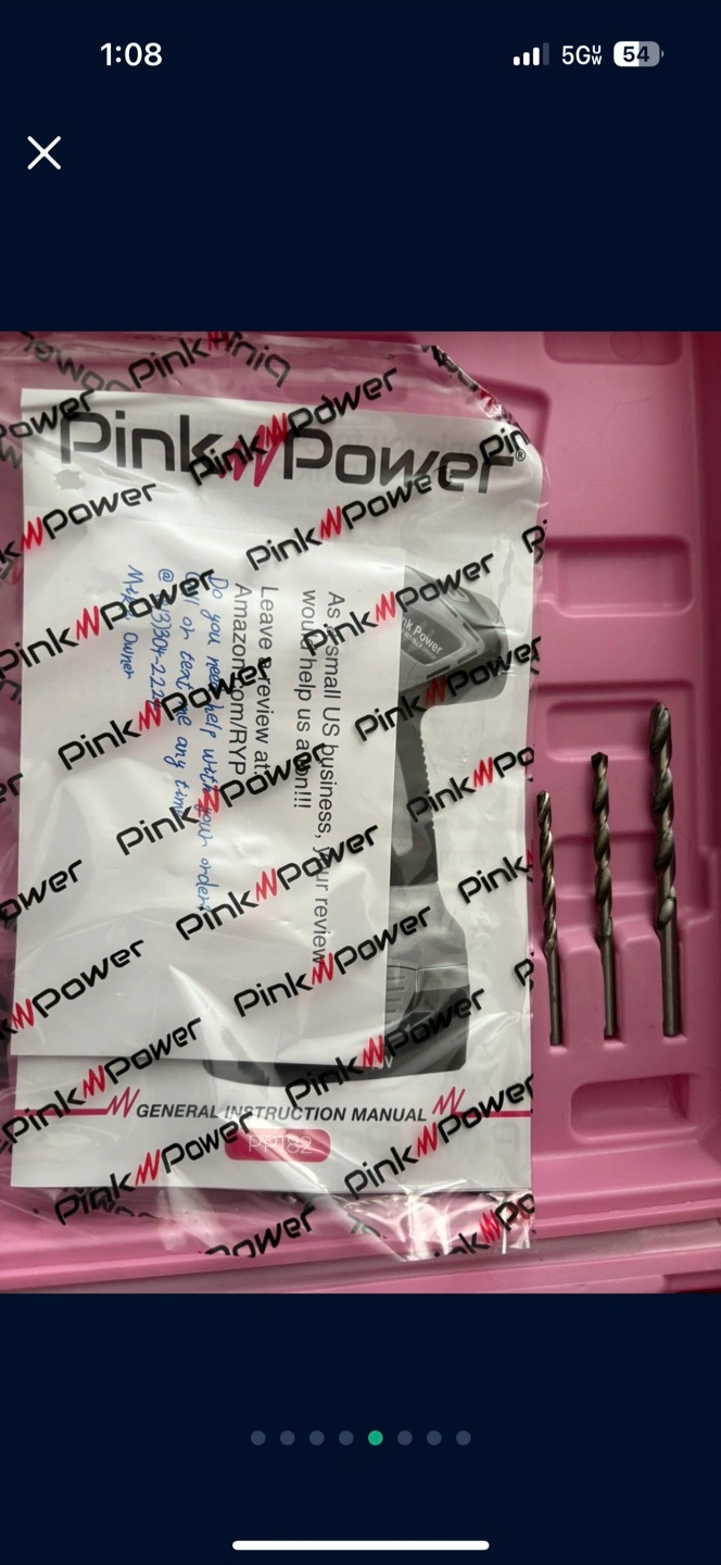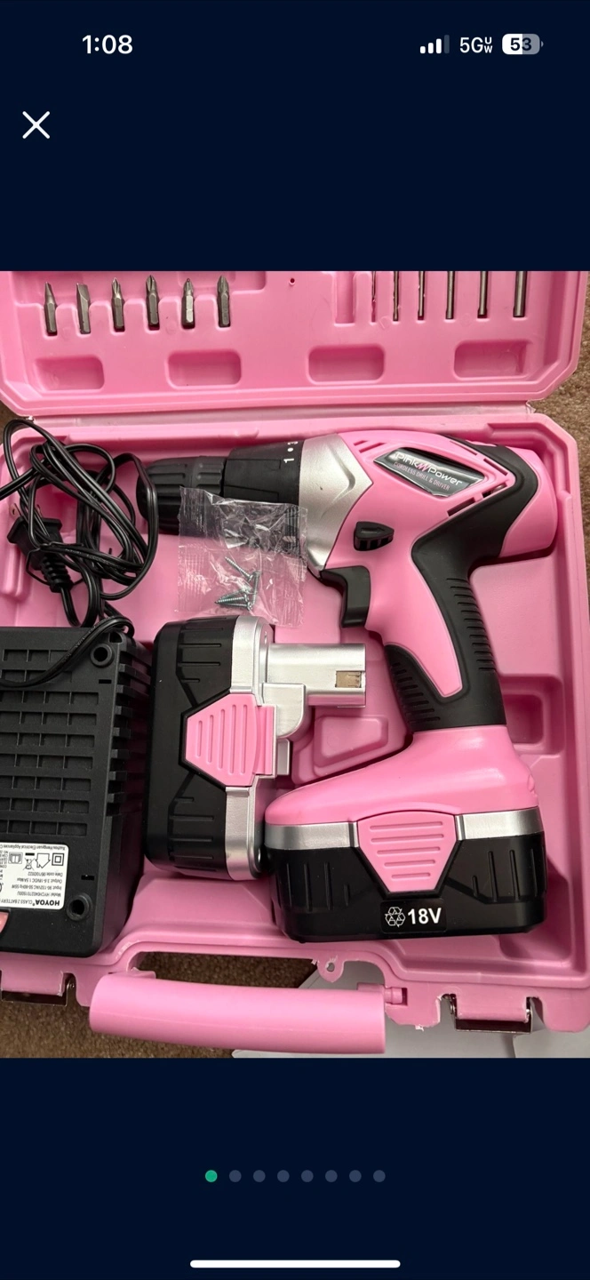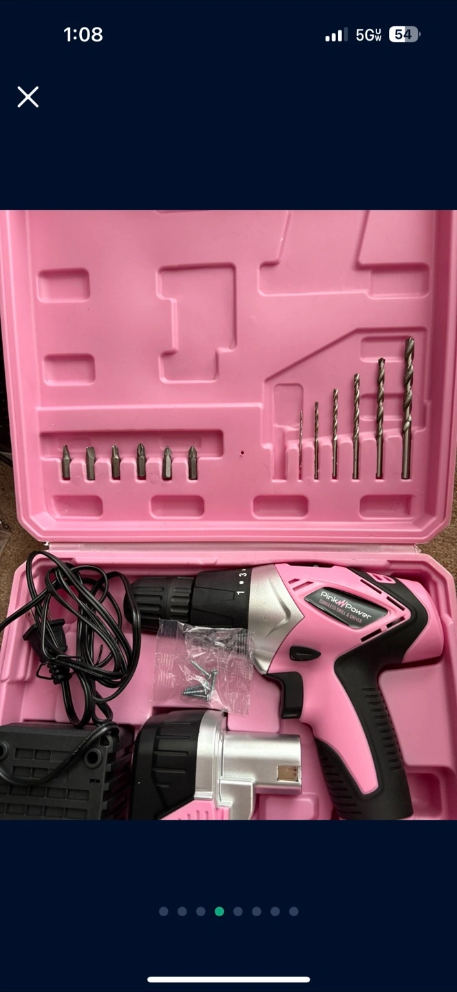 A pink drill, neatly organized inside a matching pink case. Set includes different drill bits and other tools. You will find that working on home projects can be a lot less stressful with this in hand.Brand new in box