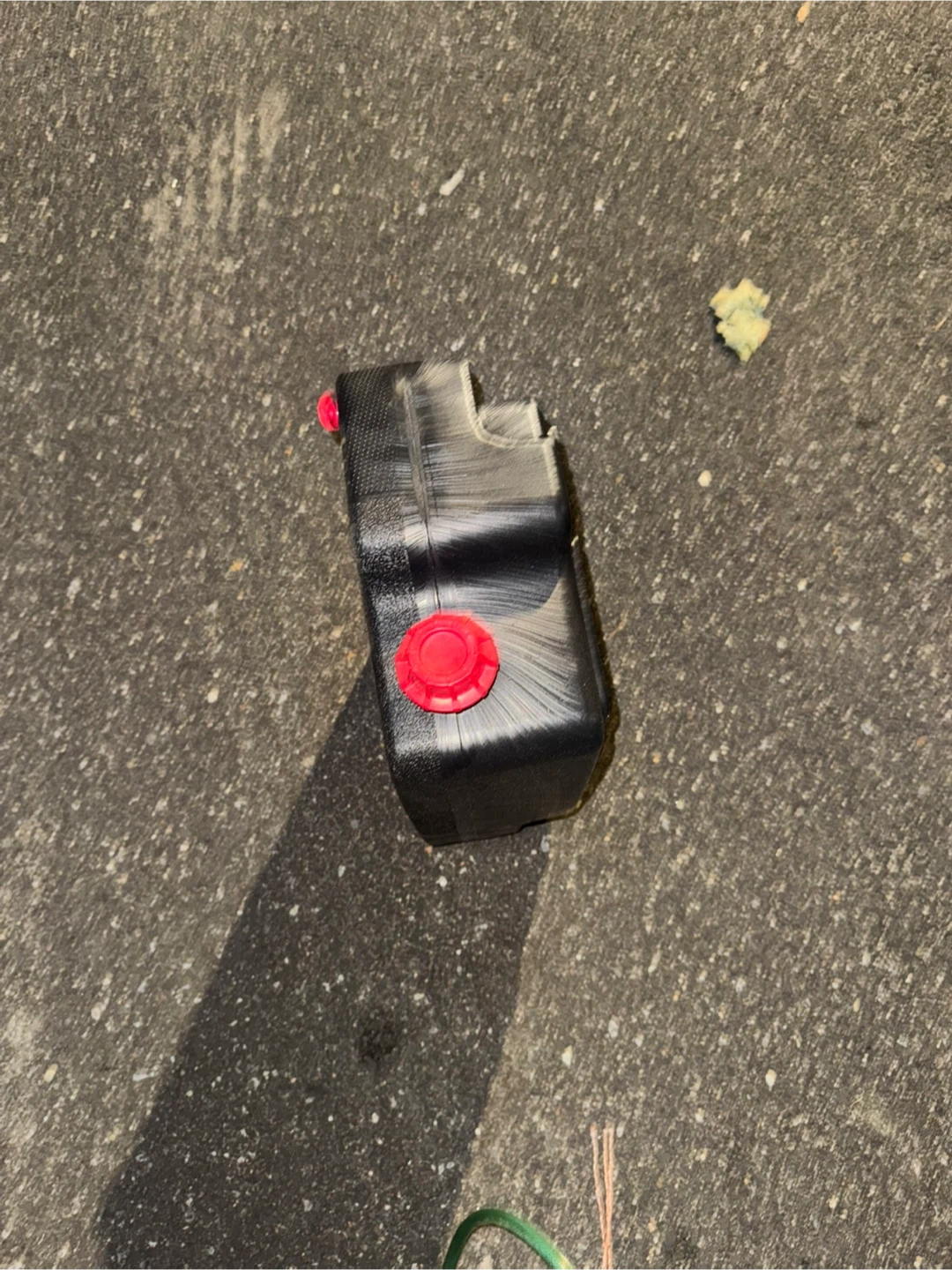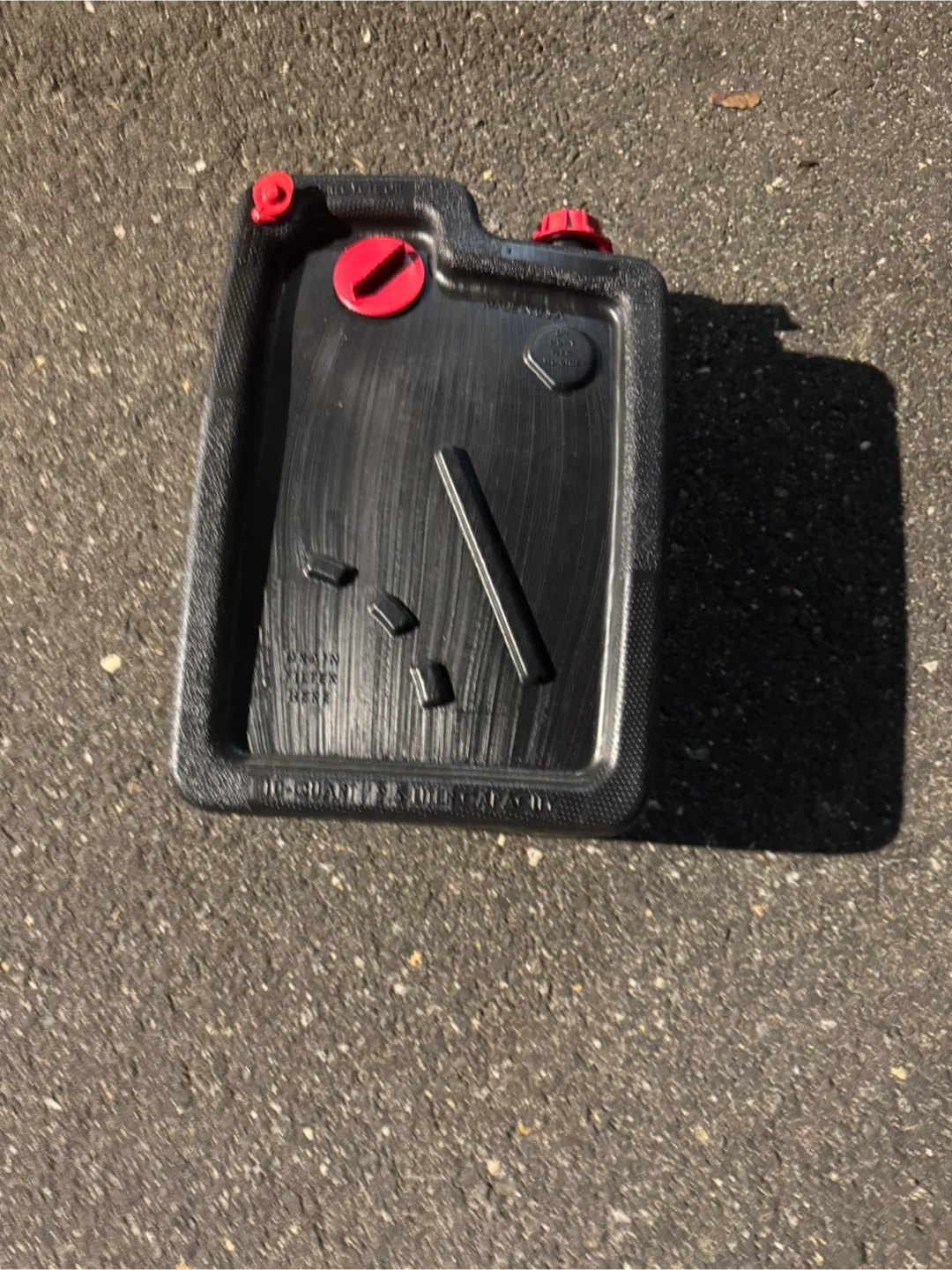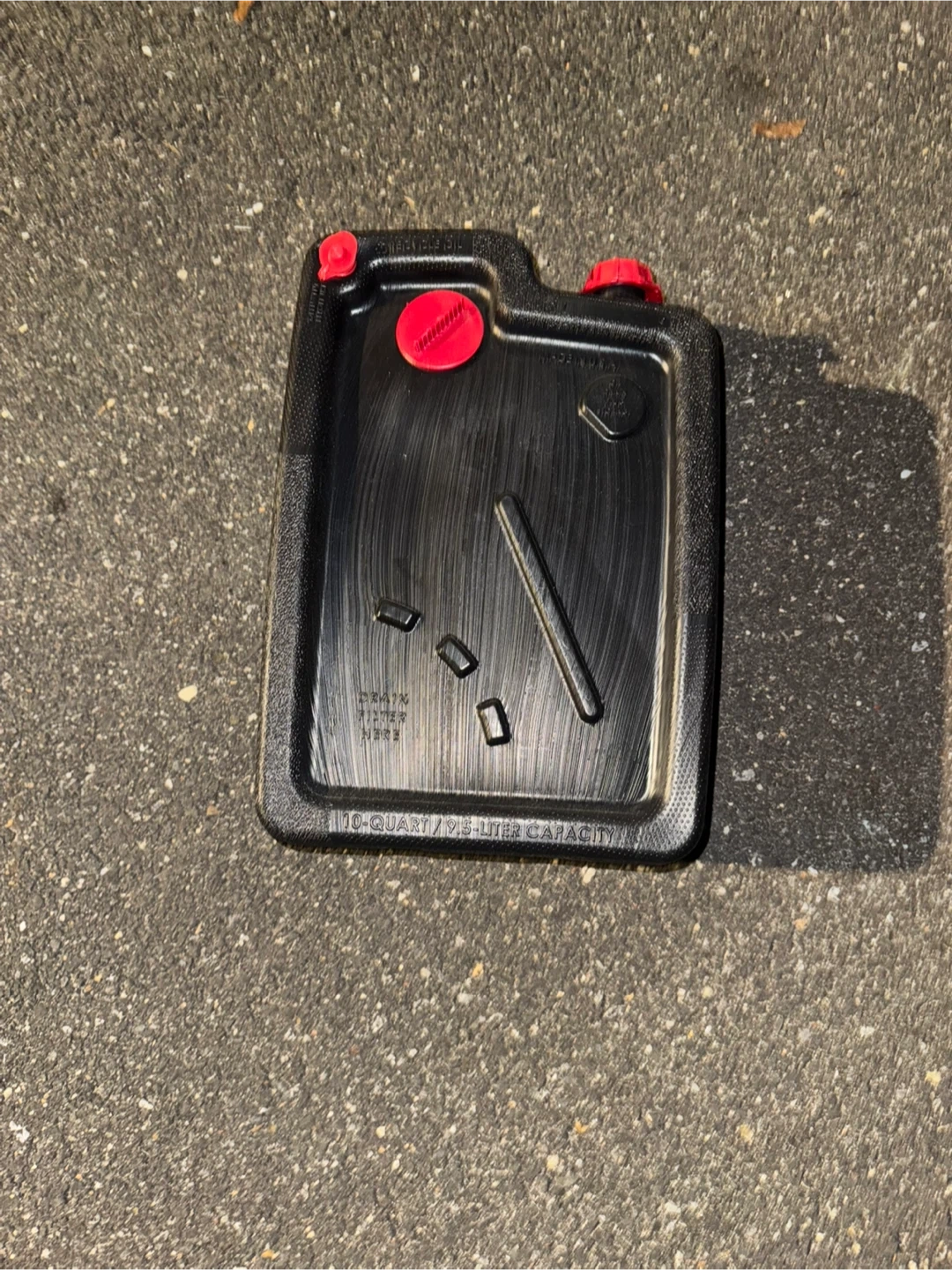 Selling an oil drain pan with a capacity of 11.6 quarts or 11 liters. It's black with red caps and appears to be in good condition. Perfect for your next oil change!