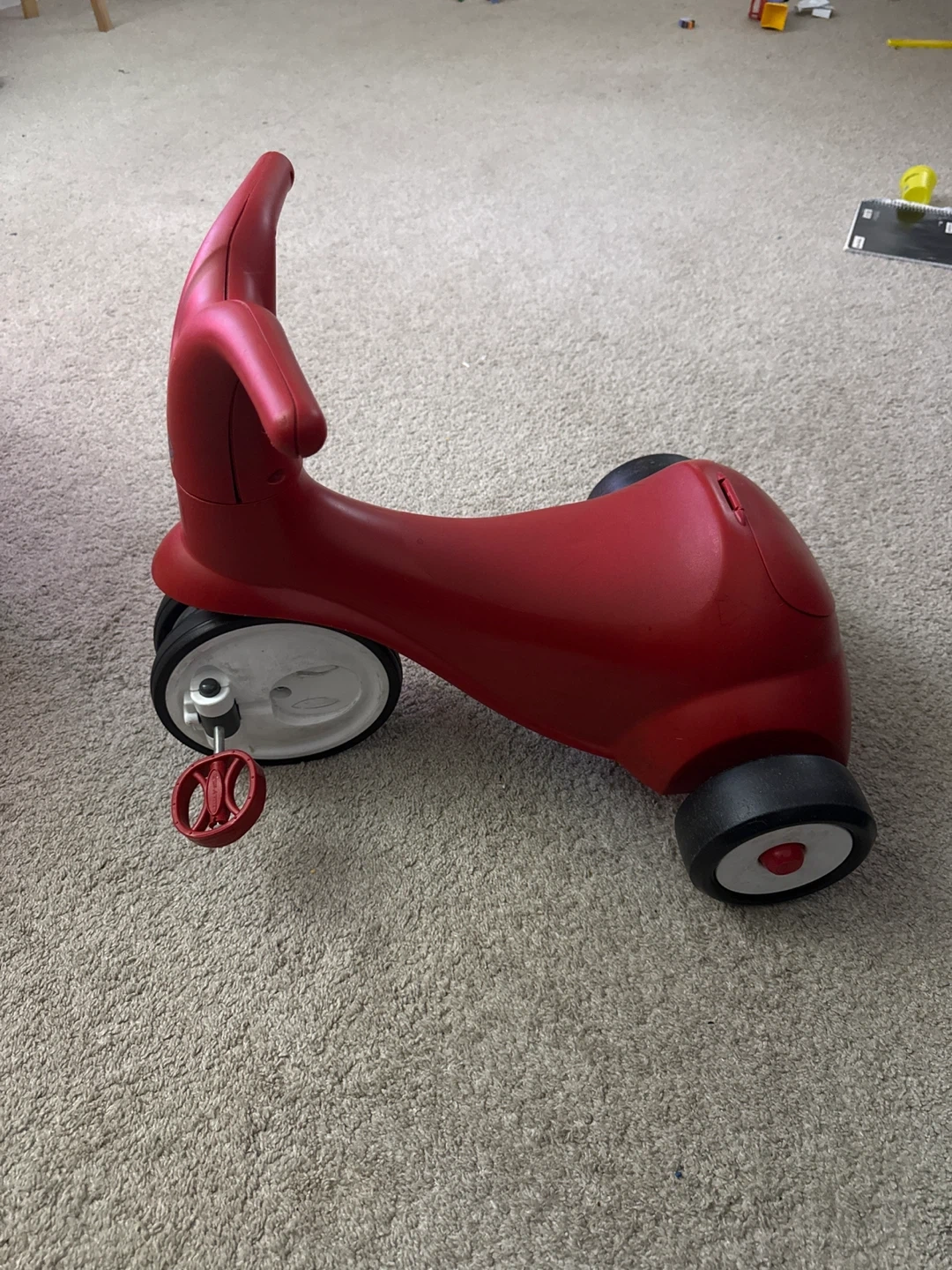 This is a red Radio Flyer ride-on toy car. It features a steering wheel and pedals for easy maneuvering. This toy is designed for active play and is made of durable plastic.