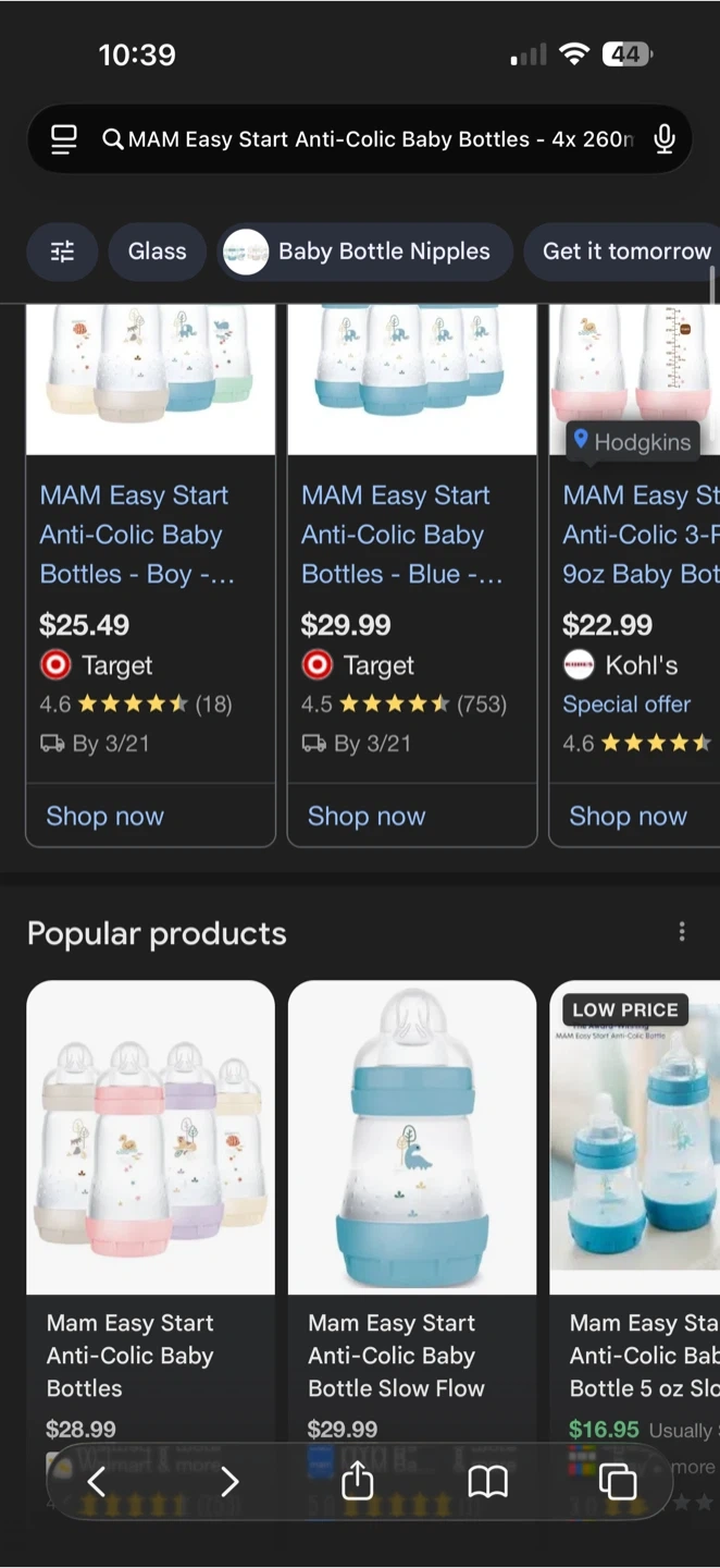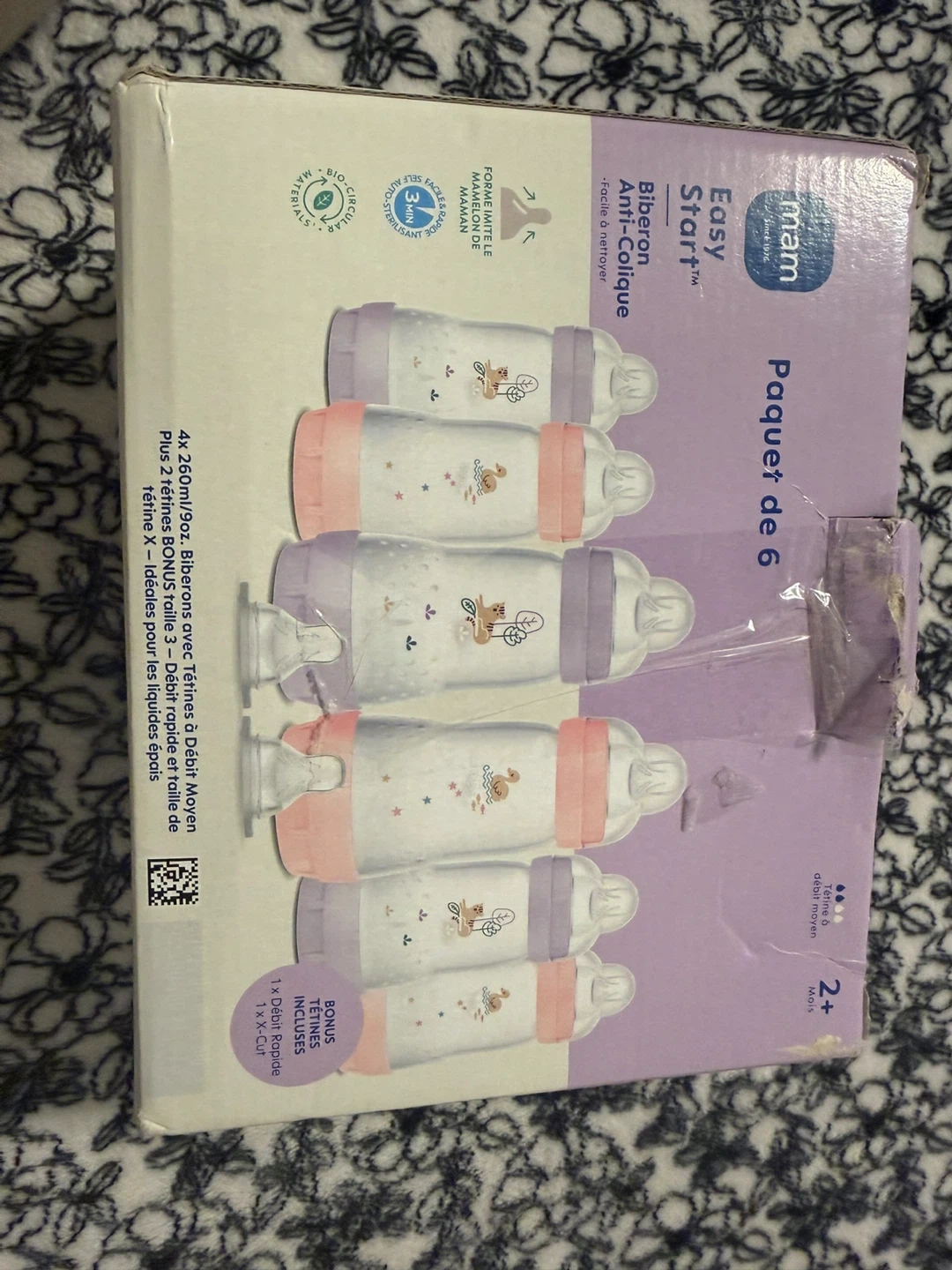 This is a pack of 6 MAM Easy Start Anti-Colic baby bottles. Each bottle is 260ml/9oz and designed for babies 2+ months. They come with anti-colic features to help reduce air intake.