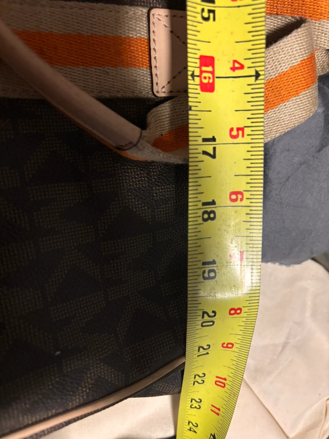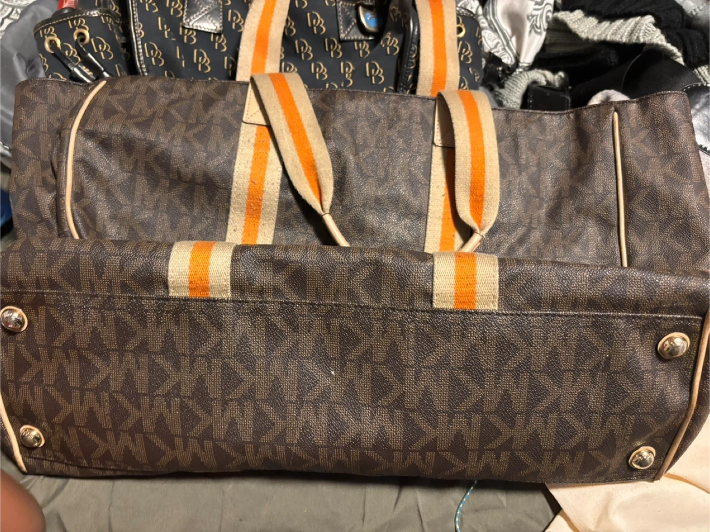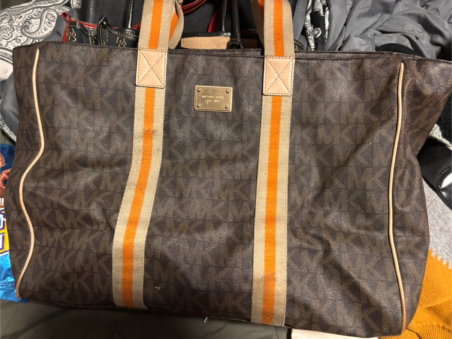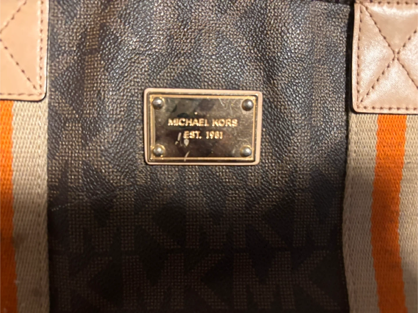 This Michael Kors tote bag features the brand's signature brown monogram pattern. It has tan leather accents and striped canvas straps in beige and orange.