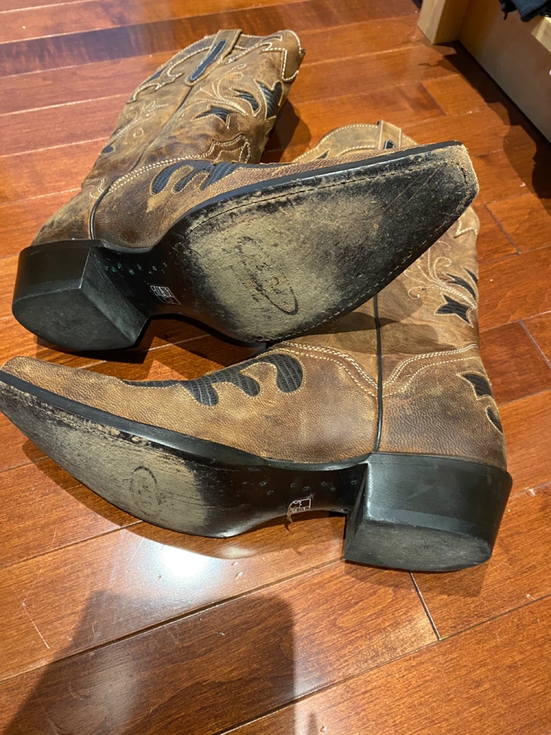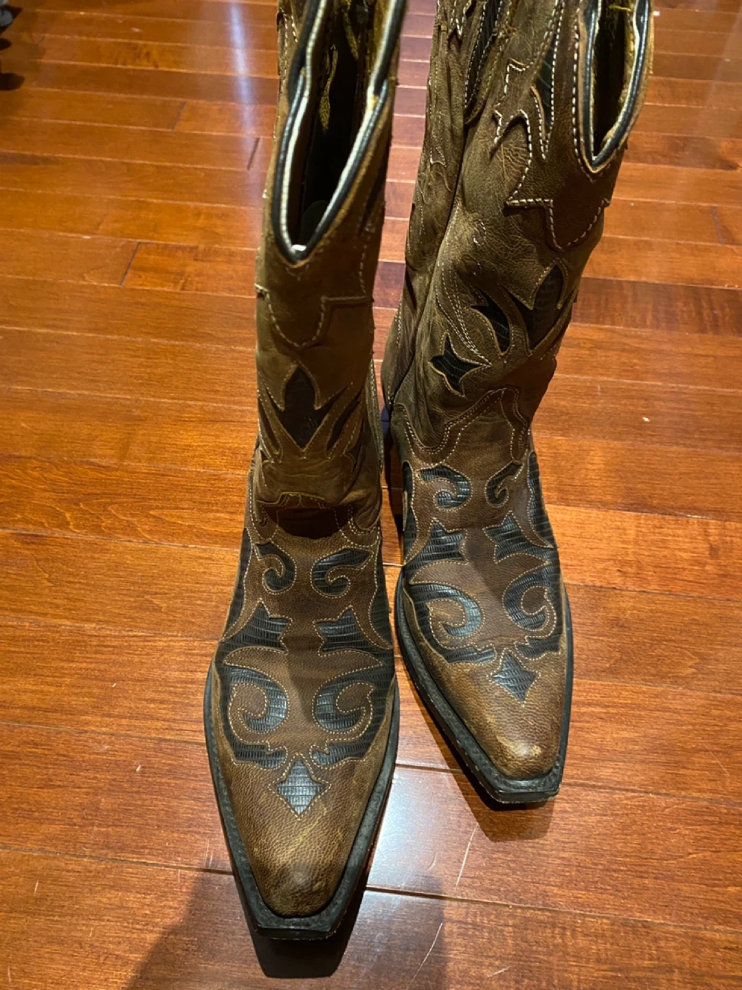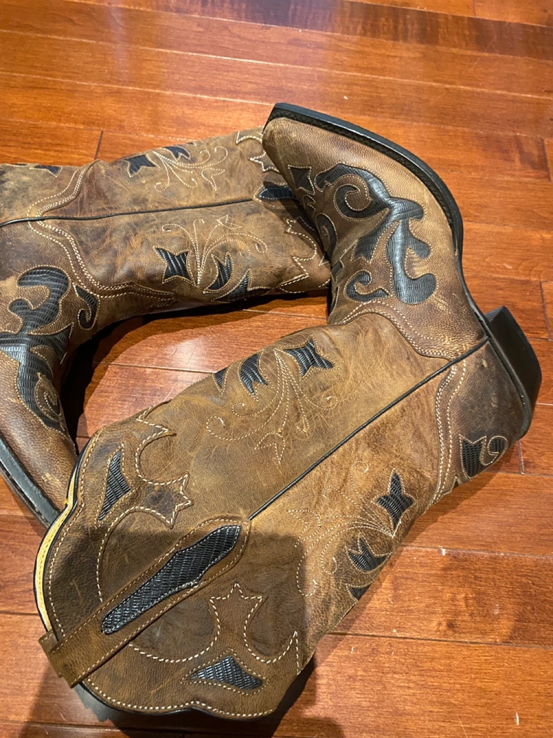 These are brown leather western cowboy boots with detailed stitching and a pointed toe. They have a block heel and pull-on tabs. Perfect for rodeos or country concerts! Made in Mexico. Genuine Goat