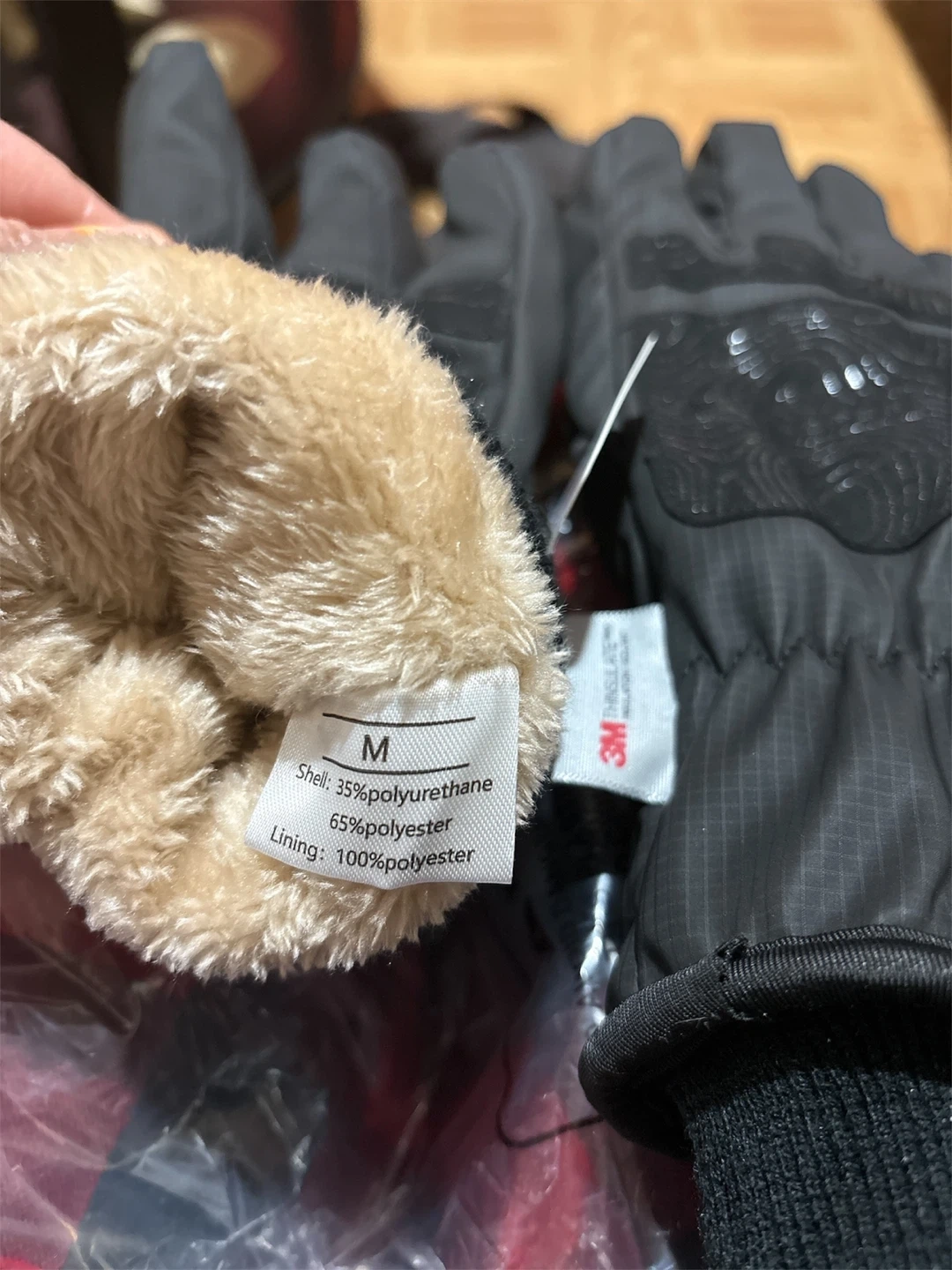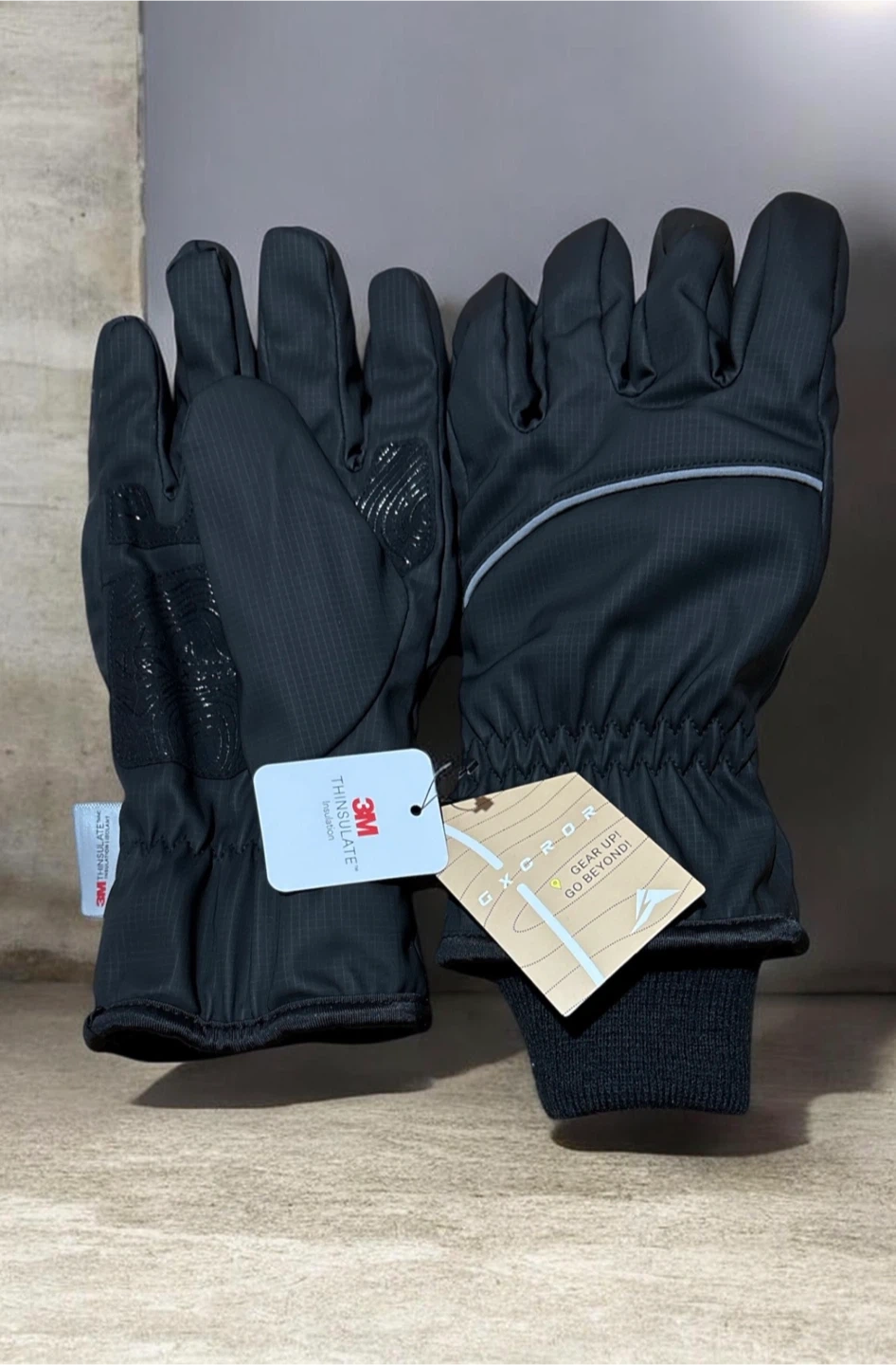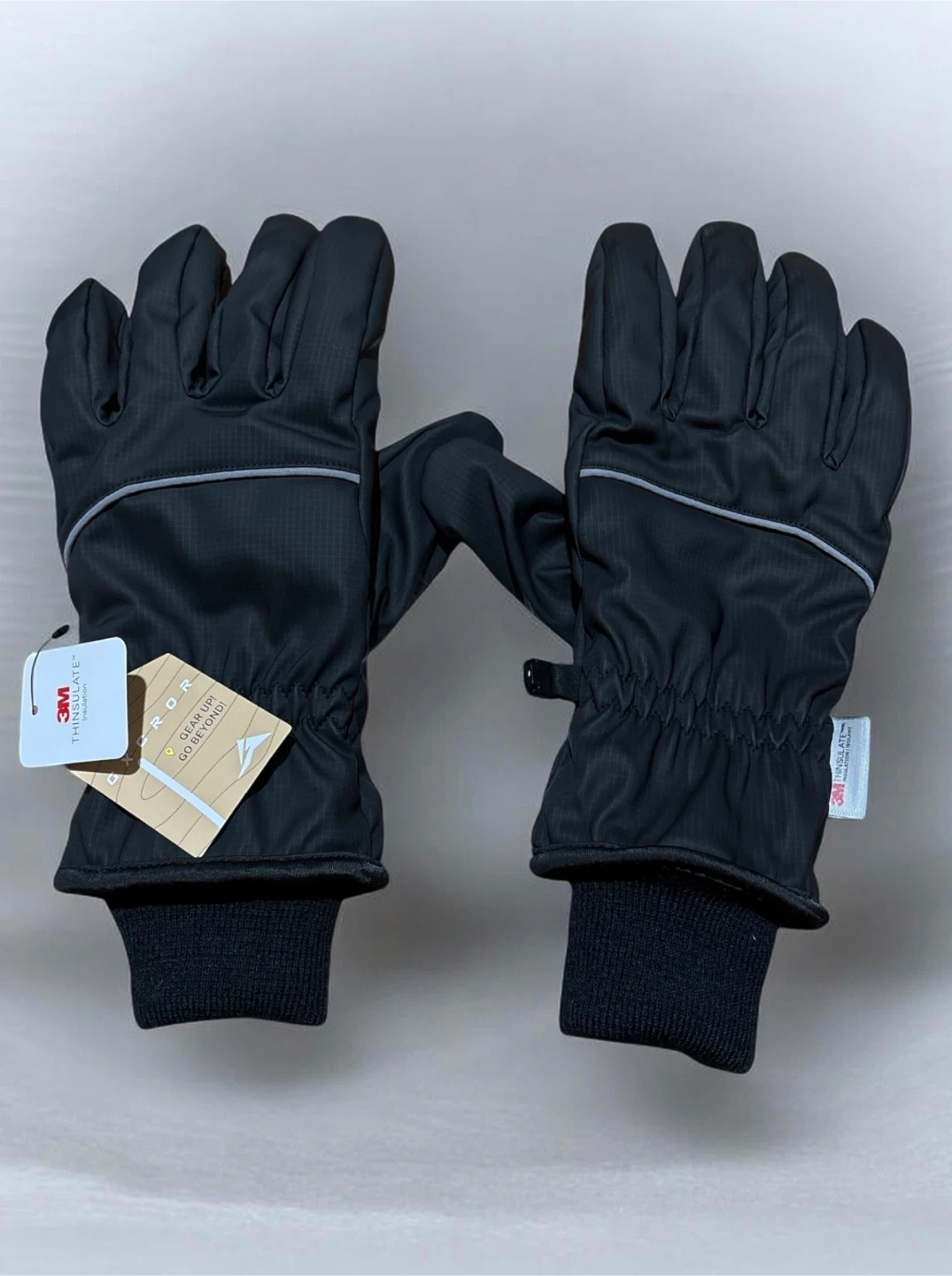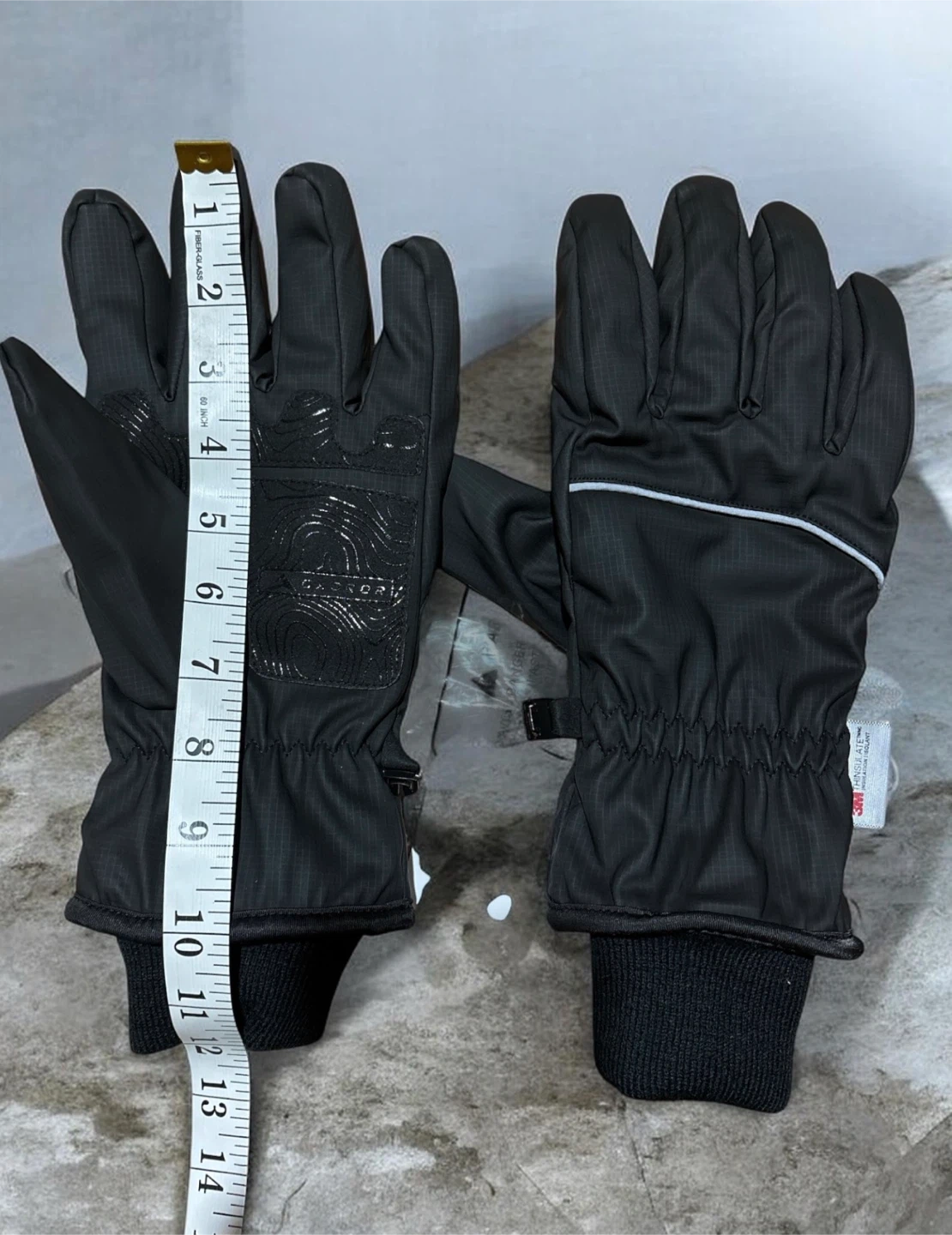 Keep your hands warm with these black winter gloves featuring 3M Thinsulate insulation. They're made with a shell of 35% polyurethane, 65% polyester, and a 100% polyester lining. A measuring tape shows they are approximately 7 inches from cuff to fingertip.