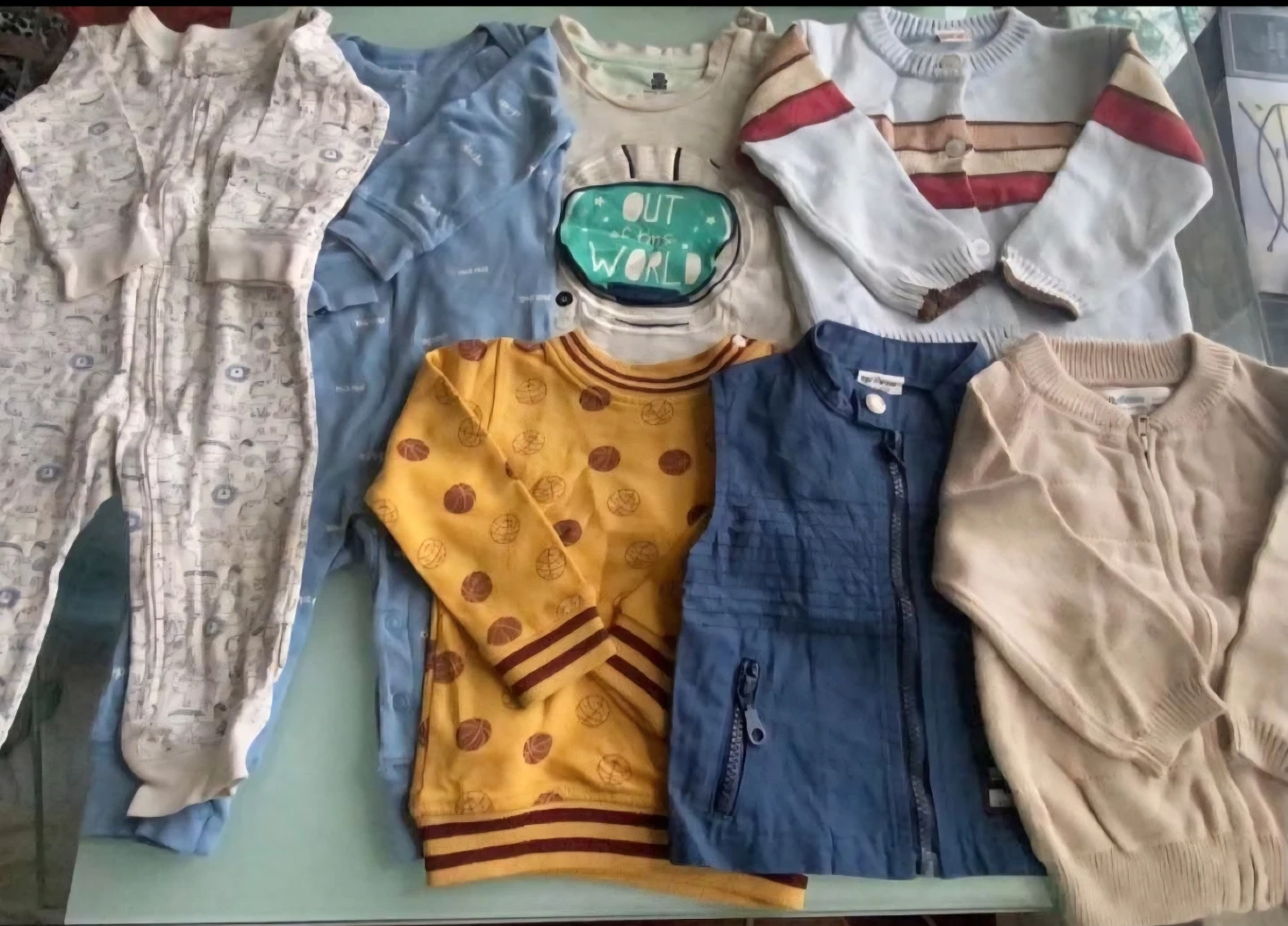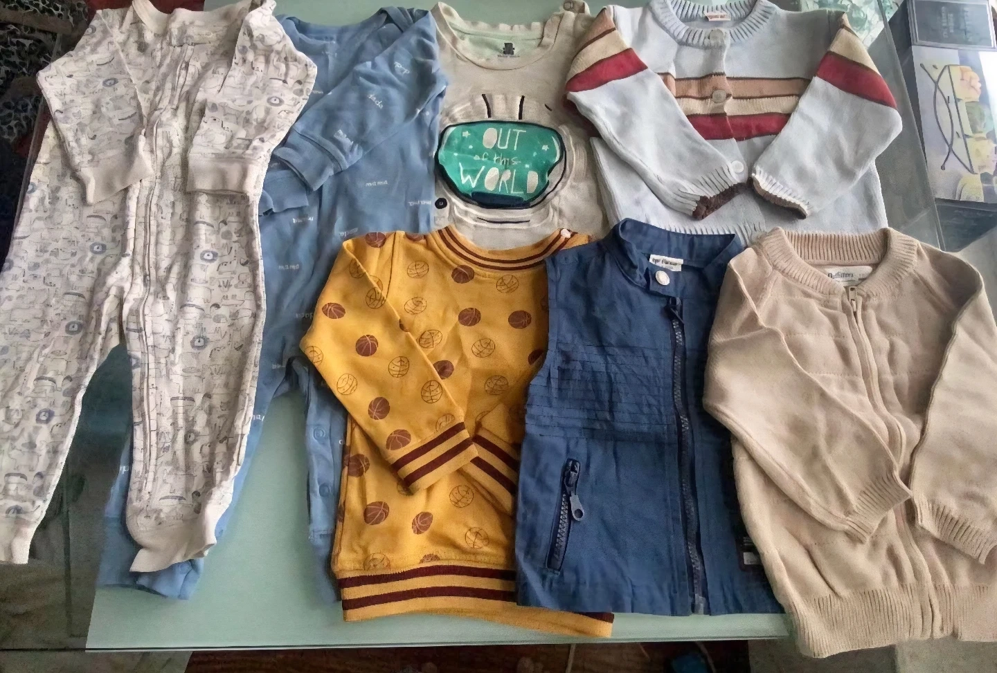 This is a bundle of baby clothes. It includes a white footie pajamas with a print, a blue sleep sack, a long-sleeved onesie with an astronaut graphic, a yellow long-sleeved shirt, a blue vest, and a beige zip-up cardigan. Perfect for keeping your little one cozy!