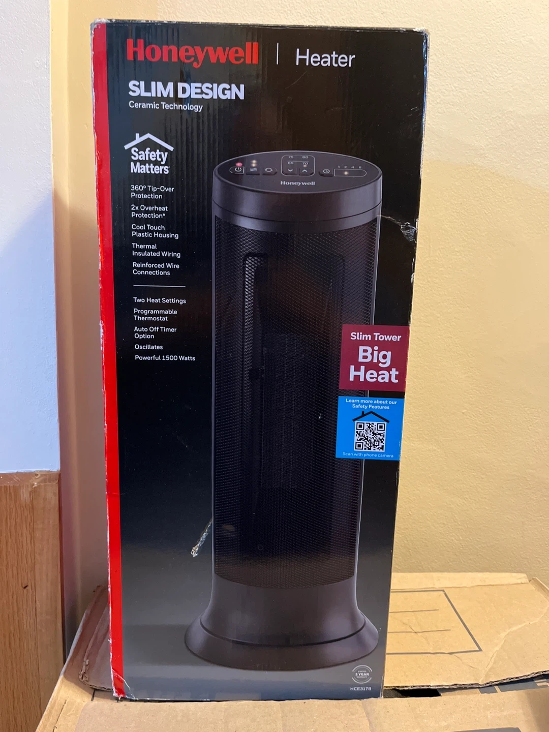 This Honeywell Slim Tower heater features ceramic technology. It offers two heat settings and programmable timer options. Safety features include 360° tip-over protection and 2x overheat protection. It oscillates and has a powerful 1500 Watts output.