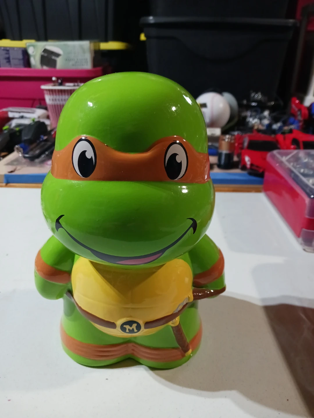 This is a ceramic coin bank featuring Michelangelo from the Teenage Mutant Ninja Turtles. It's green with orange accents and has the letter 'M' on the belt. It's a fun way to save your coins!