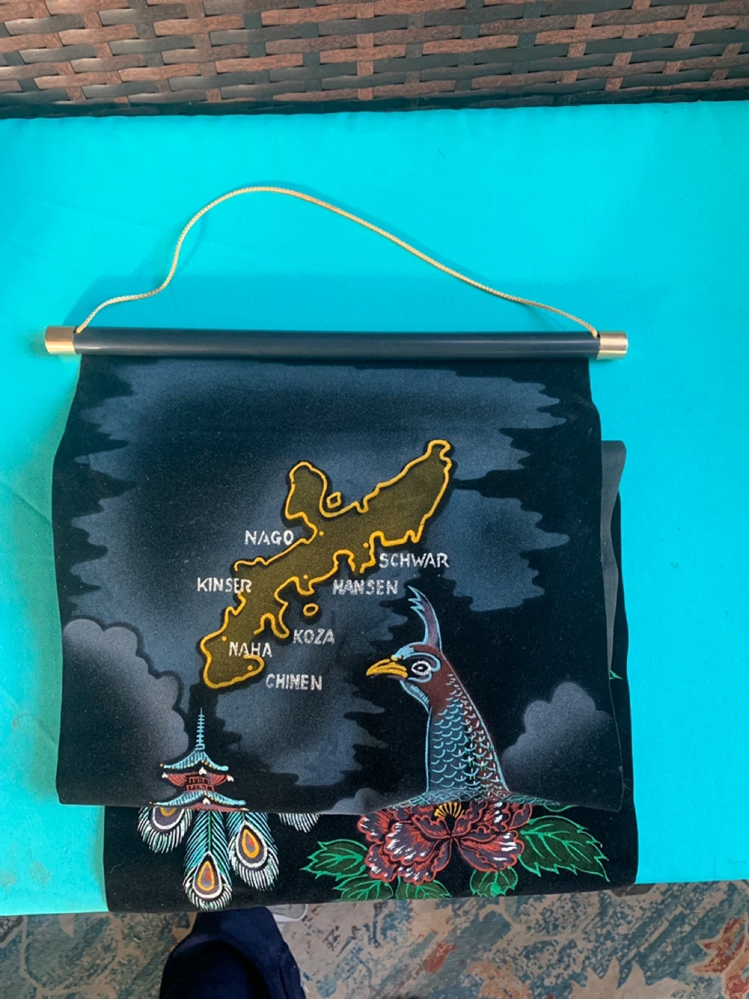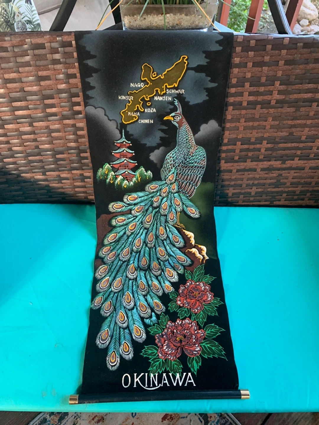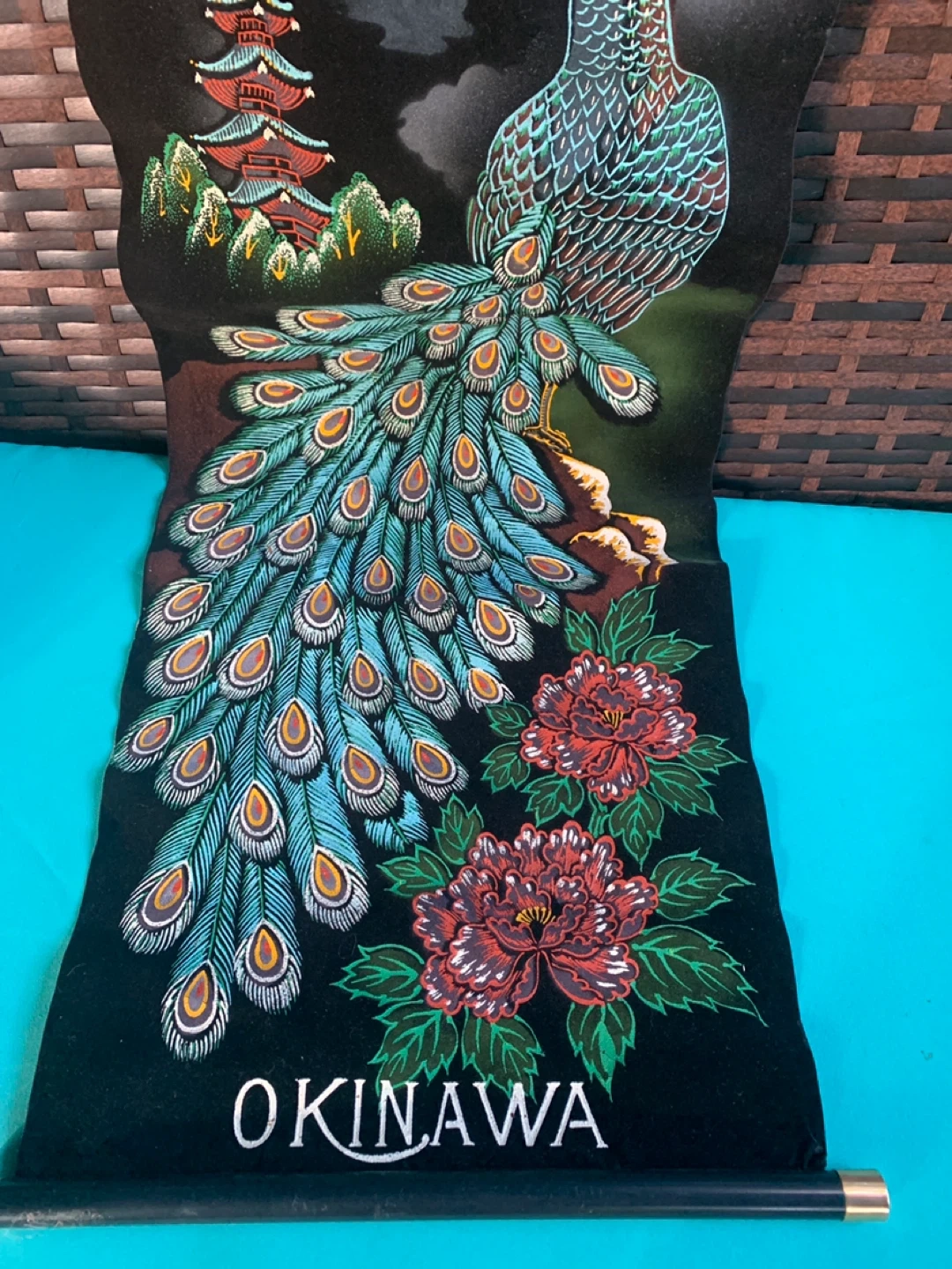 Beautiful Okinawa wall hanging featuring a peacock design! It has a unique vintage feel and would look great in any room. Measures 32 inches long by 11.5 inches wide with felt material.