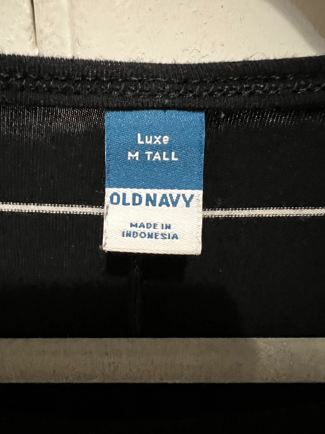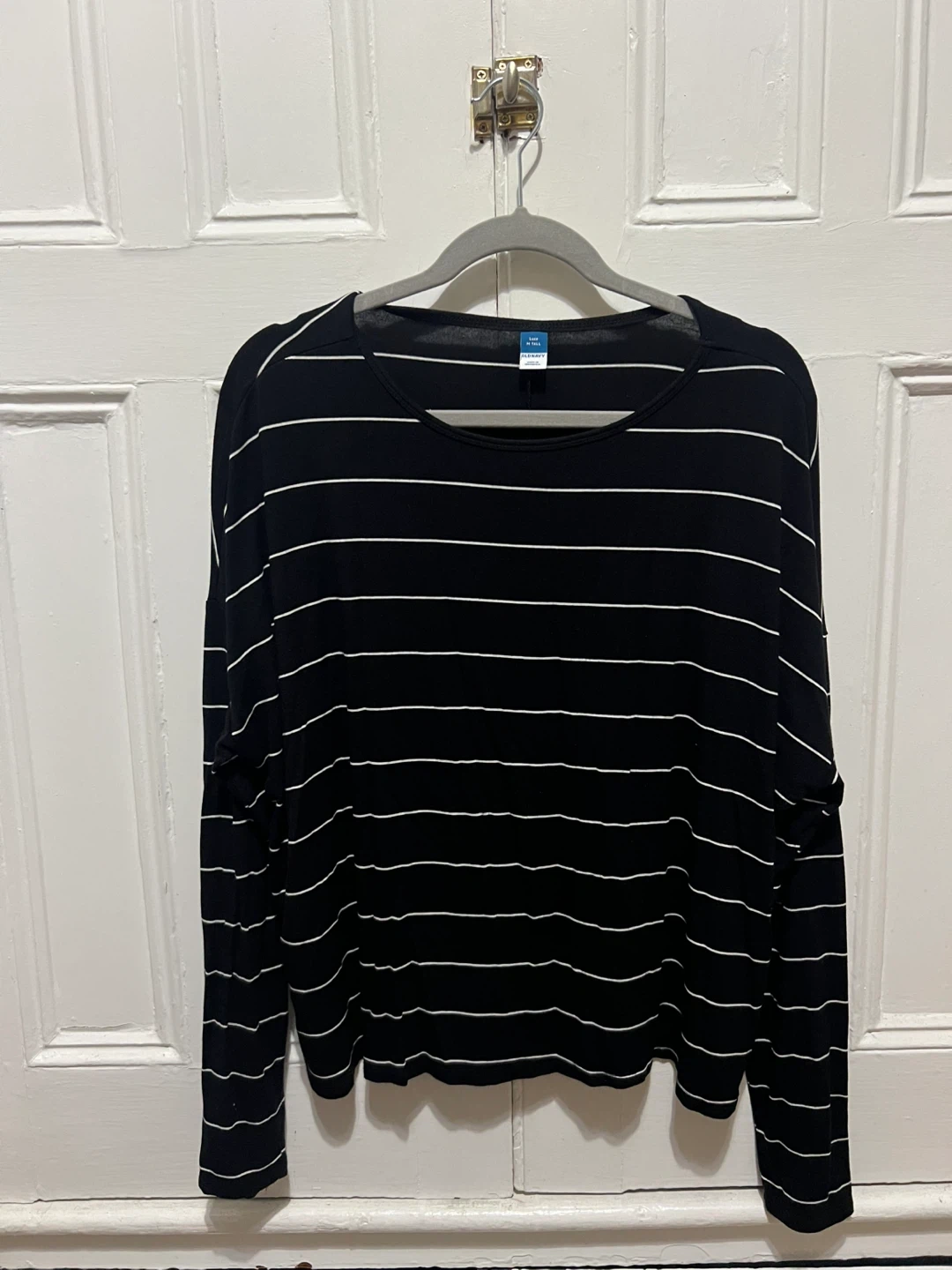Here's a gently used luxe Old Navy long sleeve top! It's a size M Tall and features a classic black and white striped pattern. Stretchy and super comfortable. Perfect for layering or wearing on its own.