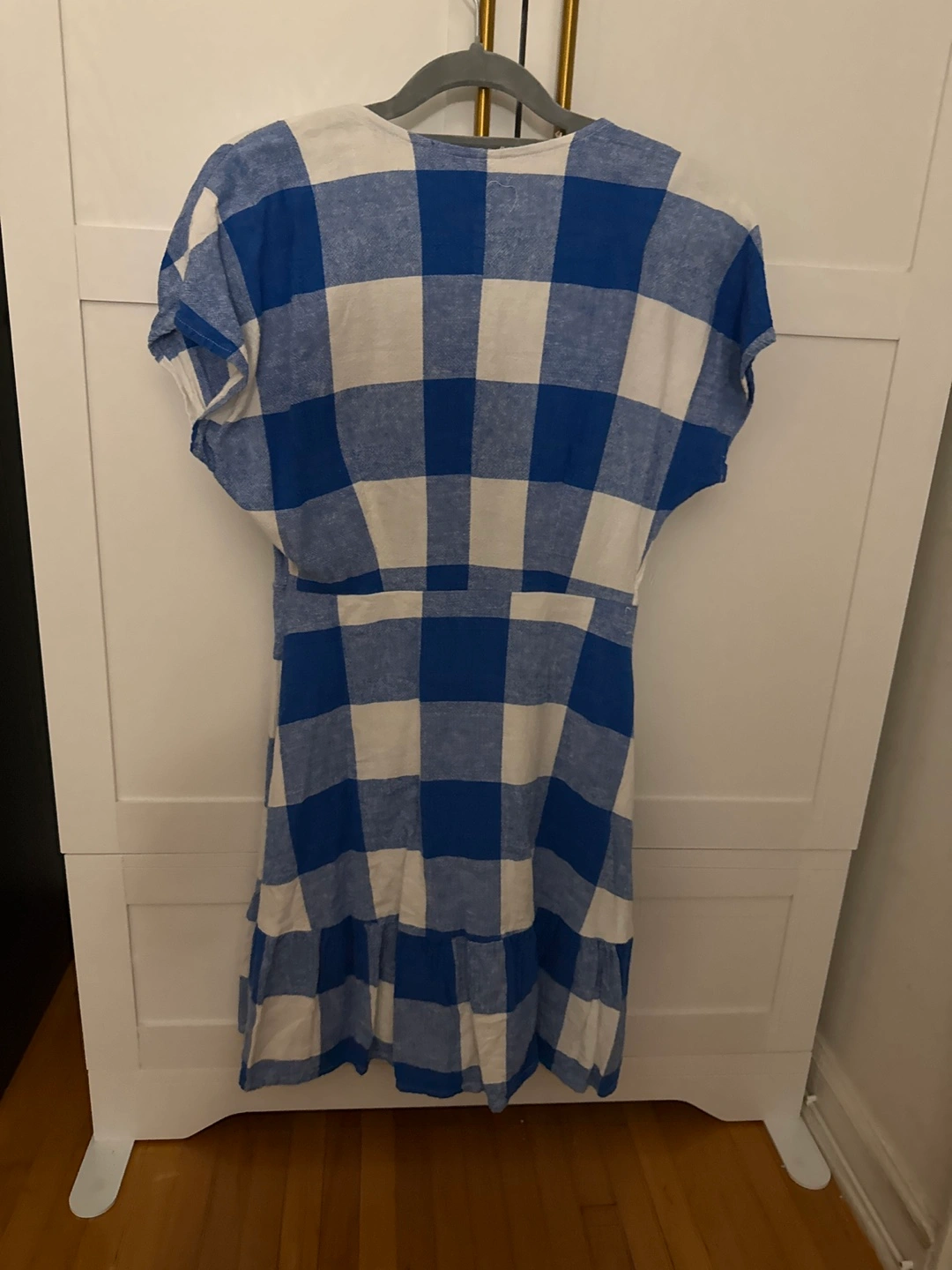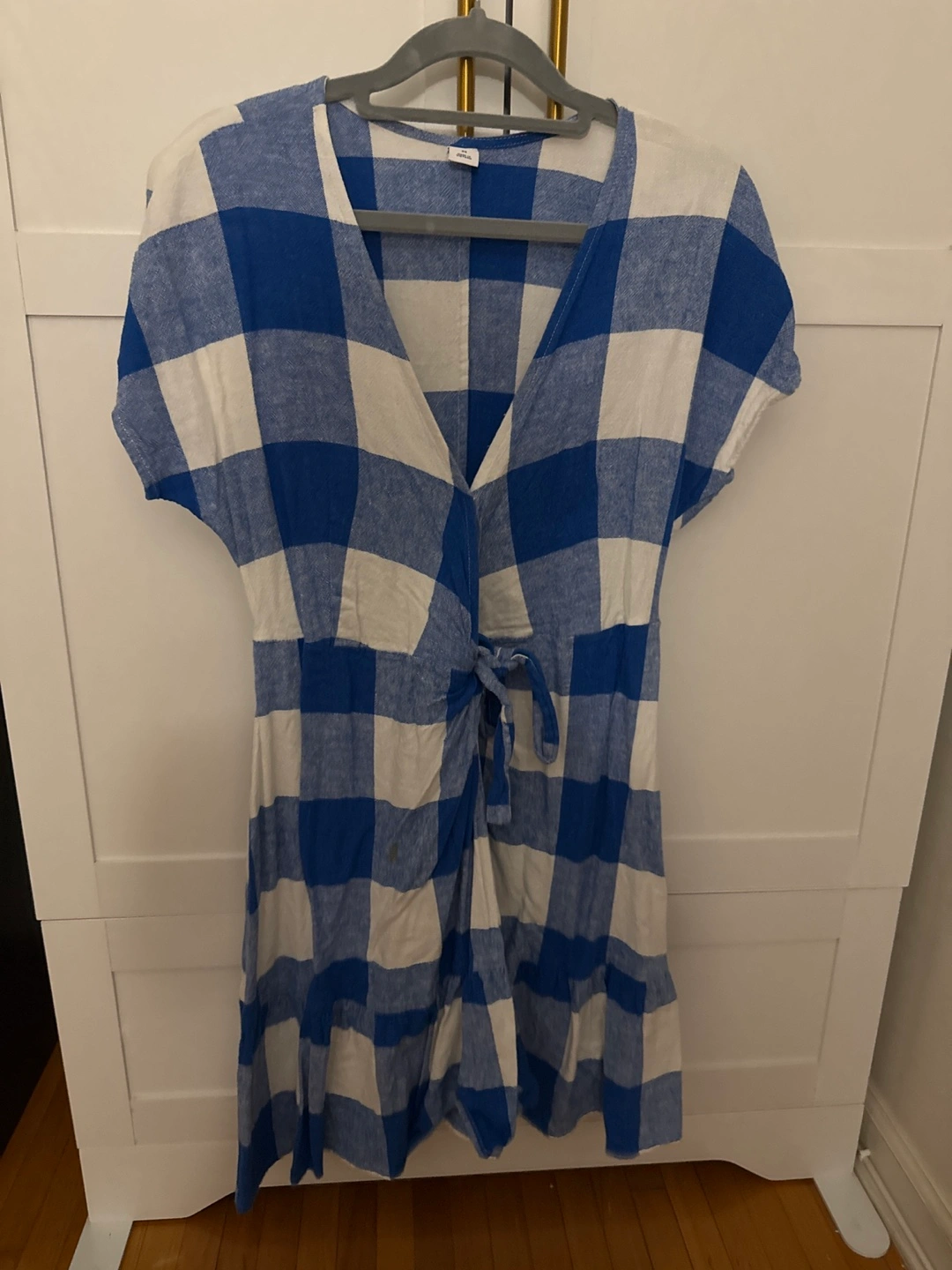 This is an adorable Old Navy dress with a blue and white gingham pattern. It's perfect for summer! The dress features a tie at the waist and a flattering V-neckline. It's in great condition and ready for a new home