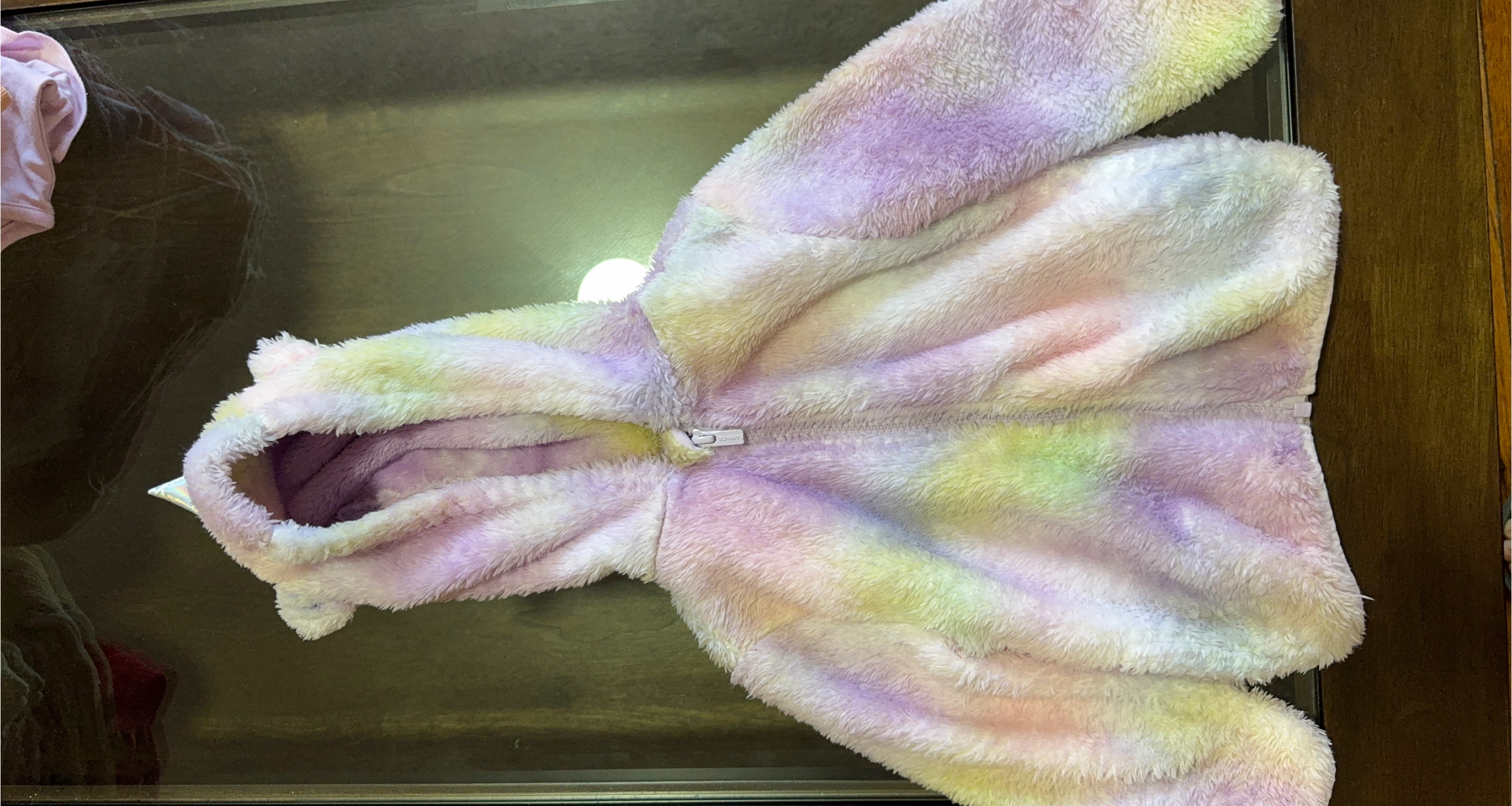 Here's a super cute and cozy Old Navy fuzzy jacket! It features a fun tie-dye pattern in pastel colors. Perfect for keeping warm and stylish!