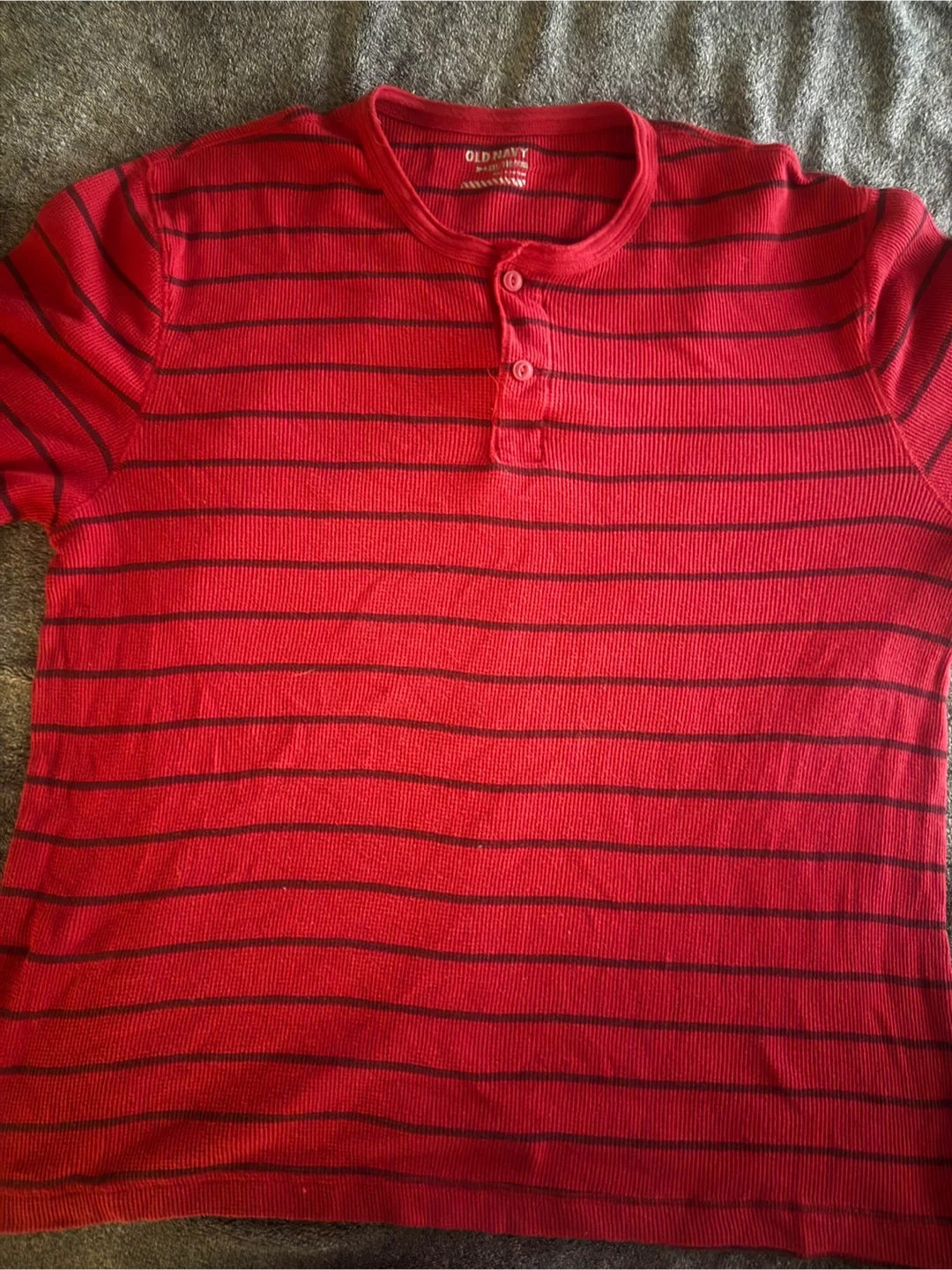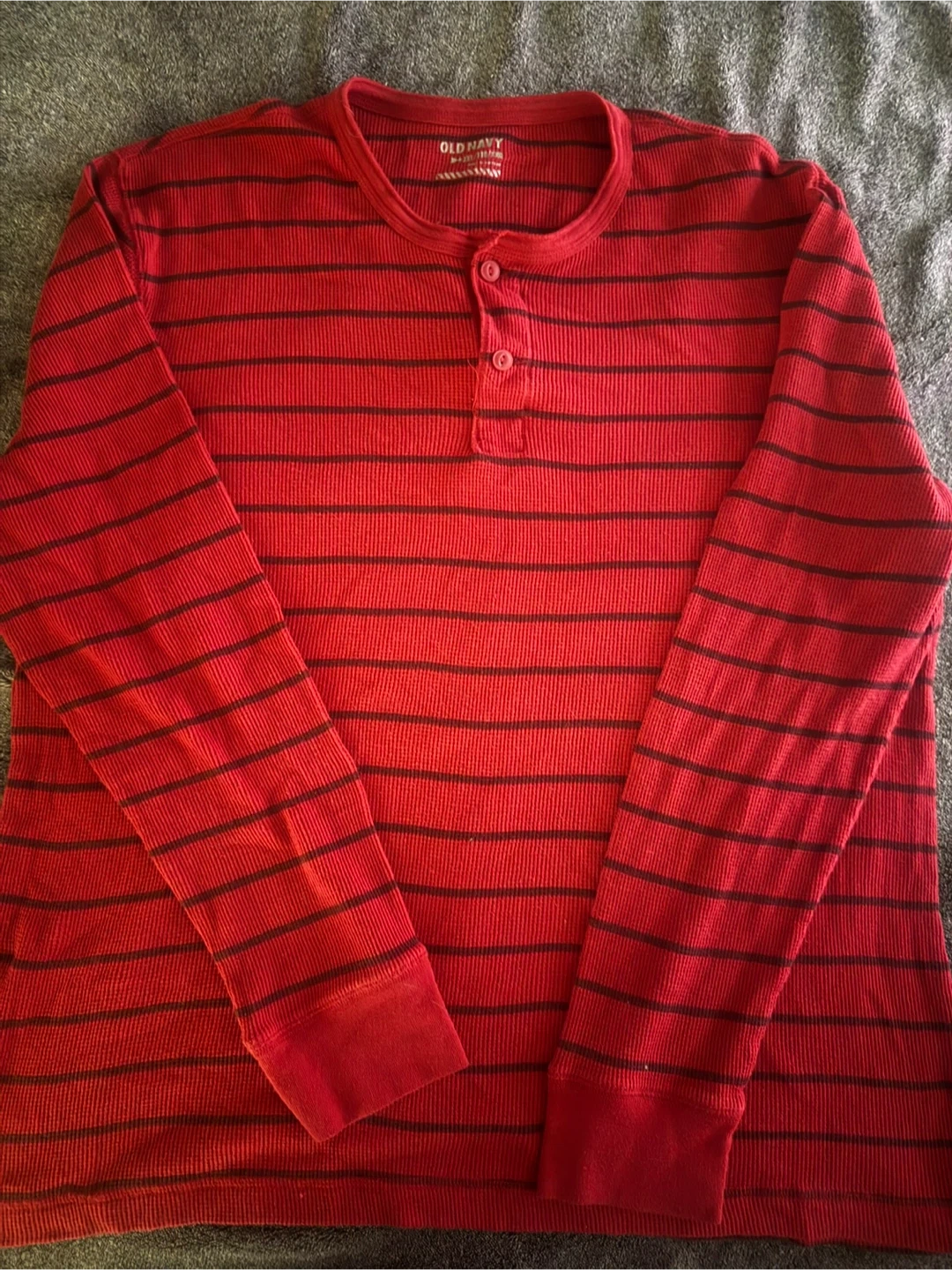 Here's a men's long-sleeved shirt from Old Navy! It features a red and black striped pattern and a Henley style neckline with a two-button closure. It's in good condition and ready for a new home.
