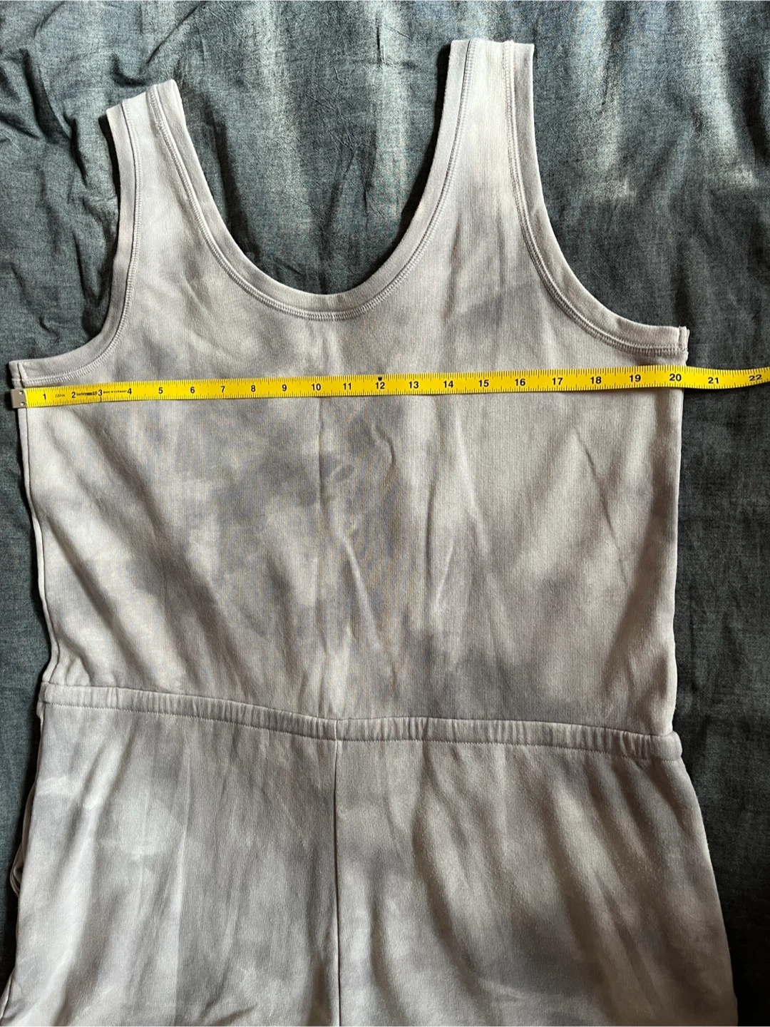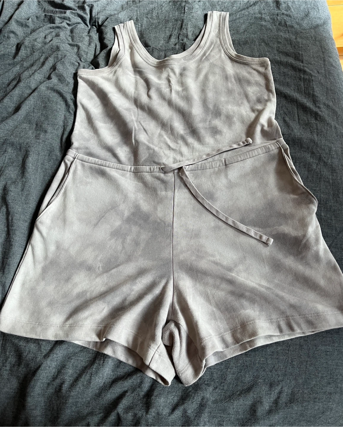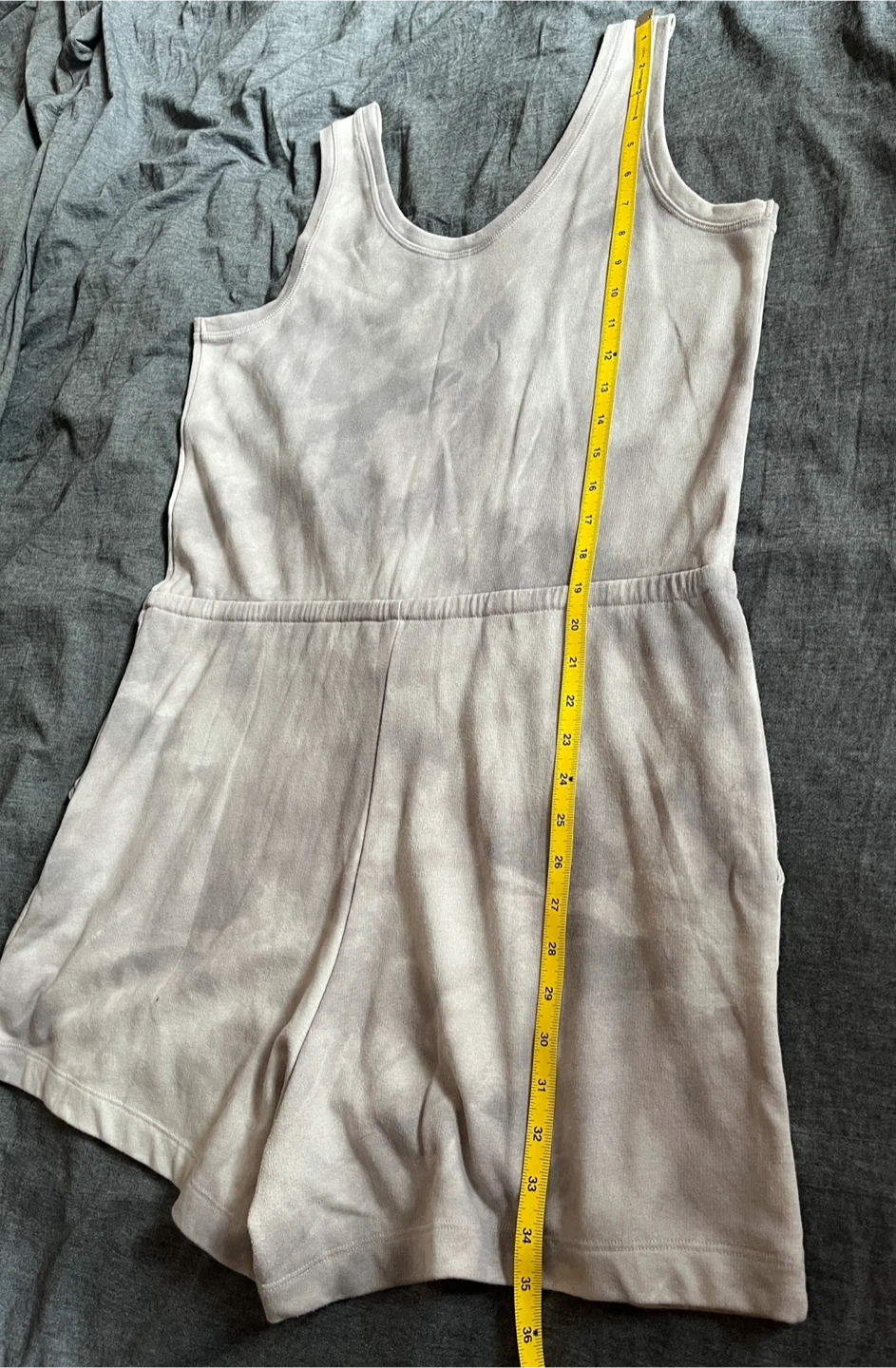 94Old navy romper, super comfy, size large, Gray Tie Dye, draw string waist, pockets, 4inch inseam