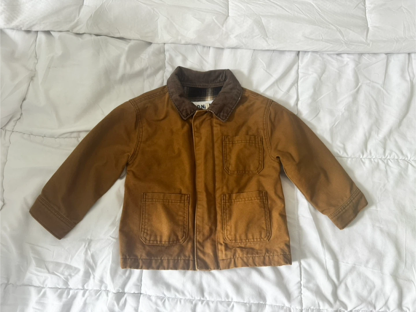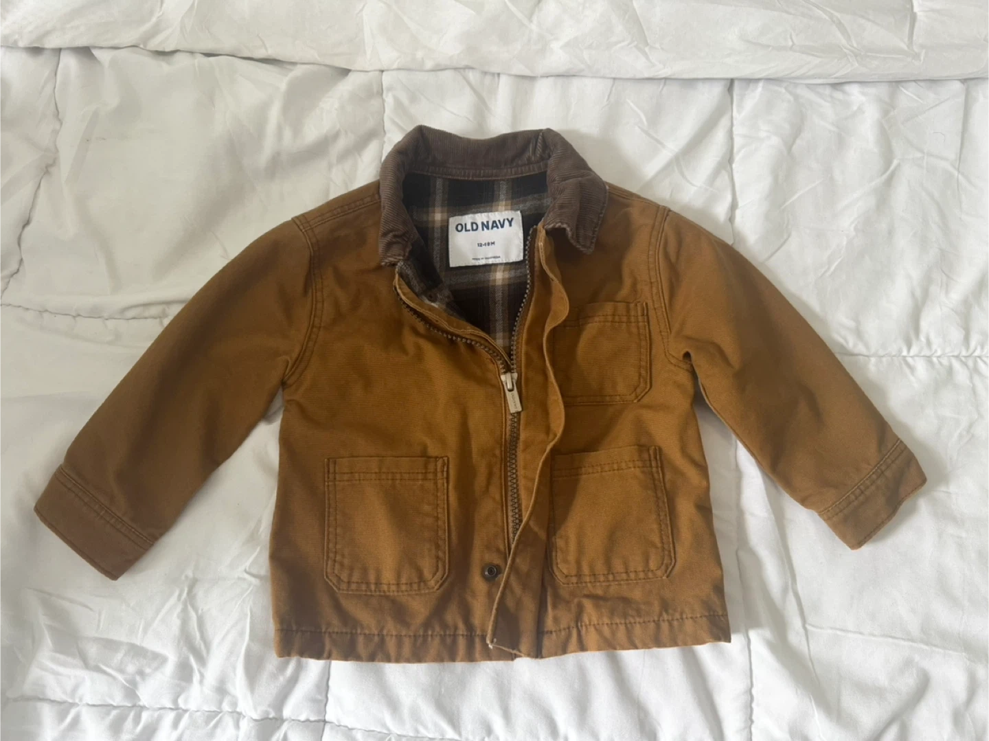 Here's a cute Old Navy toddler jacket, perfect for keeping your little one warm! It's a size 12-18 months and features a classic design with a corduroy collar. The jacket has a brown color and is made of durable material, great for everyday wear