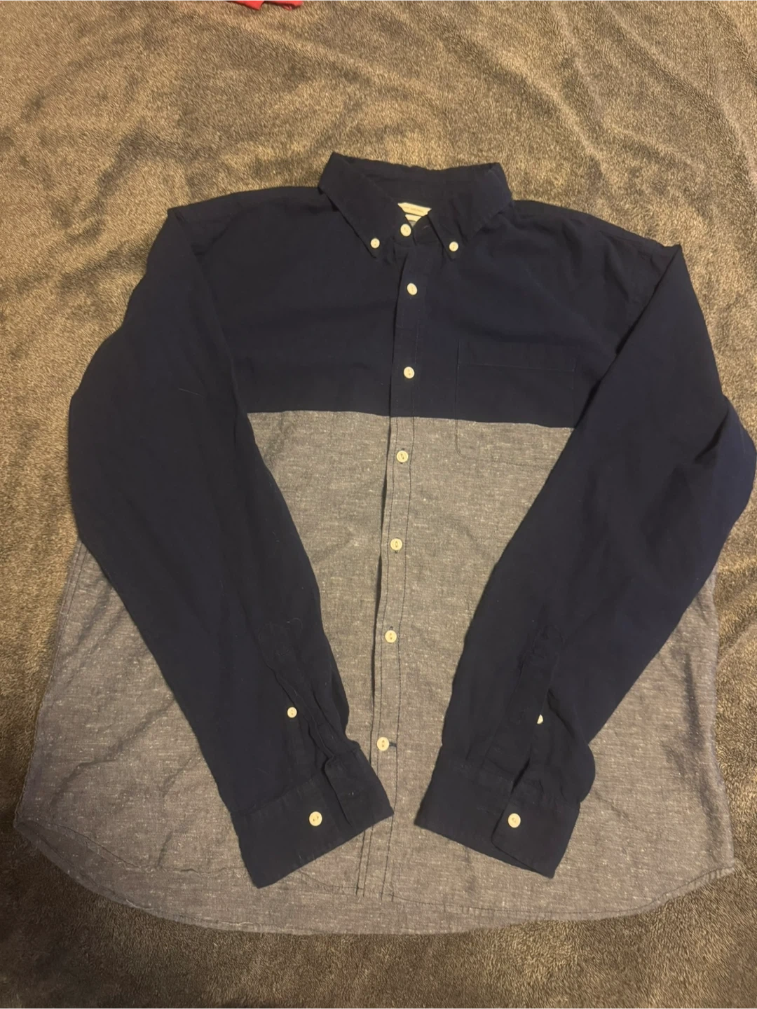 Selling a long-sleeve button-down shirt from Old Navy. It features a stylish two-tone design with a dark blue upper section and a gray lower section. Perfect for casual wear!