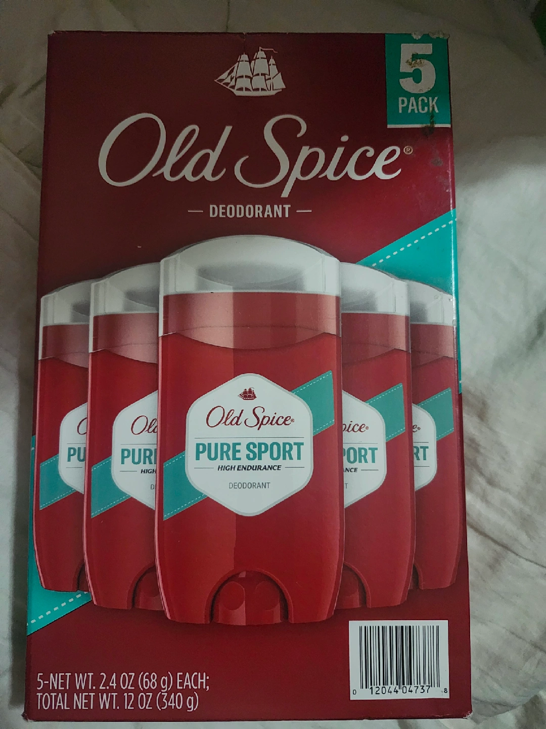 Selling a 5-pack of Old Spice Pure Sport deodorant. Each stick contains 2.4 oz (68g) for a total net weight of 12 oz (340g). Great for high endurance and a classic scent!