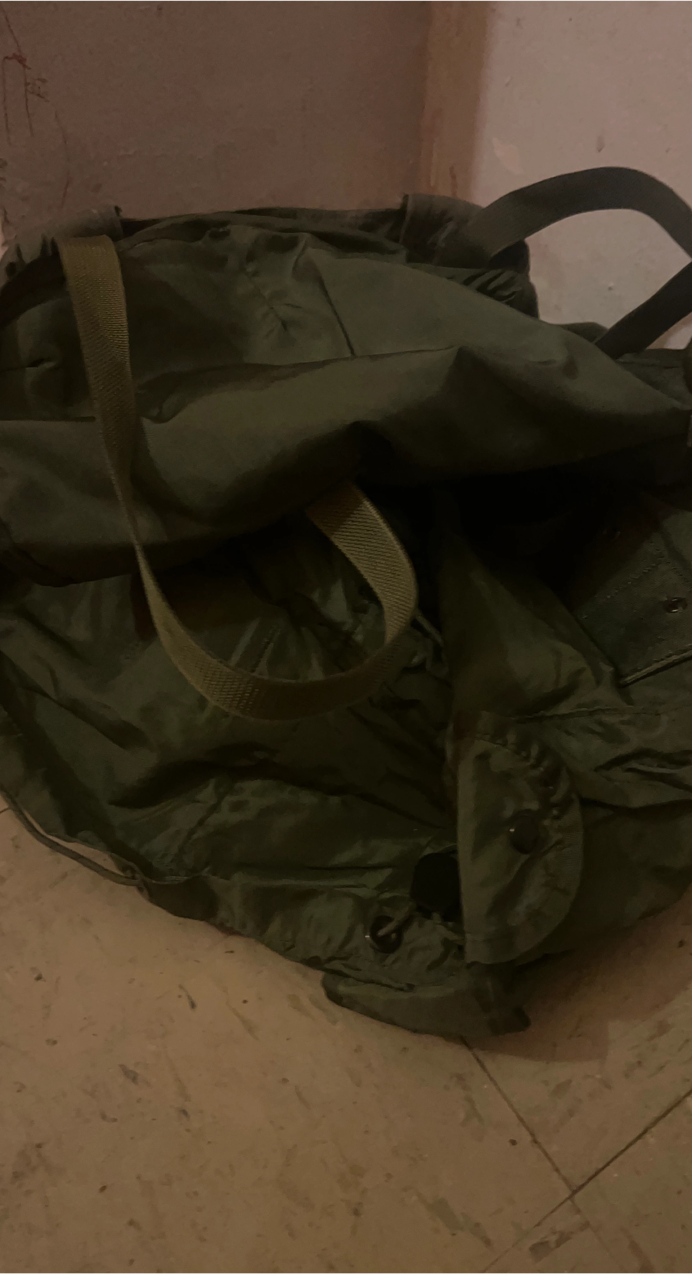 75This is an olive green duffle bag. It has a drawstring closure and shoulder straps. It shows some signs of use.