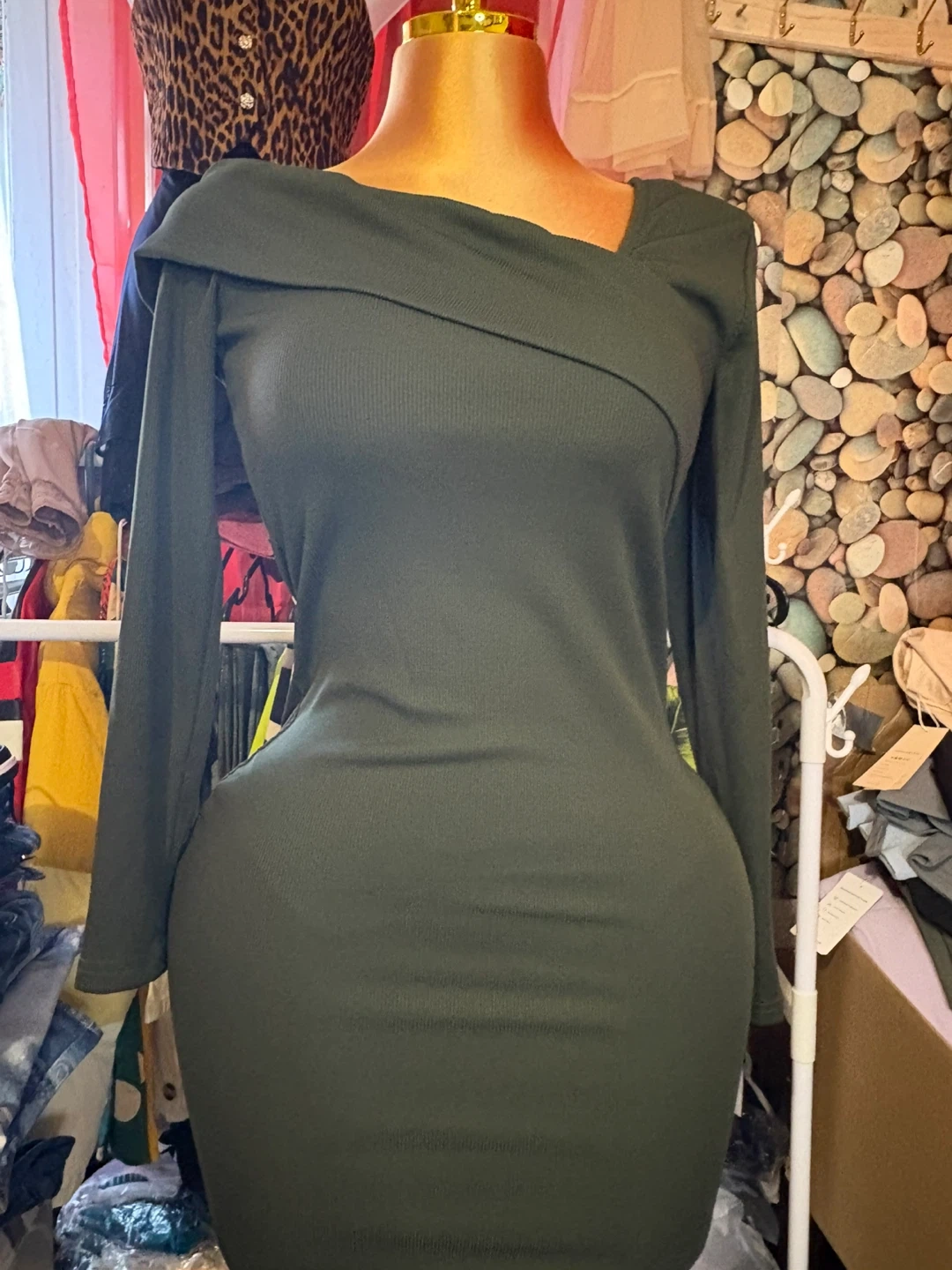 125Here's a fitted olive green dress. It features a unique neckline and long sleeves. It's in great condition and ready for a new home!