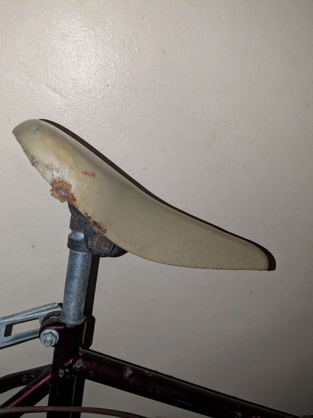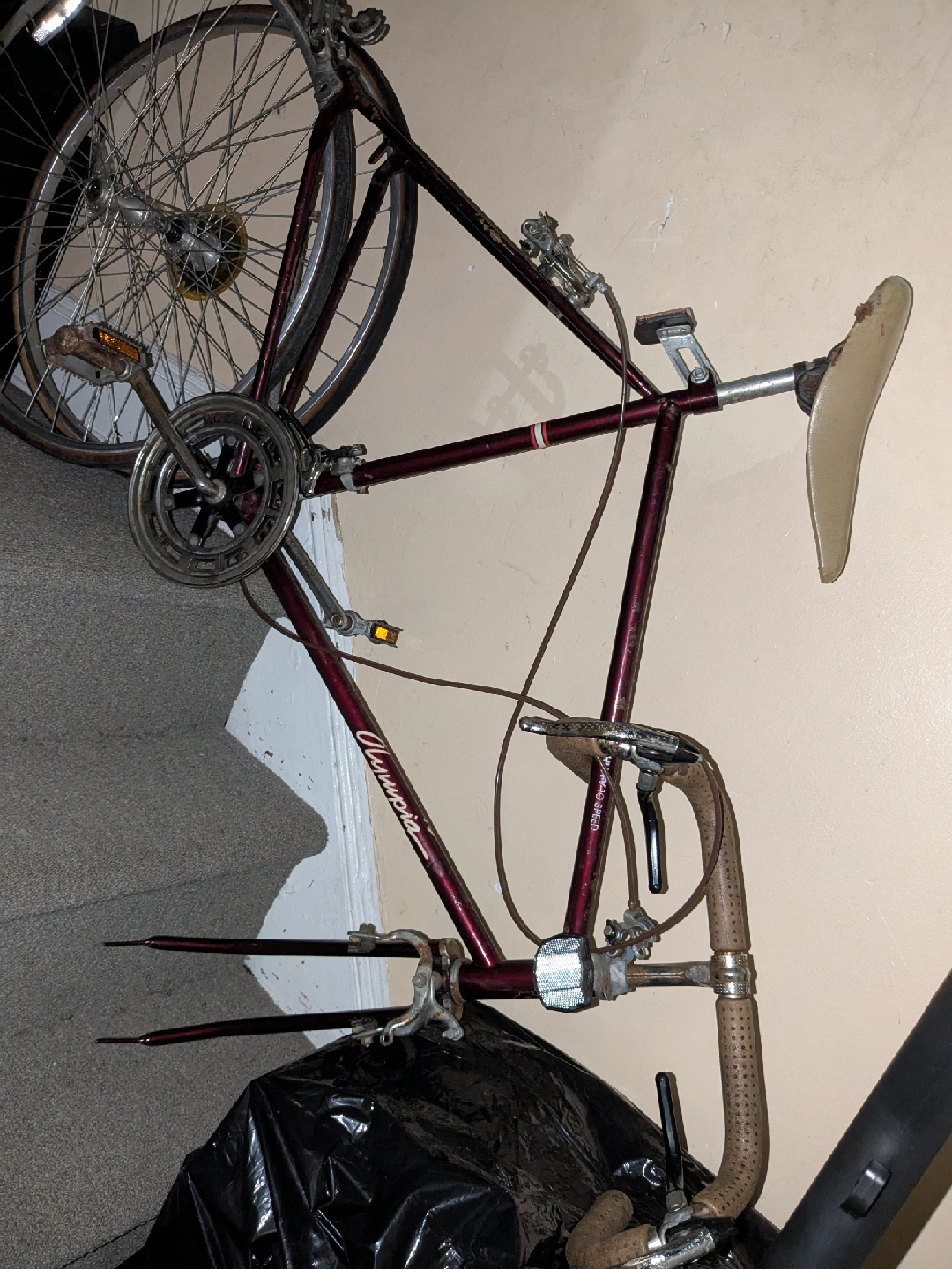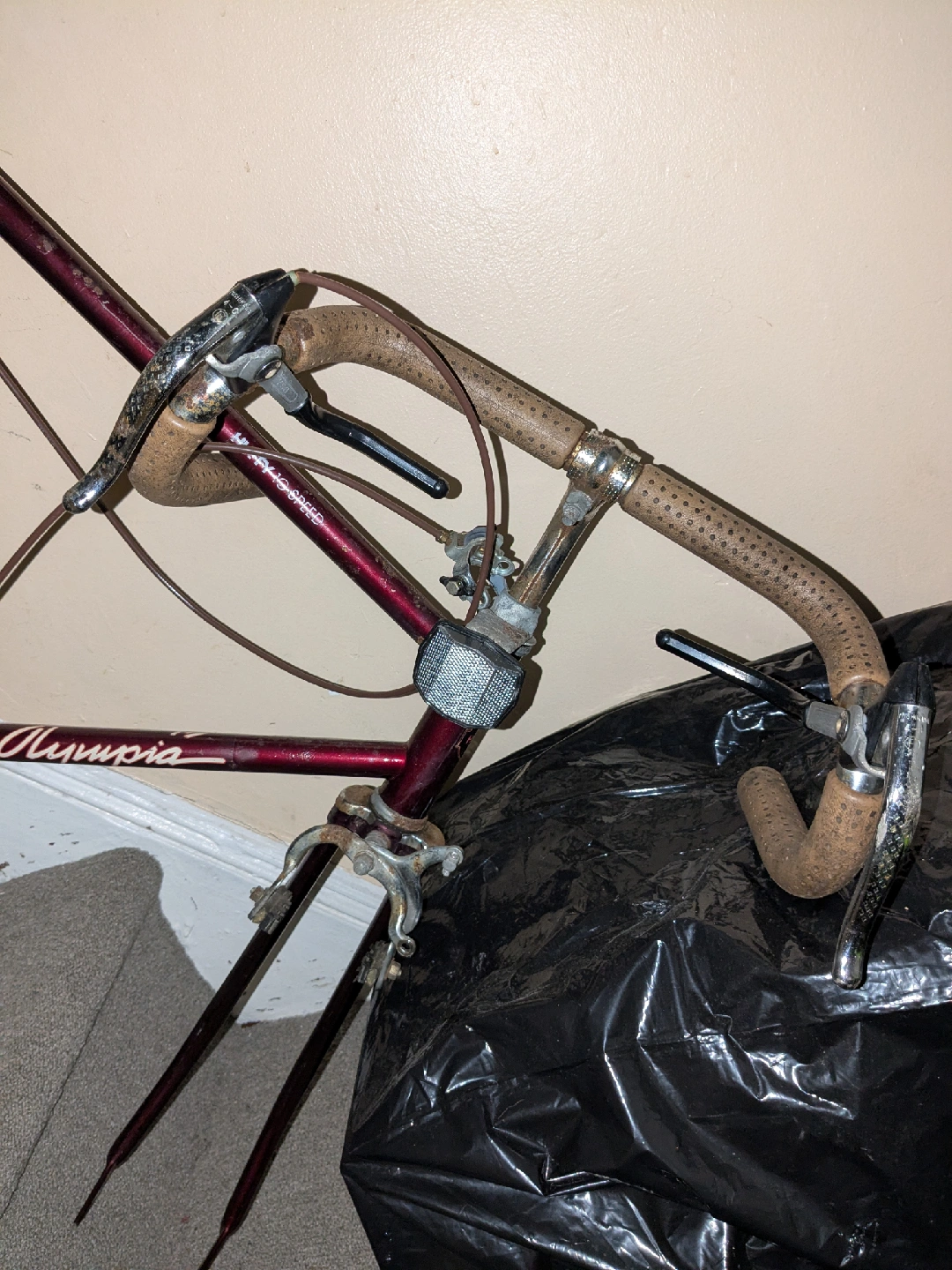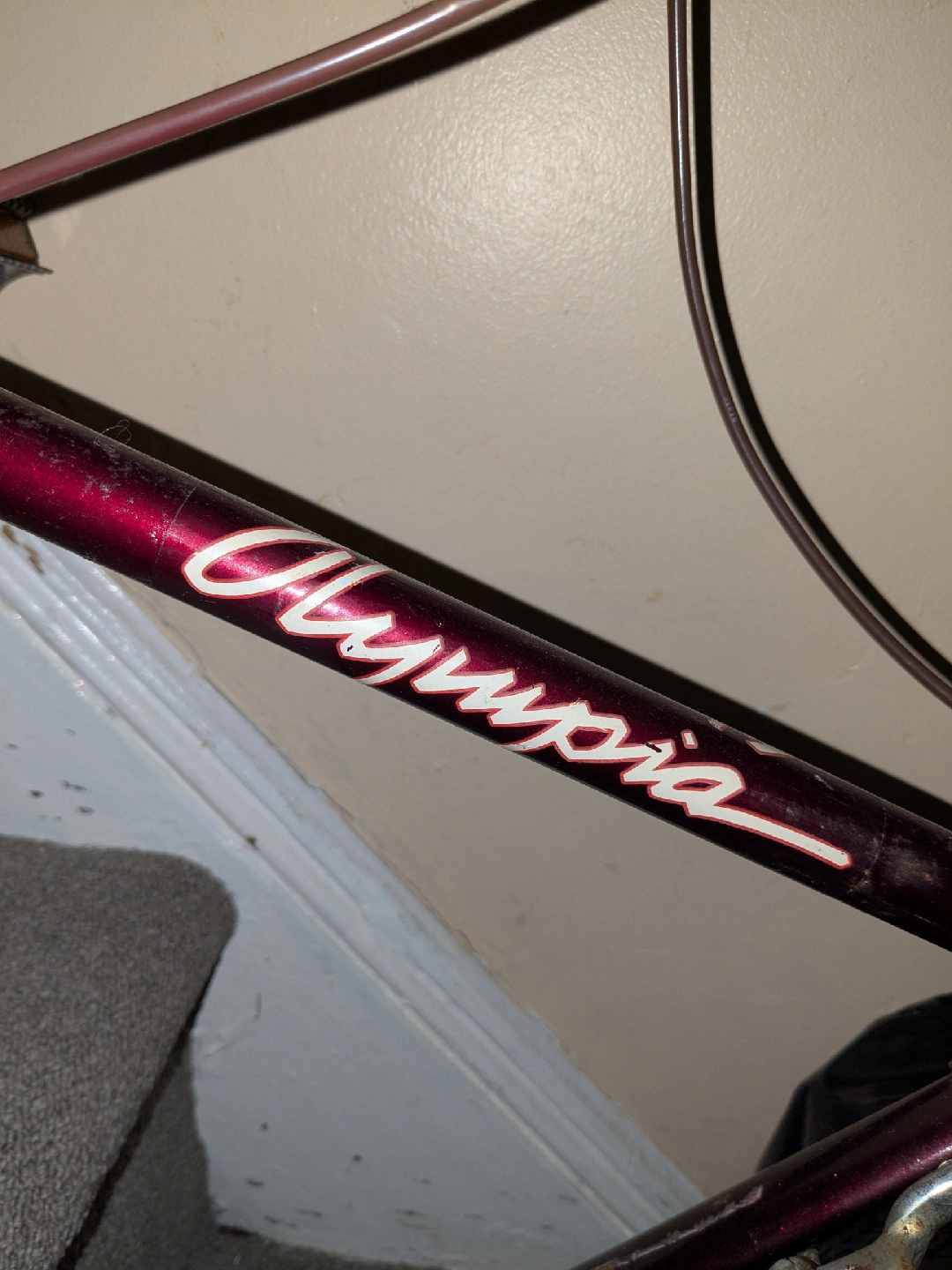 Selling an Olympia road bike with a burgundy frame. The handlebars have a unique brown, textured grip. It shows signs of wear and rust, but it's still a cool vintage piece! Please see photos for details. Missing chain, tires, and front/rear derailleurs. Hand shifters and brake levers intact. Great candidate for a retro build, wall décor, or parts salvage. Frame has been cleaned and sanitized for safety.