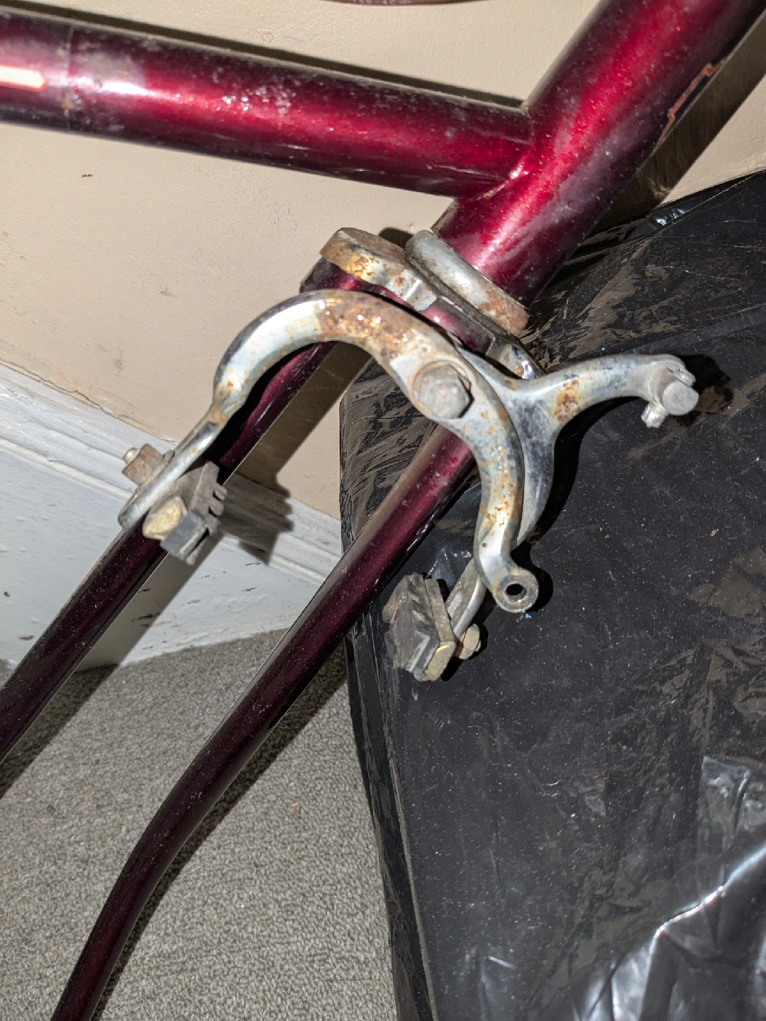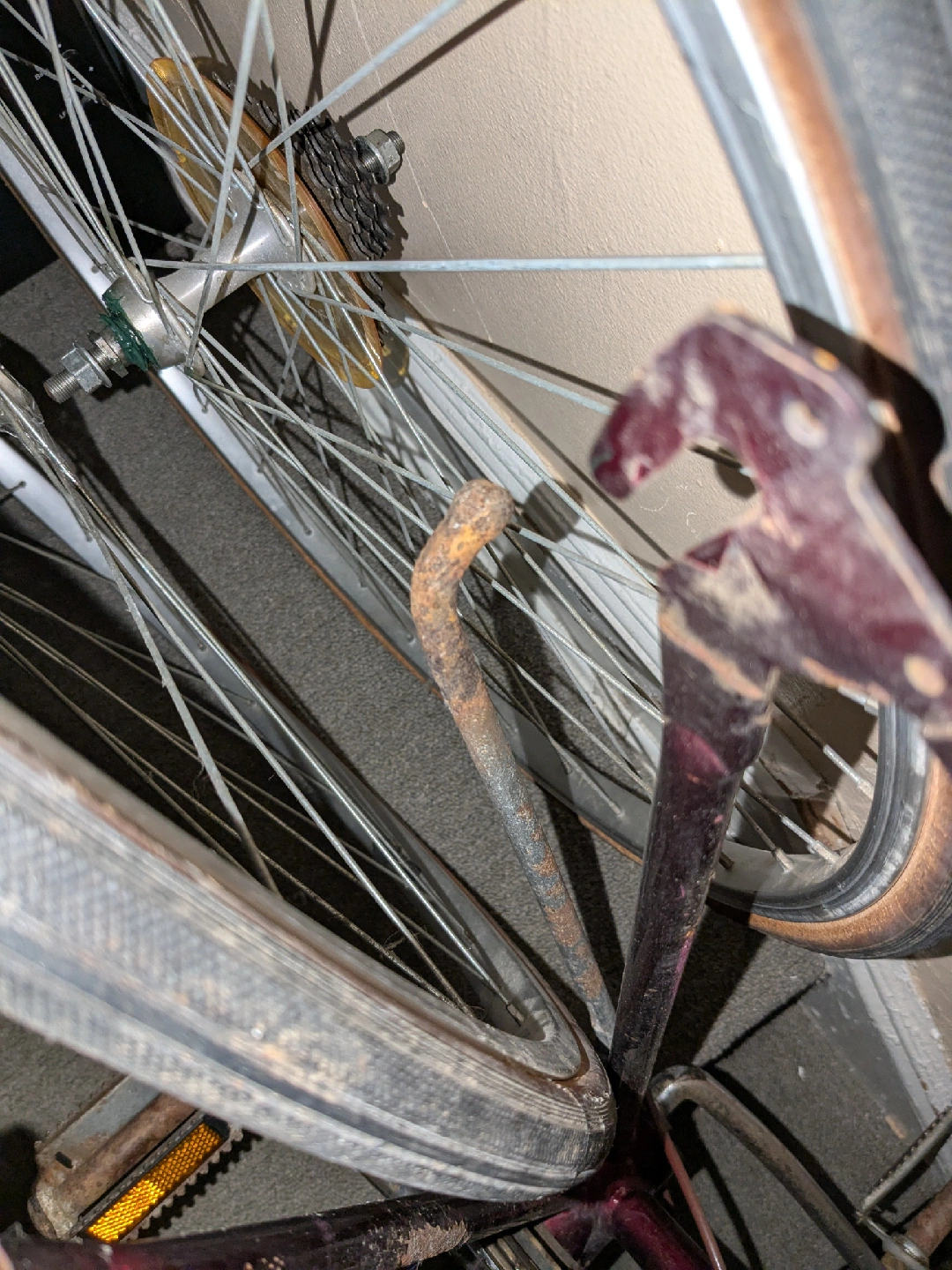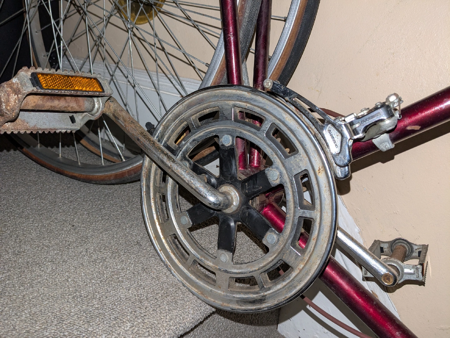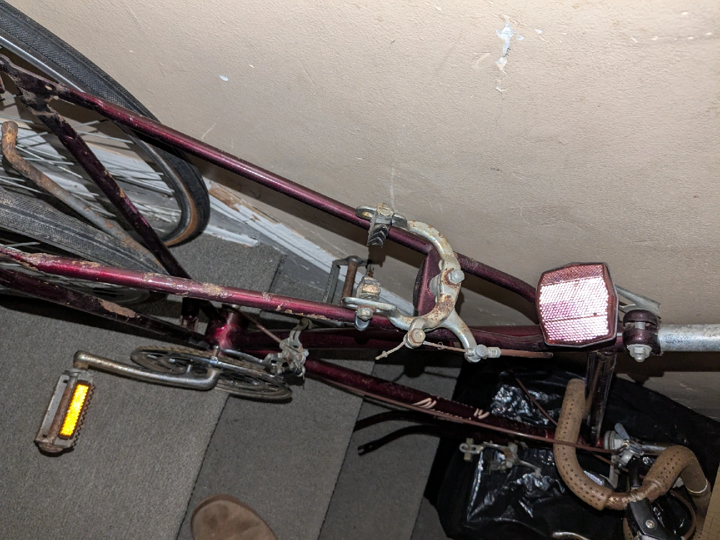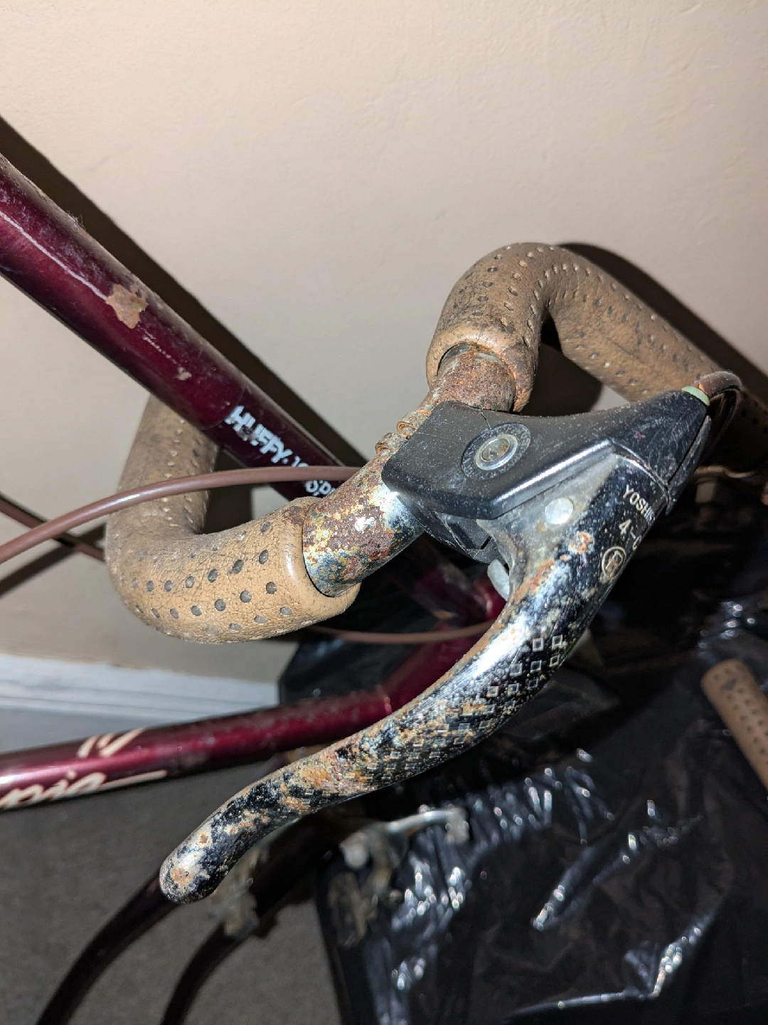 Selling an Olympia road bike with a burgundy frame. The handlebars have a unique brown, textured grip. It shows signs of wear and rust, but it's still a cool vintage piece! Please see photos for details. Missing chain, tires, and front/rear derailleurs. Hand shifters and brake levers intact. Great candidate for a retro build, wall décor, or parts salvage. Frame has been cleaned and sanitized for safety.