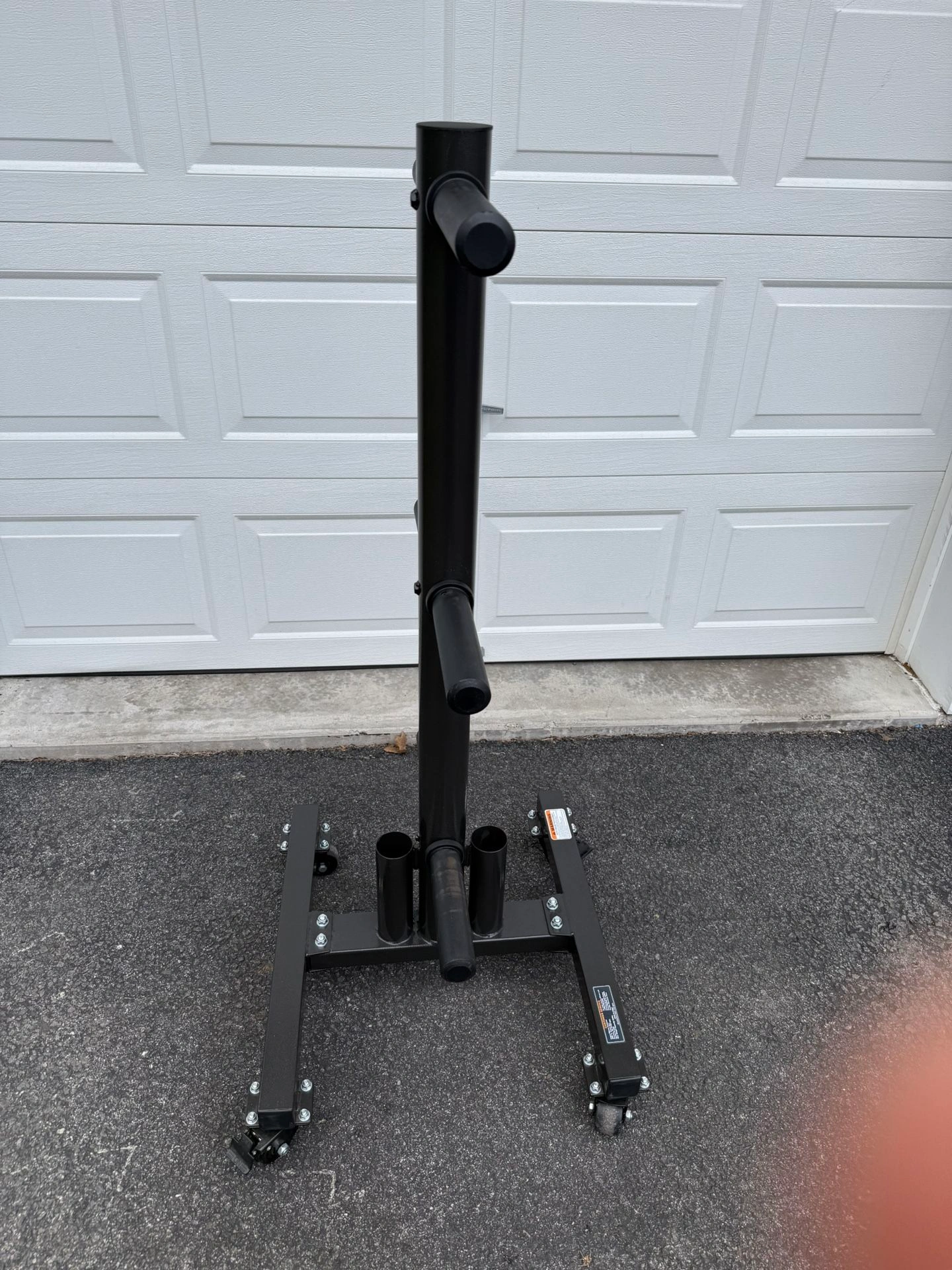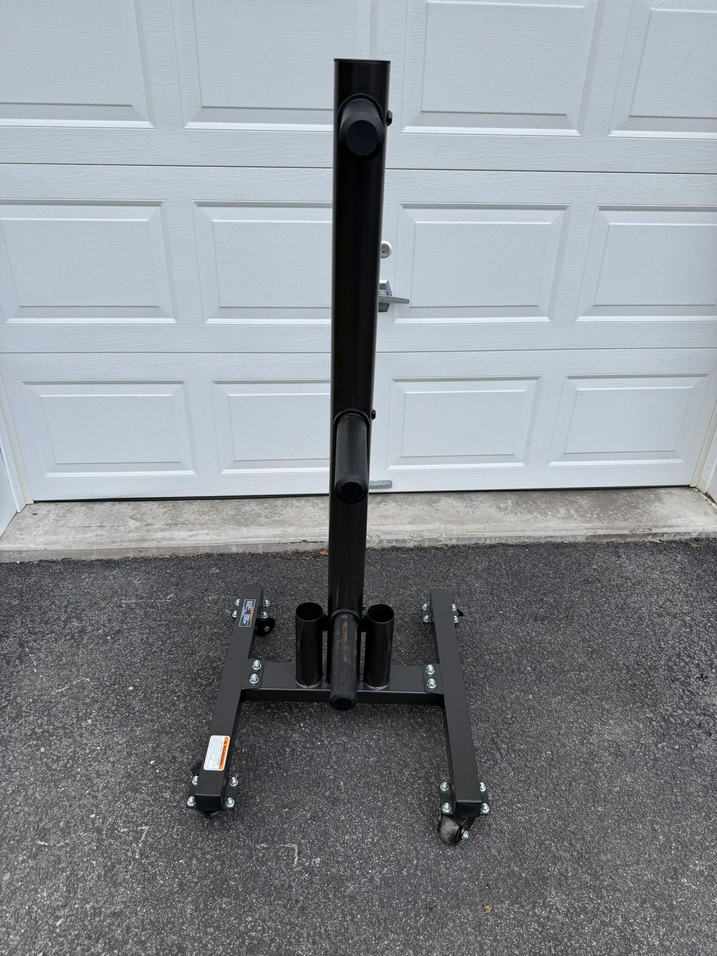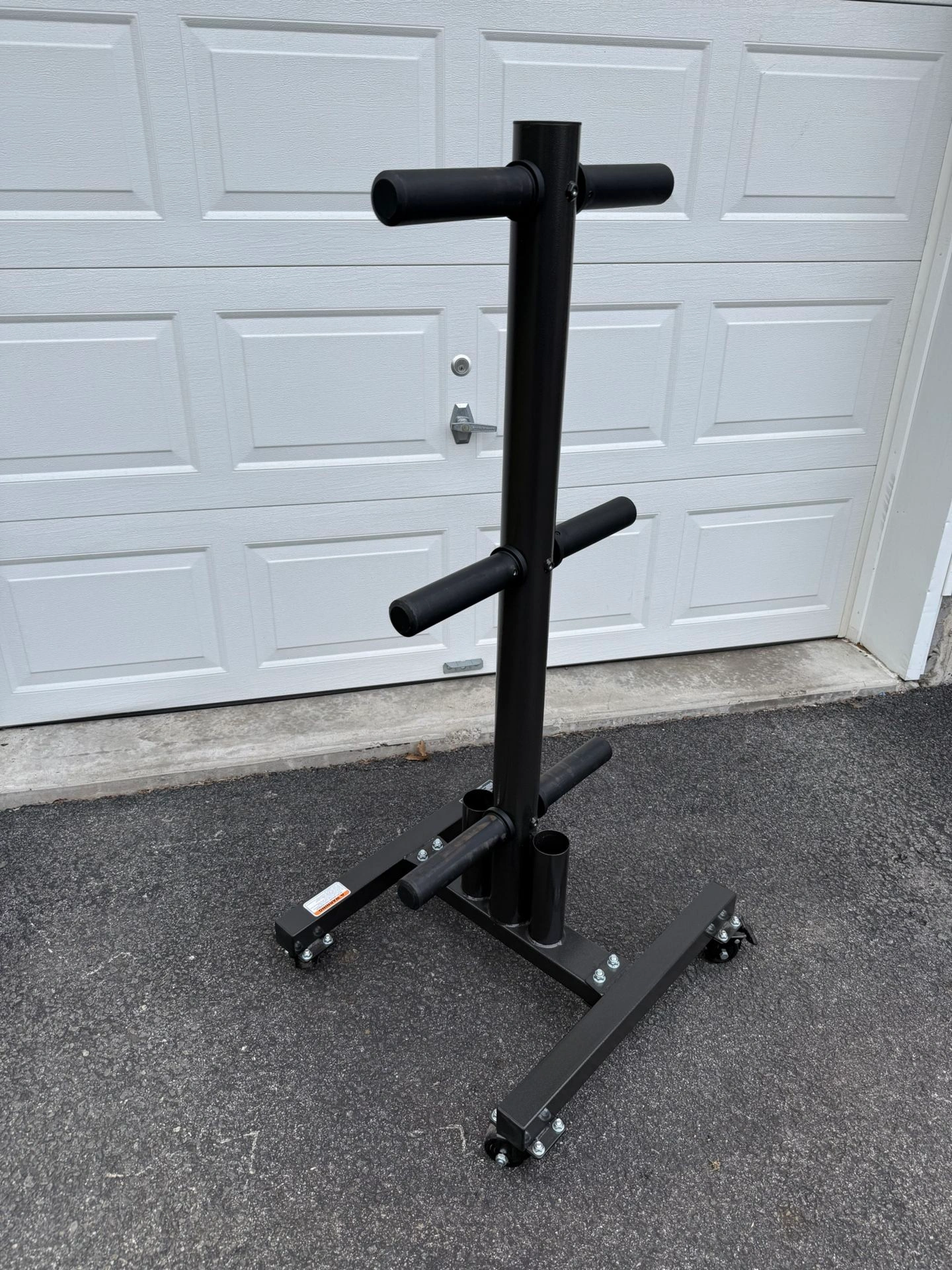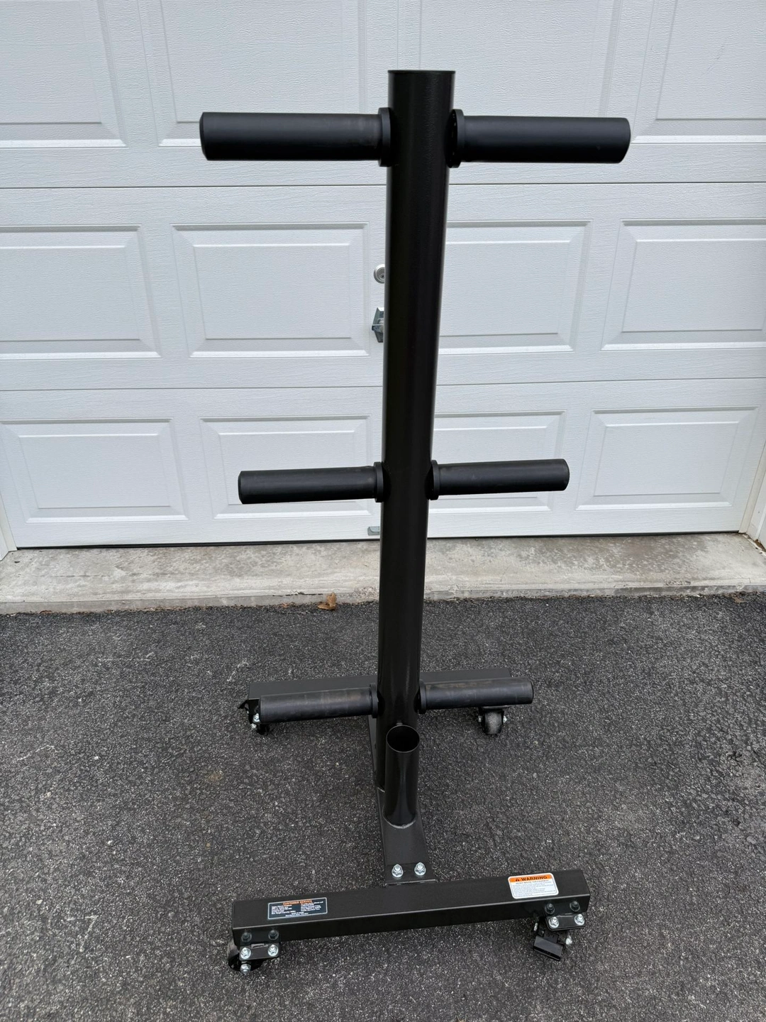 15Vertical weight plate storage tree in excellent condition. Can be used with 2 inch Olympic weight plates or 1 inch standard weight plates. The sleeves are removable and can accommodate both at the same time if desired. Comes with two holders for Olympic barbells, but standard barbells can fit in them as well. Also comes with locking wheels for easy mobility.