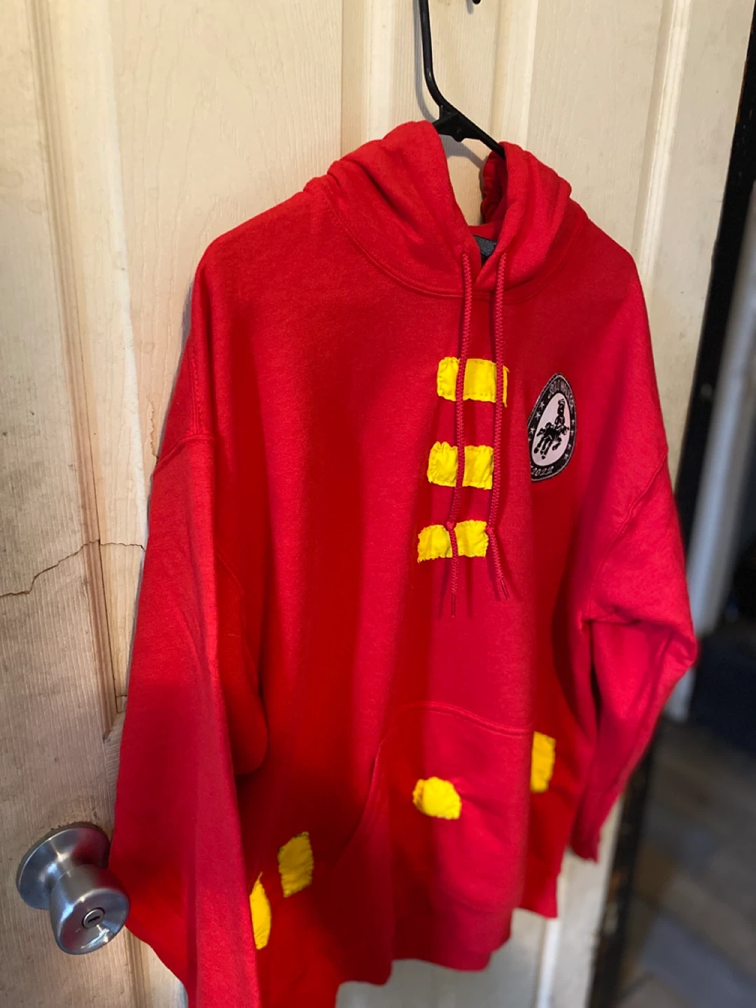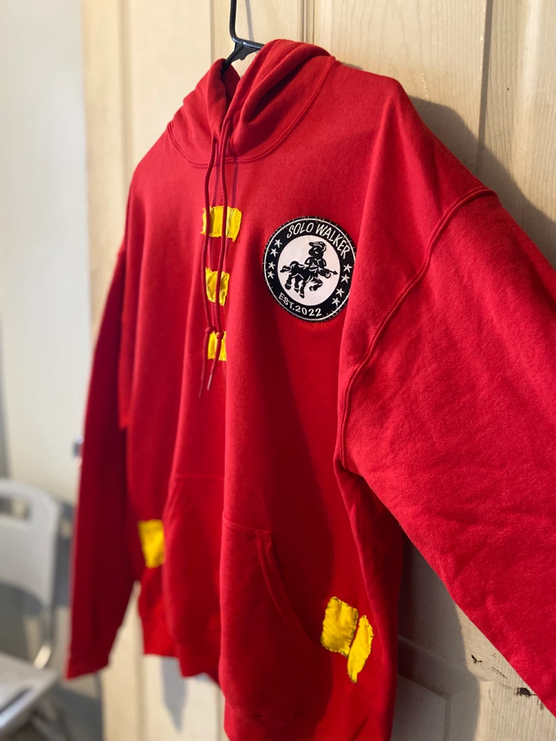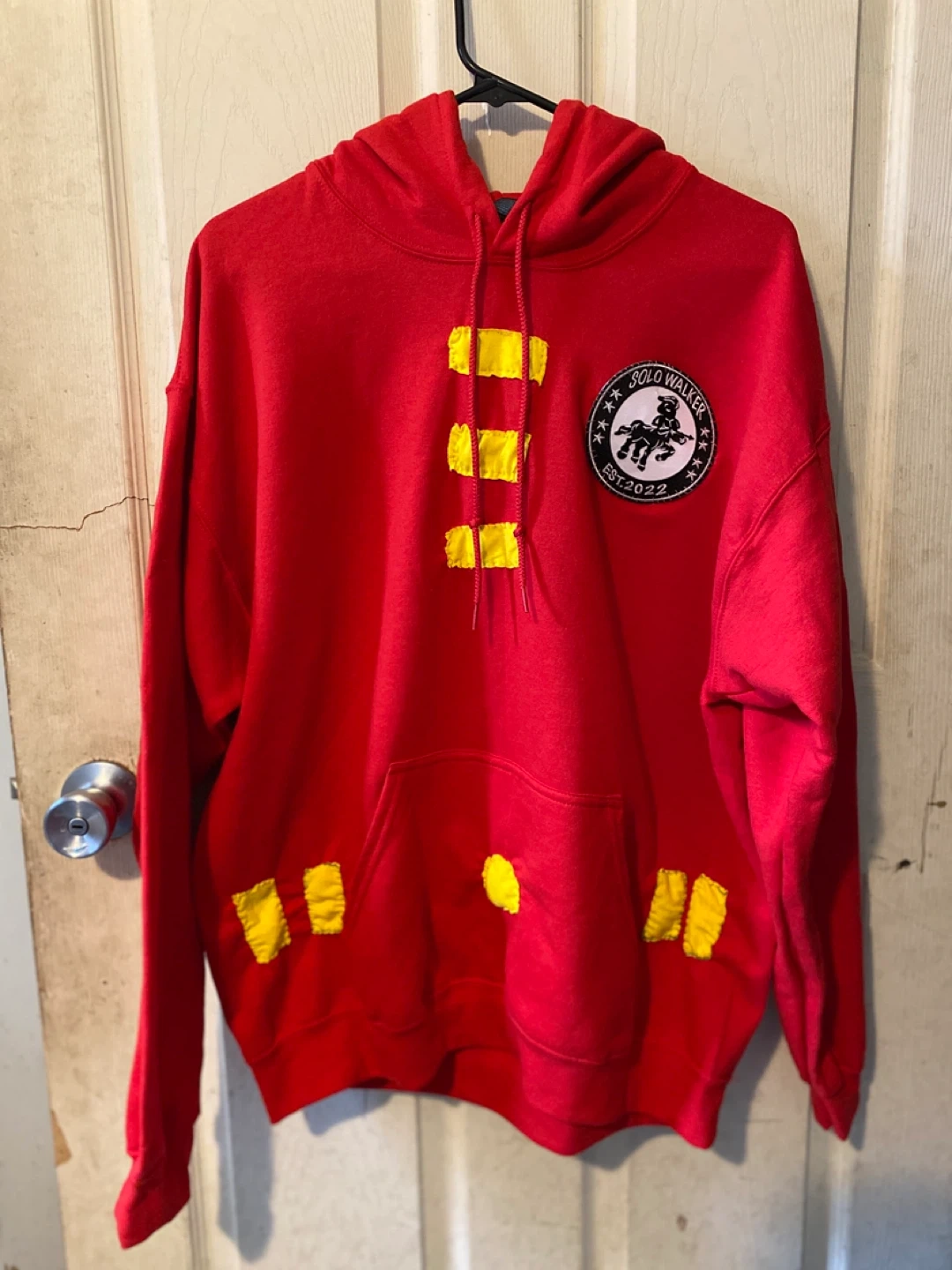 This red Solo Walker hoodie features a unique design with yellow accents. It's made for comfort and style. The brand logo is clearly visible on the chest.