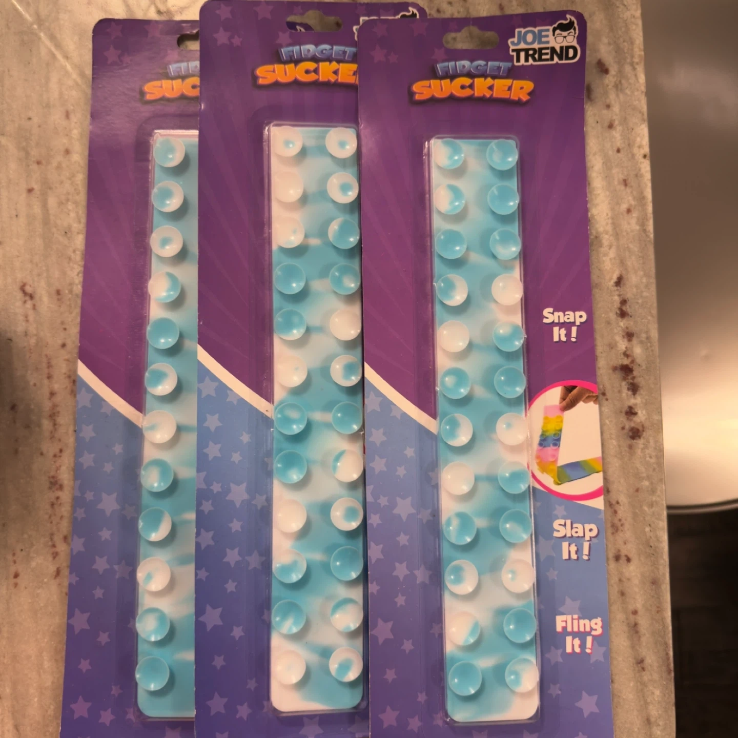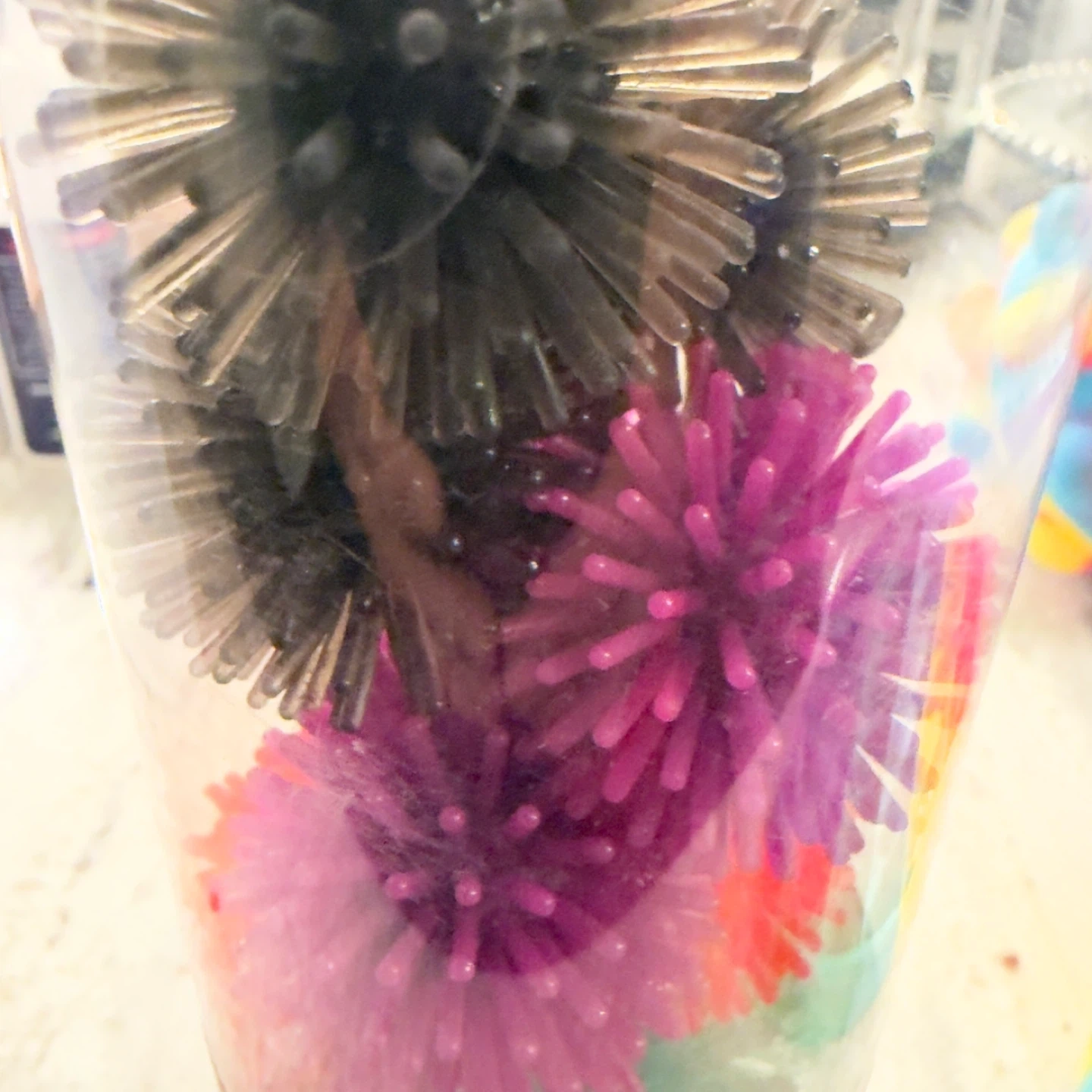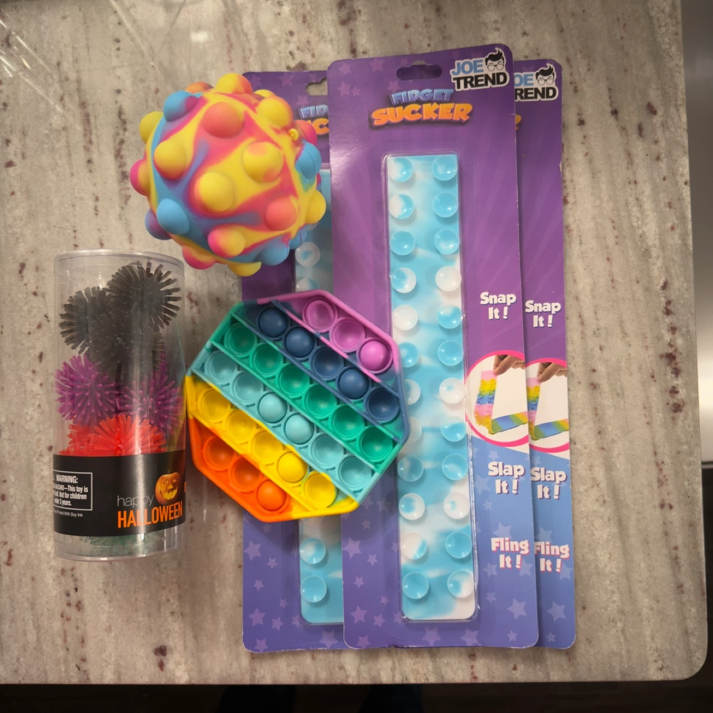 Selling a bundle of fidget toys! Includes a rainbow popper, a spiky ball, a tube of spiky balls, and three Fidget Suckers by Joe Trend. Great for stress relief and sensory play!
