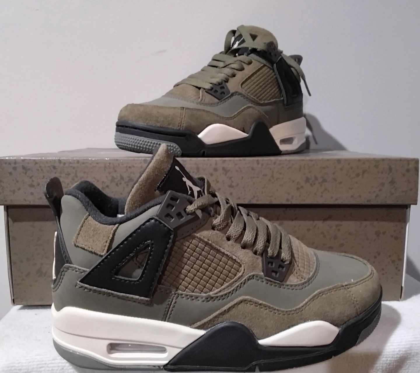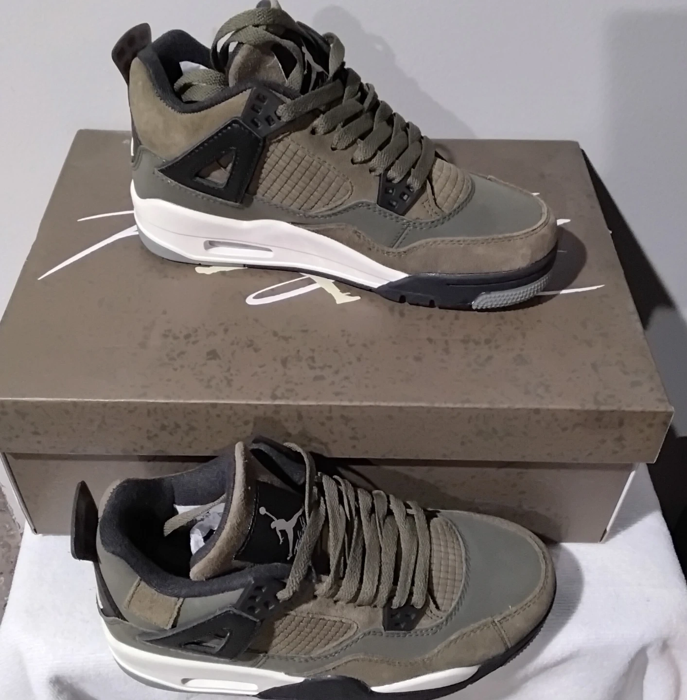 These Air Jordan 4s come in a "Shimmer" colorway, featuring a mix of olive and brown tones. Includes original box. Authentic Jordan product.