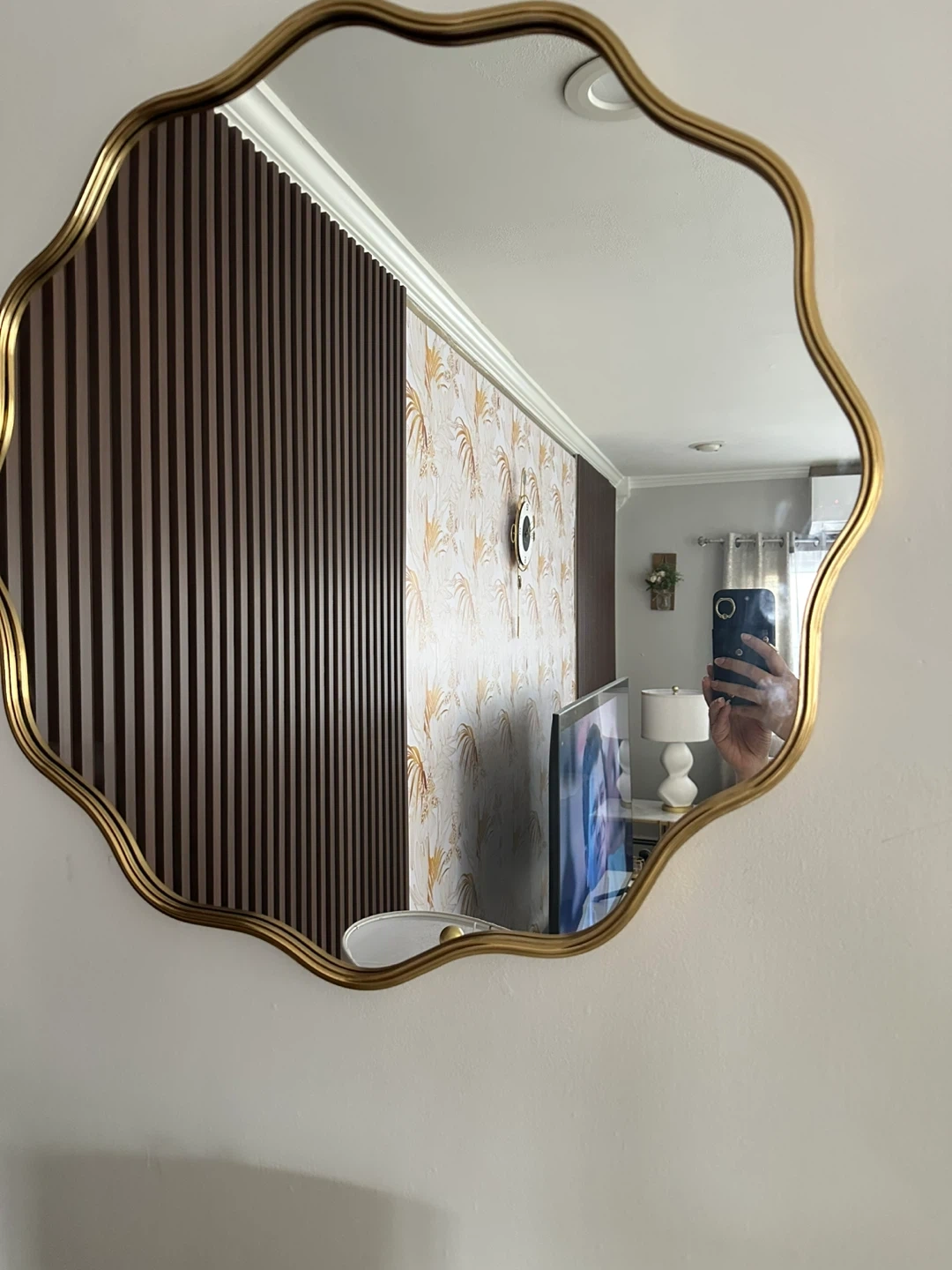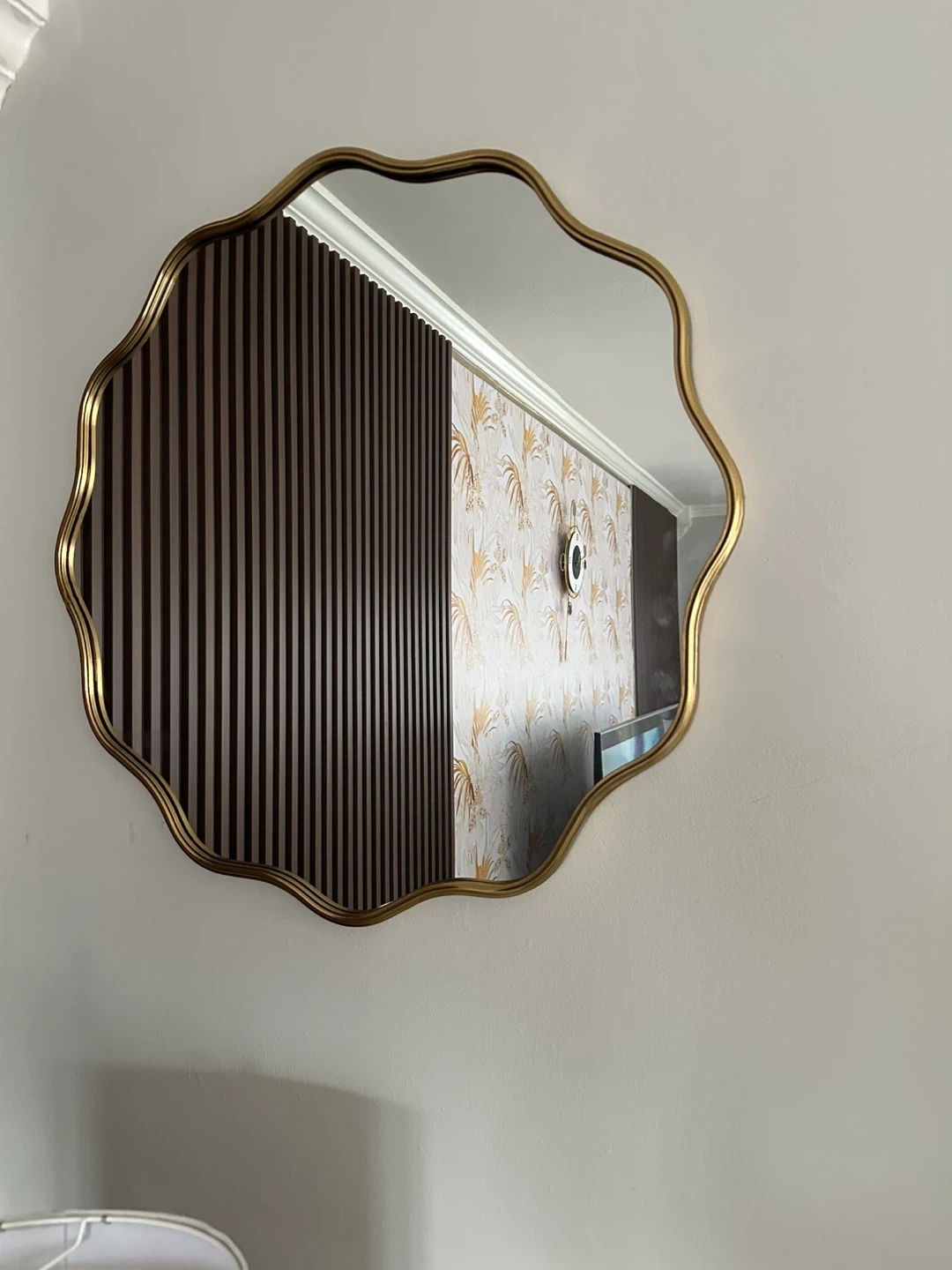 This decorative mirror features a unique wavy shape with a gold-toned frame. It's a stylish accent piece for any room. Frame material is metal.