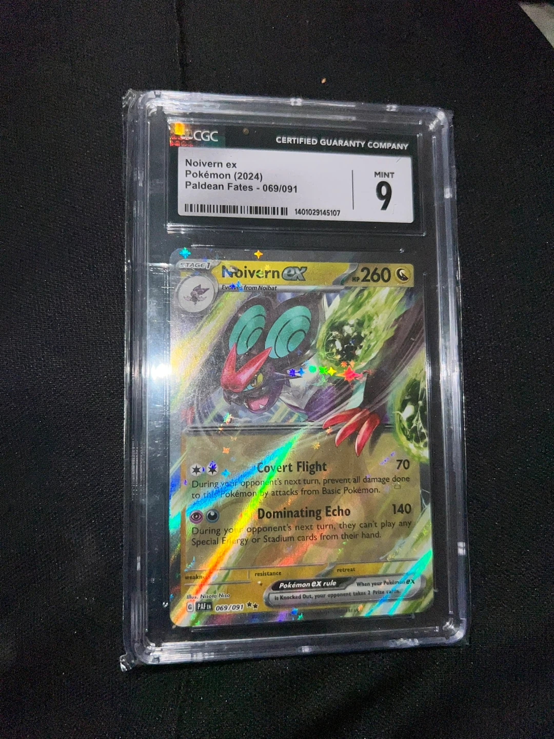 This is a Noivern ex trading card from the Paldean Fates set, released in 2024. It's graded MINT 9 by CGC. The card features abilities like Covert Flight and Dominating Echo.