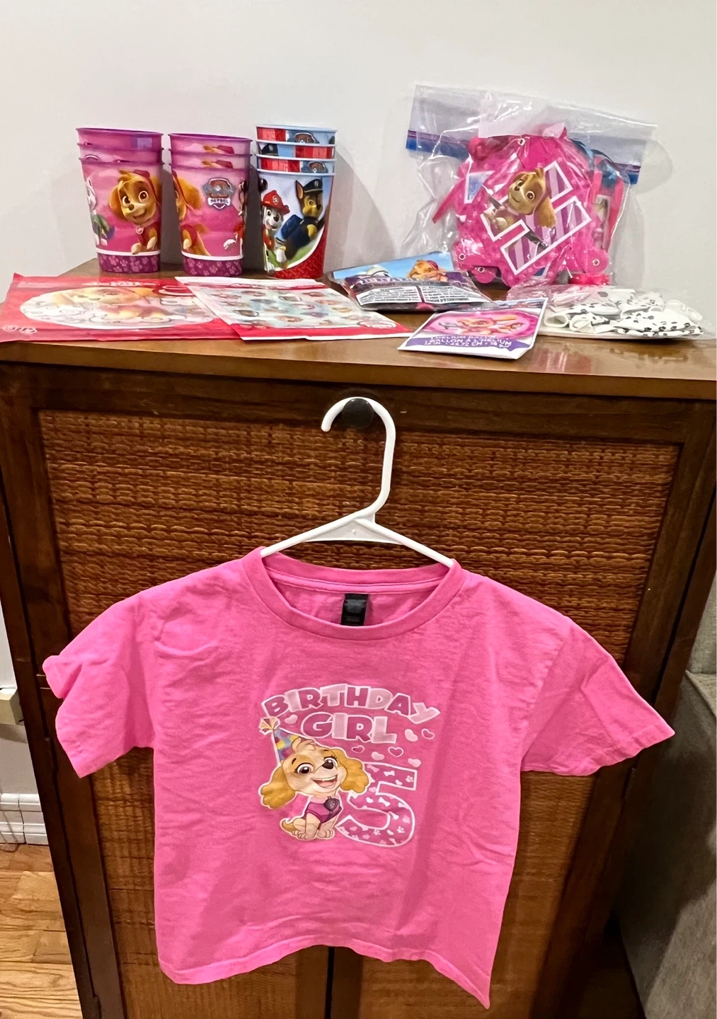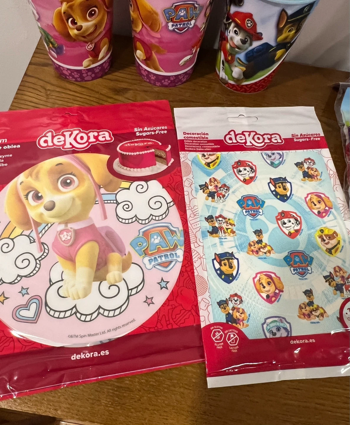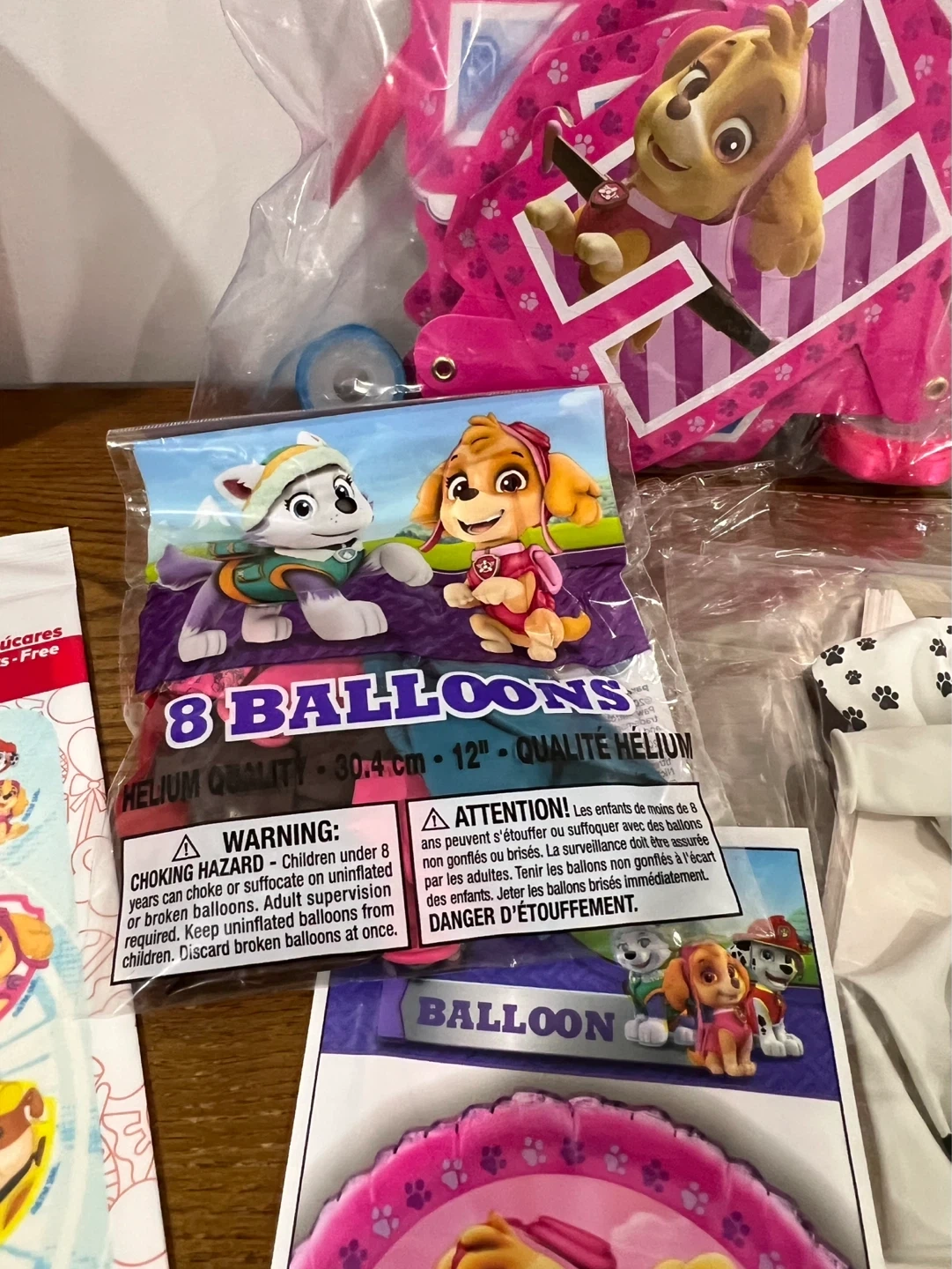 Paw Patrol themed birthday party supplies. Includes 8 helium quality balloons, cups, and cake decorations. Perfect for a Paw Patrol fan's celebration!