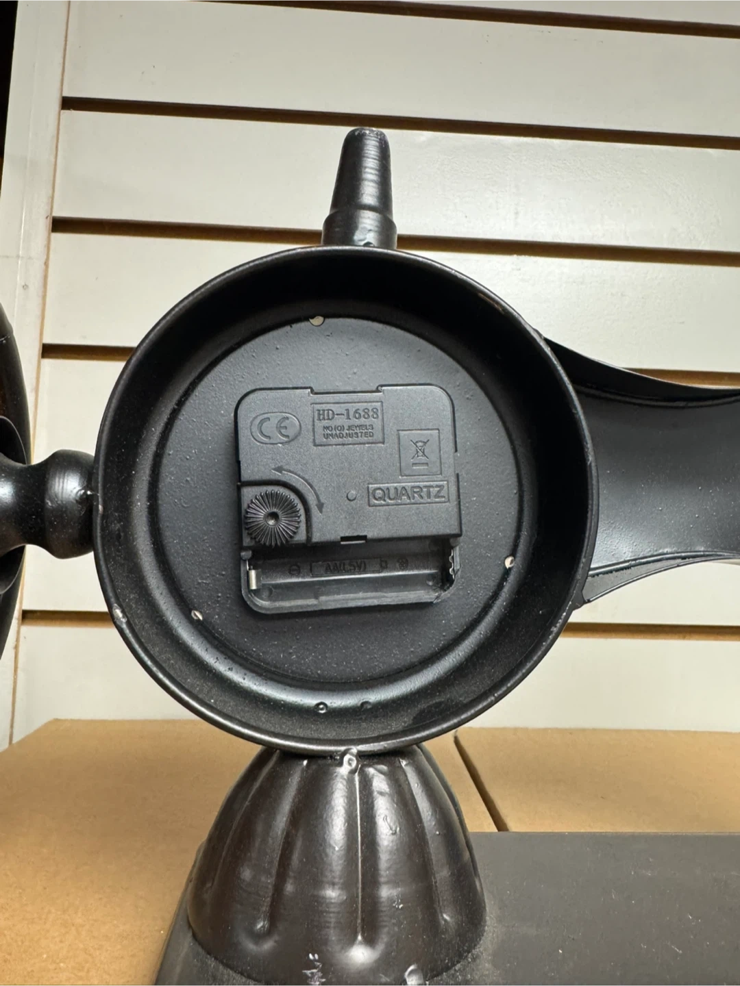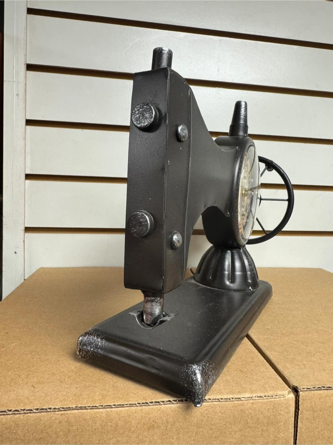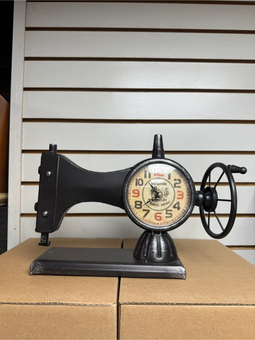This is a table clock shaped like a sewing machine. It's a unique decorative piece that adds a touch of nostalgia to any room. The clock face is easy to read, and the overall design is quite charming