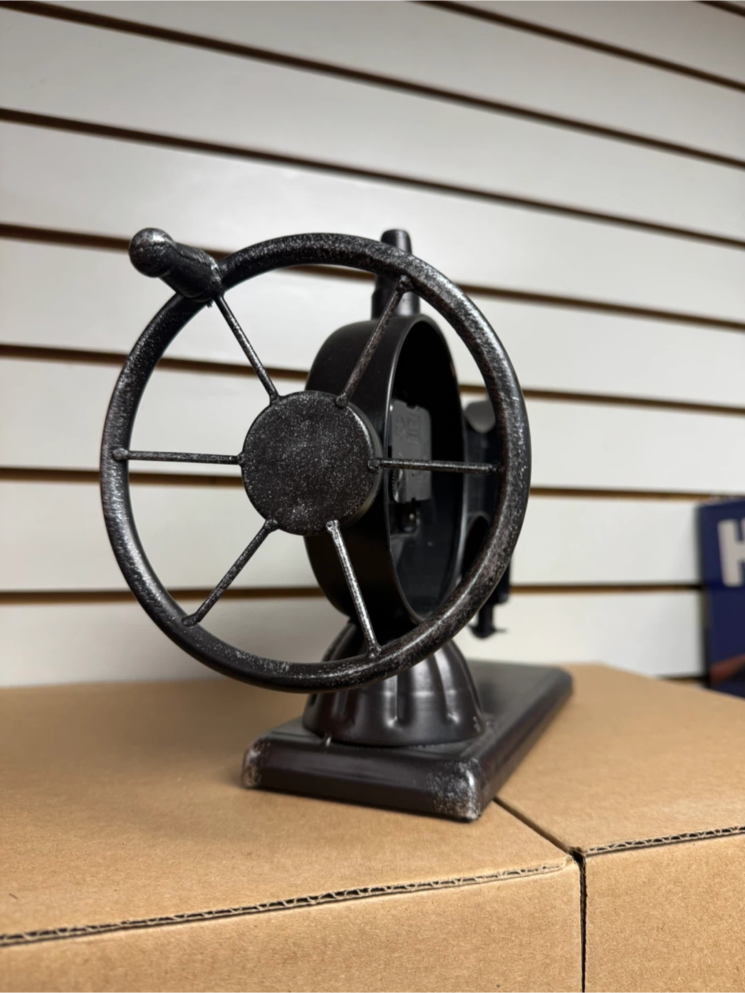 This is a table clock shaped like a sewing machine. It's a unique decorative piece that adds a touch of nostalgia to any room. The clock face is easy to read, and the overall design is quite charming