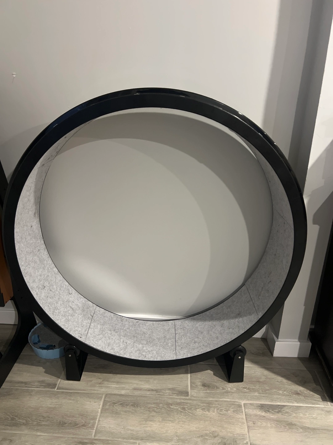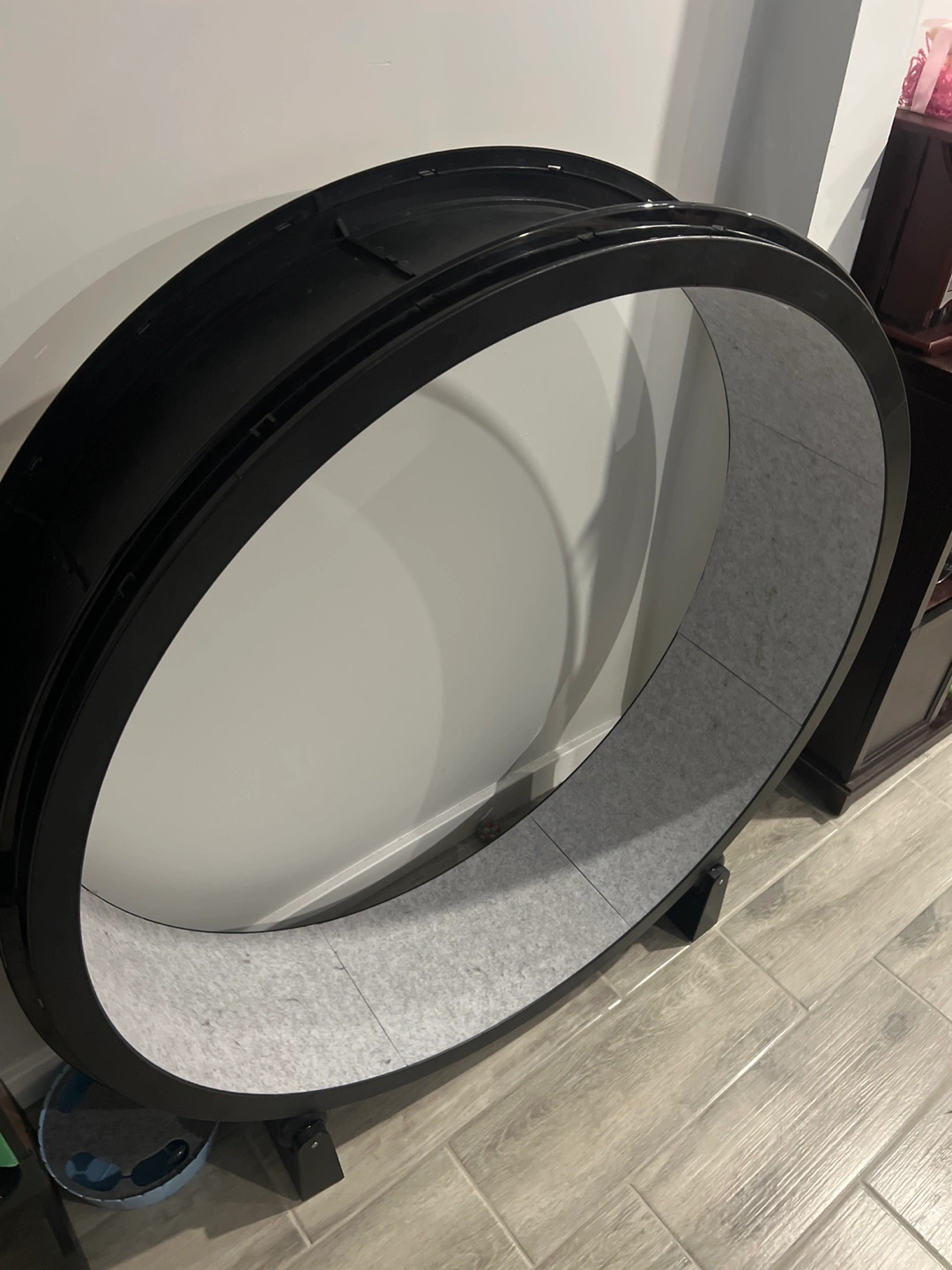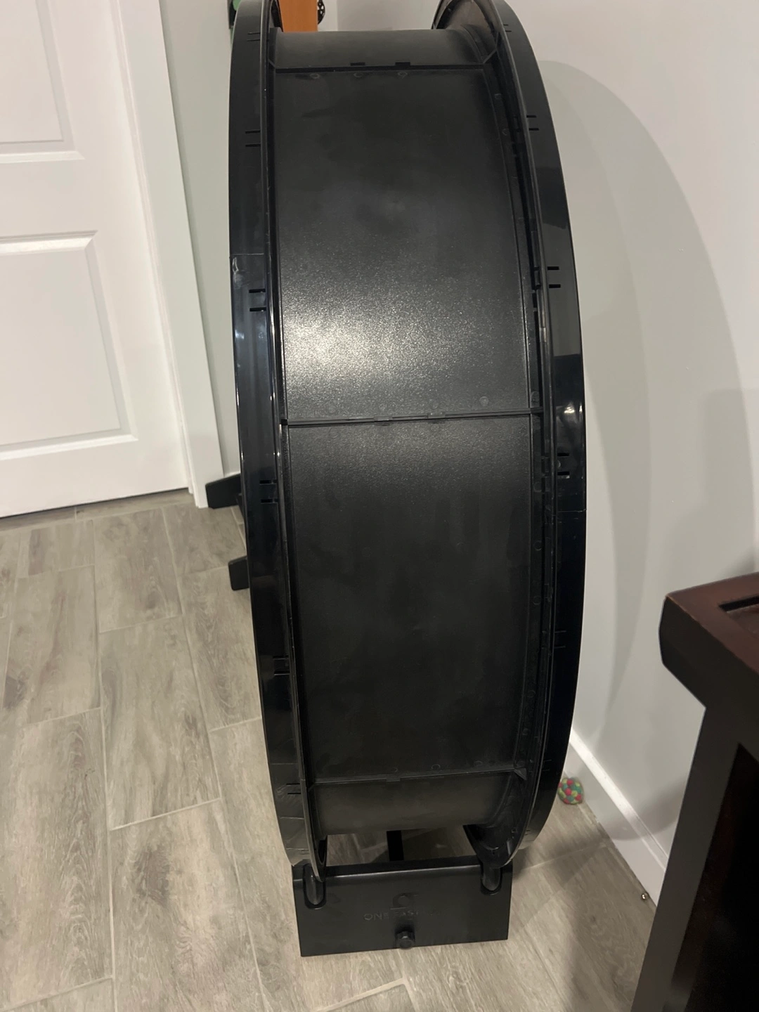 Selling a One Fast Cat exercise wheel in black. It's a great way for your cat to get some exercise and stay active indoors. The wheel is in good condition and ready for a new home!