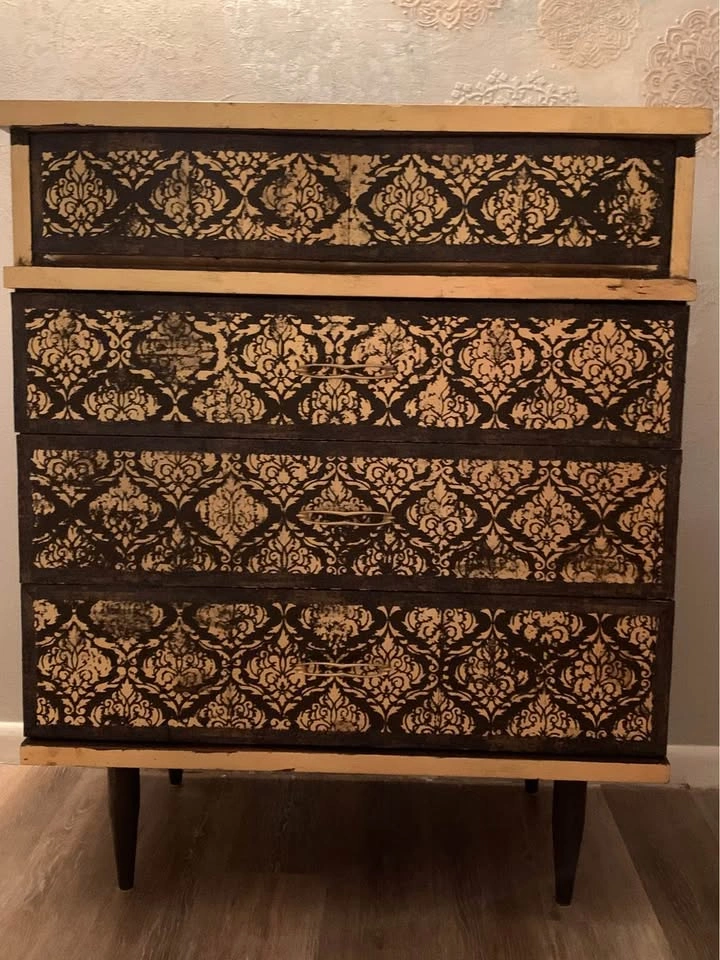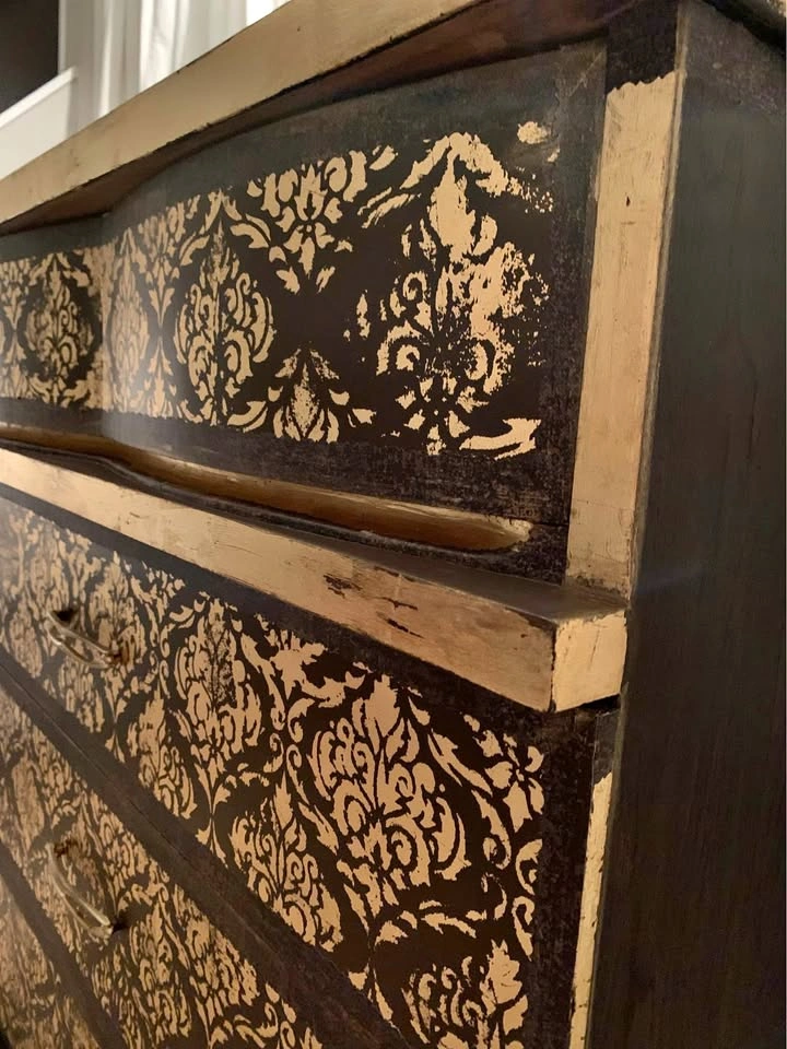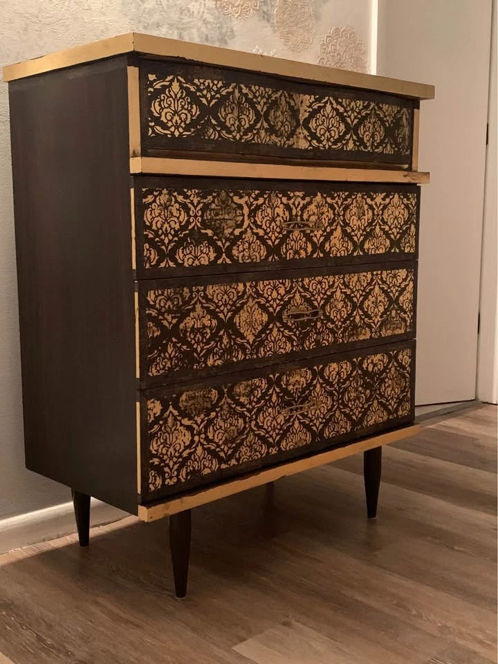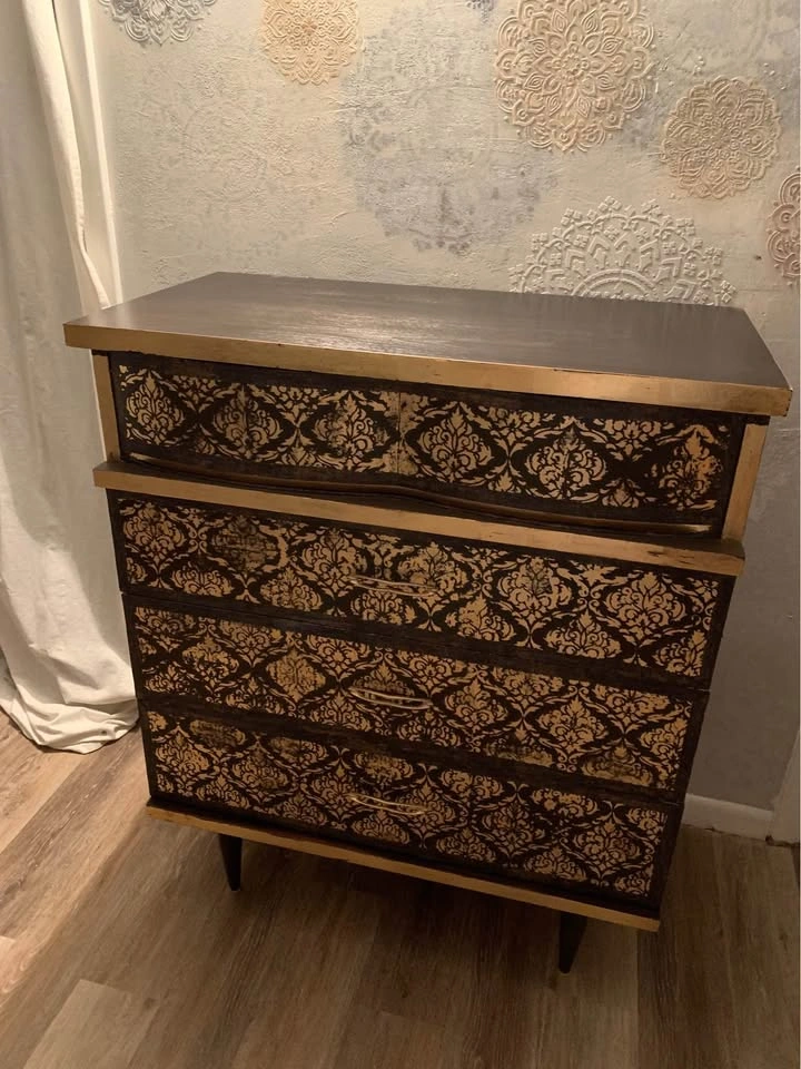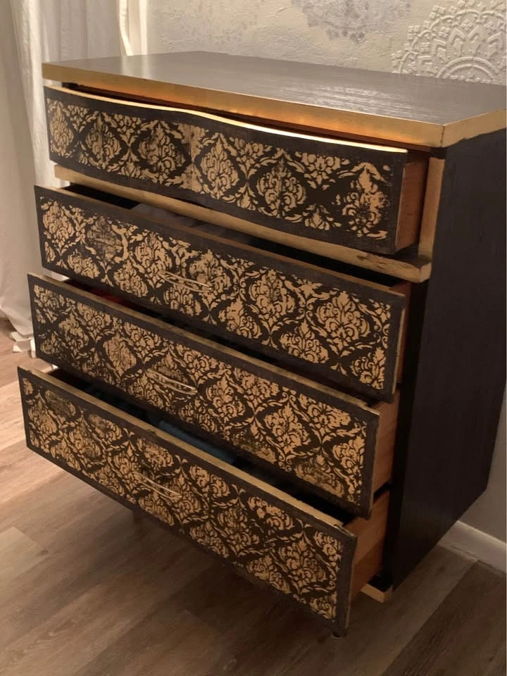 10Hand-finished espresso dresser with gold damask detailing. Rich espresso tones and subtle gold leaf stencil accents make this 4-drawer piece both classic and bold. Solid wood, smooth drawers, and sealed for durability — a perfect accent for bedroom, entryway, or living room. 42”H x 35”W x 18”D Cash and pick up only
