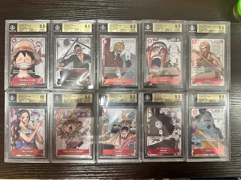 Not $1, Looking for offers. Monkey.D.Luffy - BGS 9.5 Roronoa Zoa - BGS 9.5 Sanji - BGS 9.5 Usopp - BGS 9.5 Nami - BGS 9.5 Nico Robin - BGS 10 Tony Tony.Chopper - BGS 9.5 Franky - BGS 9.5 Brook - BGS 9.5 Jinbe - BGS 9.5
