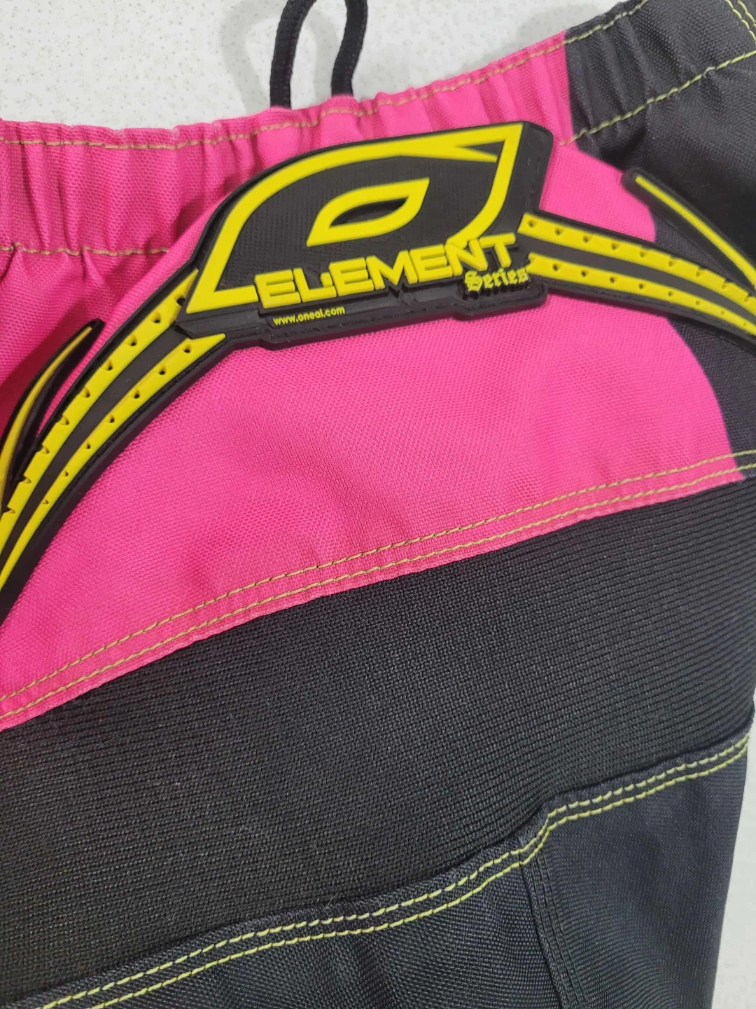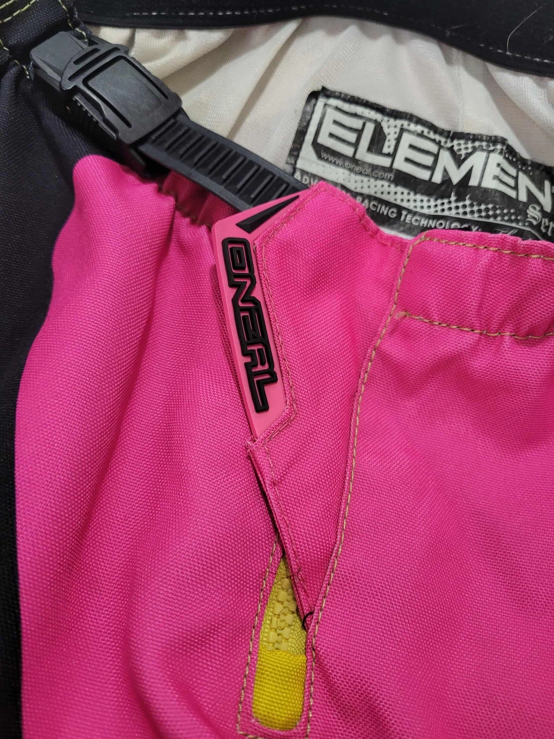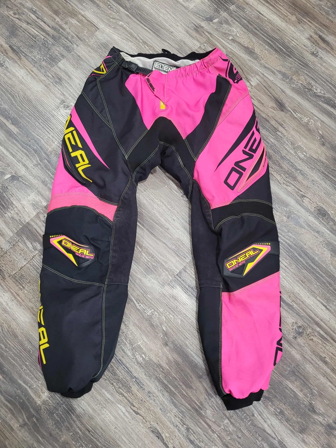 81Selling a pair of O'Neal Element Series pants for women. They're a size 9/10 and feature a vibrant pink and black color scheme. The shell fabric is made of 94% polyester and 6% rubber, with a 100% polyester lining. Perfect for anyone looking for durable and stylish riding gear!