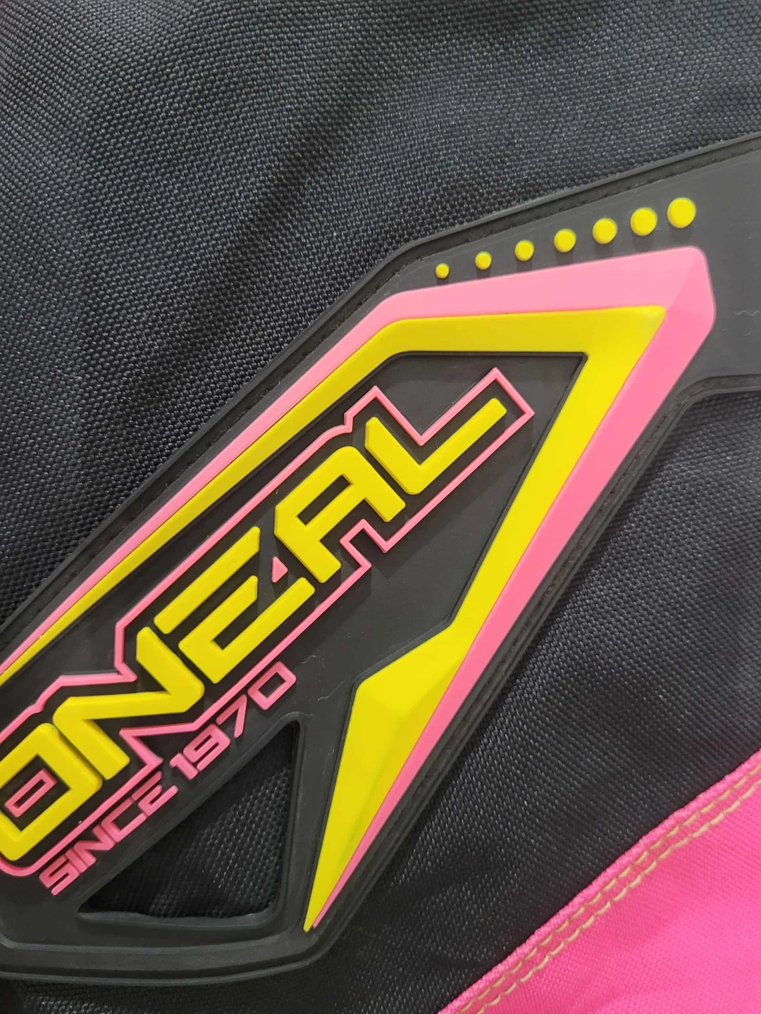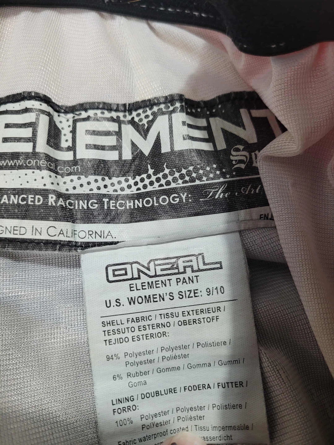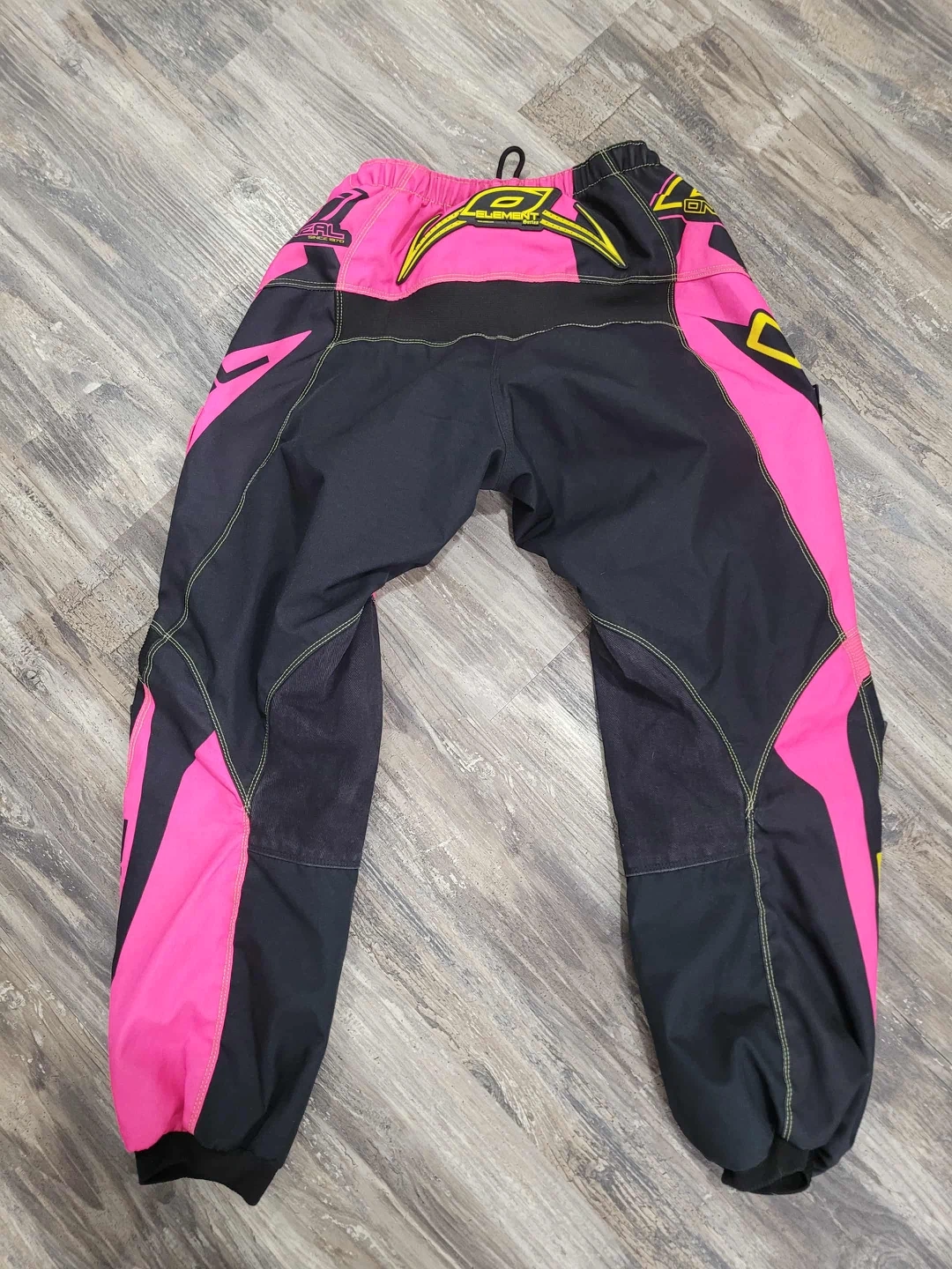81Selling a pair of O'Neal Element Series pants for women. They're a size 9/10 and feature a vibrant pink and black color scheme. The shell fabric is made of 94% polyester and 6% rubber, with a 100% polyester lining. Perfect for anyone looking for durable and stylish riding gear!