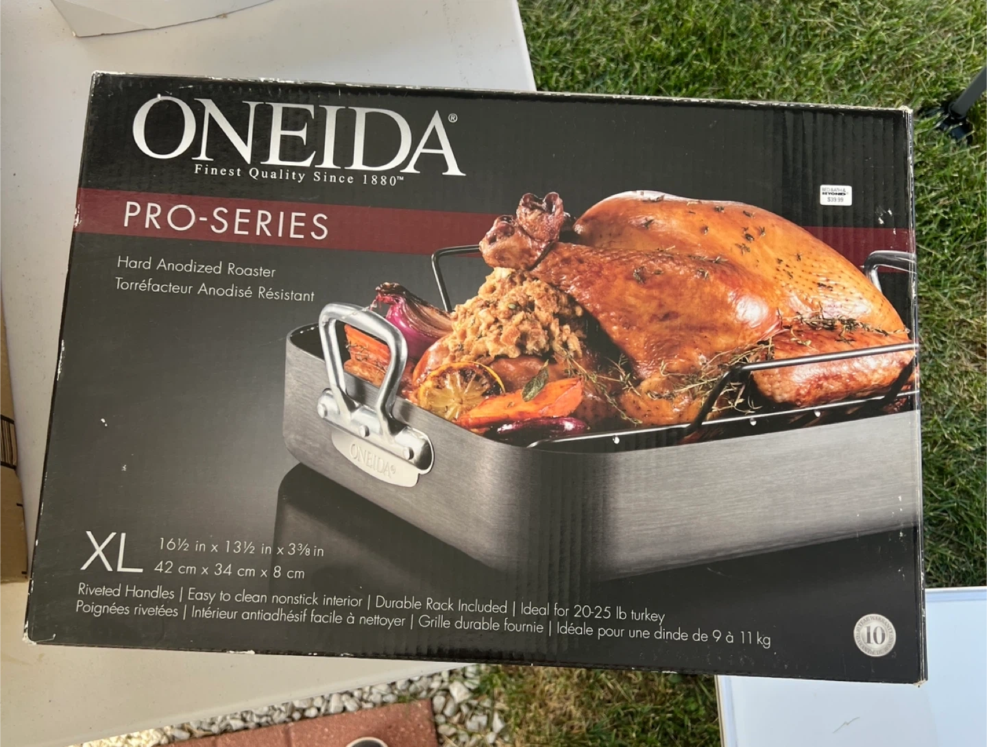 18Selling an Oneida Pro-Series hard anodized roaster in XL size! This roaster is perfect for cooking a 20-25 lb turkey. It features riveted handles and an easy-to-clean nonstick interior. Durable rack included. Dimensions are 16 1/2 in x 13 1/2 in x 3 3/8 in (42 cm x 34 cm x 8 cm). Originally bought for $39.99 Brand new still in box.